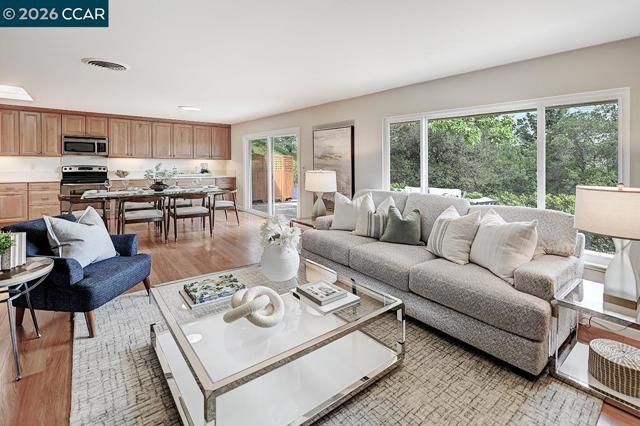 Impressive Single Story, Easy Access Santa Clara model in superior location with a beautiful view of the distance hills and Mt. Diablo beyond. Kitchen has been remodeled providing that highly coveted open concept design with very warm and rich quality features. Large, tiled patio will enhance your indoor~outdoor living lifestyle which will quickly become your favorite place to relax and enjoy with family and friends. The fine features that this home offers are endless with rich hard surface flooring, illuminating skylights, resort inspired updated bathrooms, modernized lighting, dual pane windows, custom window covers, new paint, beaming hard surface flooring, new plush carpet, illuminating skylights, newer HVAC system. Absolutely pristine condition! Lives like a single family home.