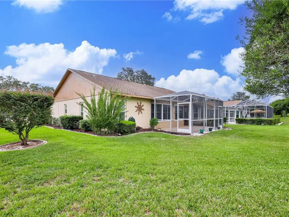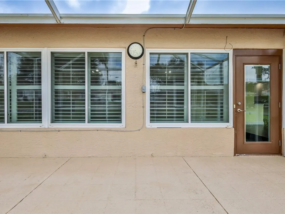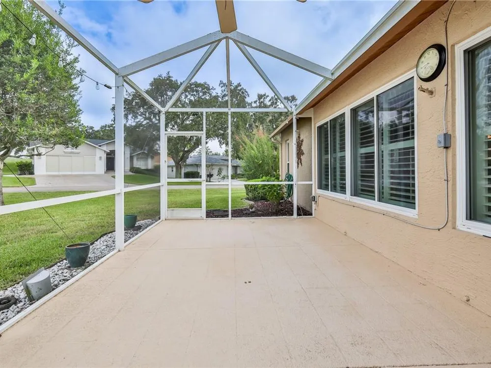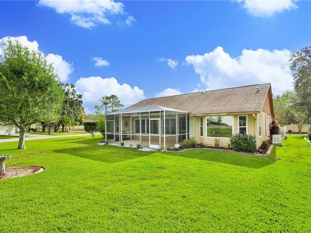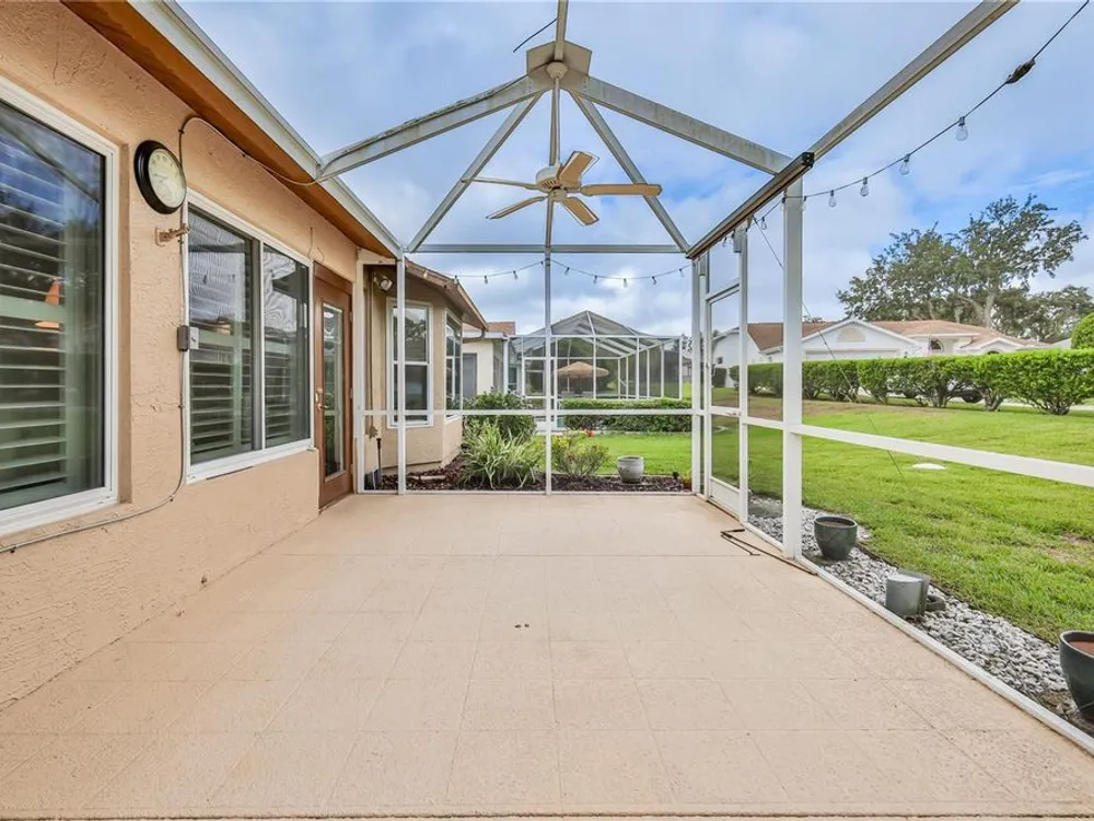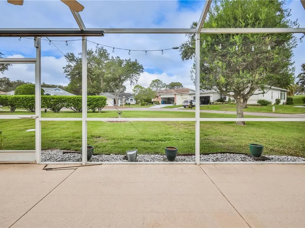 Welcome to this beautifully maintained 3-bedroom, 2-bathroom Tamarack floor plan home with a 2-car garage, perfectly situated on a desirable corner lot. From the moment you step inside, you'll appreciate the bright, open, and airy feel with high ceilings, crown molding, and gorgeous laminate wood flooring throughout the main living areas. The living room features a solar tube for natural light and ceiling fan for comfort, while the updated kitchen shines with granite countertops, ample cabinet space, and a sunny dining nook overlooking a peaceful garden. The Florida room is enclosed and accented with plantation shutters, an electric fireplace, and ceiling fans, offering the perfect spot to relax or entertain. Just beyond, enjoy the screened lanai with ceiling fan for year-round outdoor living. The split-bedroom layout ensures privacy for everyone. The spacious primary suite includes two large closets, plantation shutters, sliding glass doors to the Florida room, and access to a Jack and Jill-style bathroom featuring updated cabinetry, a newer toilet, shower, and ceiling fan. The second bedroom includes an extra-large walk-in closet. The third bedroom is steps from the guest bathroom and features an updated vanity with granite countertop. Practicality meets comfort in the laundry room, complete with solar tube, closet, and cabinetry, while the garage includes a workbench and dual exterior access doors for convenience. And there's more — this home is loaded with valuable upgrades! Whole-house generator powered by LP gas for peace of mind. Well-fed irrigation system to keep your lawn lush and your water bill low. New windows (2008) for energy efficiency. Roof replaced in 2016. HVAC system replaced in 2020. Timber Pines is an award winning, guard-gated, 55+, deed-restricted community offering a resort-style lifestyle: three 18-hole golf courses, a 9-hole pitch & putt, tennis, 12 pickleball courts, two community swimming pools, country club restaurant and bar, fitness center, billiards, performing arts, woodworking and over 100 social clubs and activities. This home blends comfort, style, and function in every detail — all set in a beautifully maintained community.