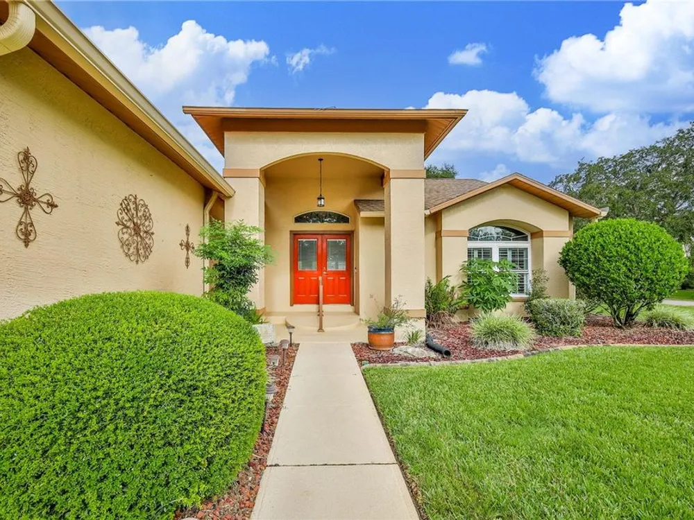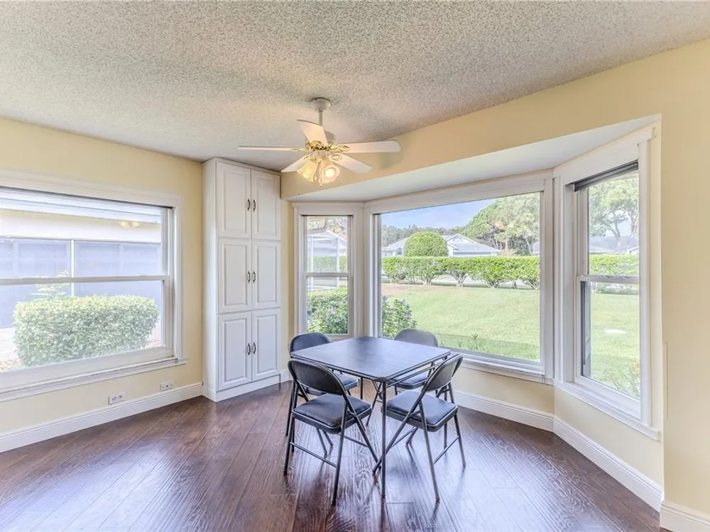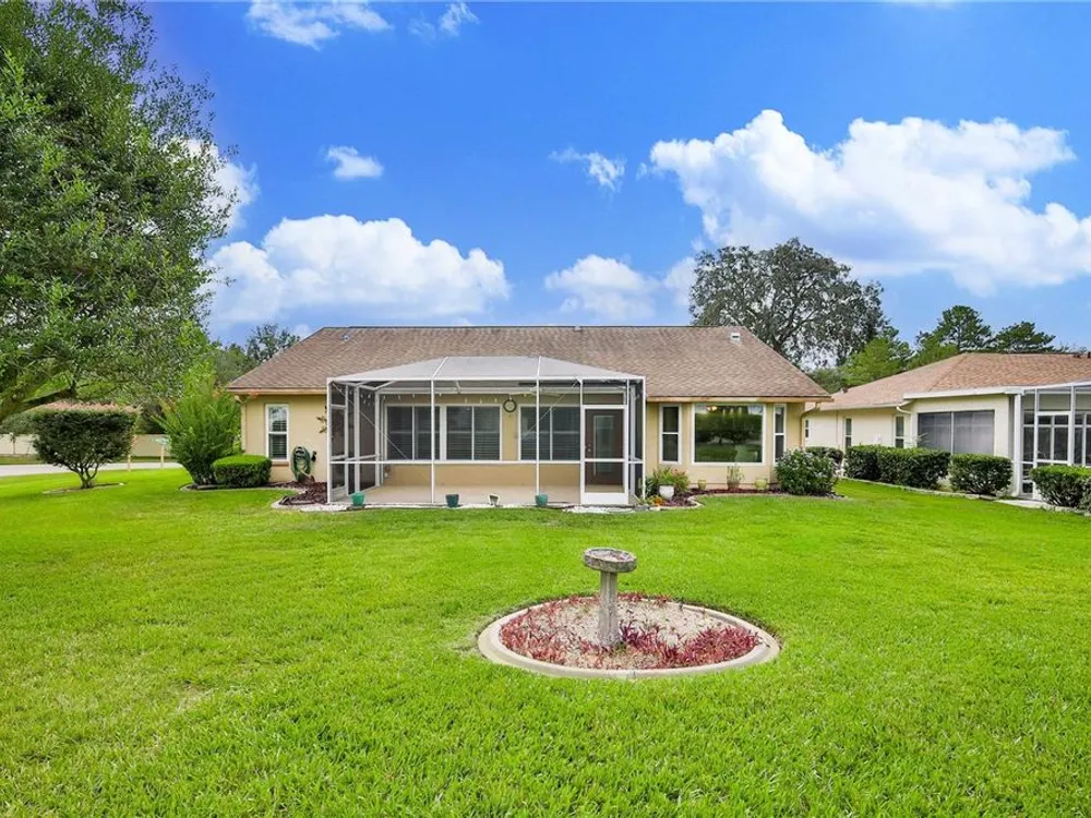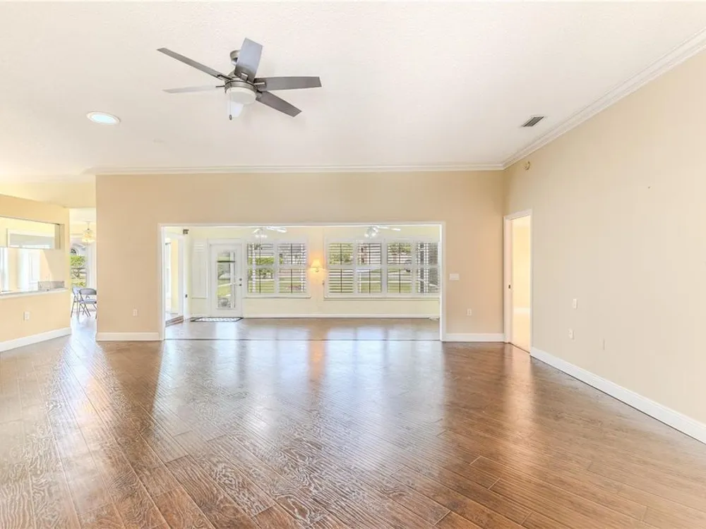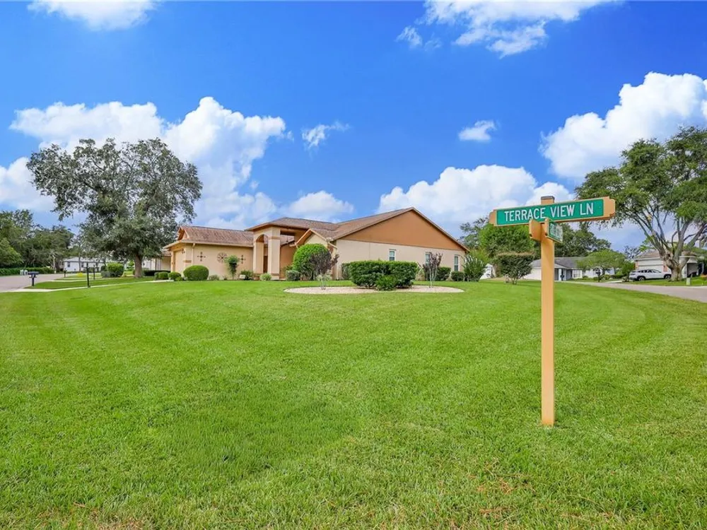 Welcome to this beautifully maintained 3-bedroom, 2-bathroom Tamarack floor plan home with a 2-car garage, perfectly situated on a desirable corner lot. From the moment you step inside, you'll appreciate the bright, open, and airy feel with high ceilings, crown molding, and gorgeous laminate wood flooring throughout the main living areas. The living room features a solar tube for natural light and ceiling fan for comfort, while the updated kitchen shines with granite countertops, ample cabinet space, and a sunny dining nook overlooking a peaceful garden. The Florida room is enclosed and accented with plantation shutters, an electric fireplace, and ceiling fans, offering the perfect spot to relax or entertain. Just beyond, enjoy the screened lanai with ceiling fan for year-round outdoor living. The split-bedroom layout ensures privacy for everyone. The spacious primary suite includes two large closets, plantation shutters, sliding glass doors to the Florida room, and access to a Jack and Jill-style bathroom featuring updated cabinetry, a newer toilet, shower, and ceiling fan. The second bedroom includes an extra-large walk-in closet. The third bedroom is steps from the guest bathroom and features an updated vanity with granite countertop. Practicality meets comfort in the laundry room, complete with solar tube, closet, and cabinetry, while the garage includes a workbench and dual exterior access doors for convenience. And there's more — this home is loaded with valuable upgrades! Whole-house generator powered by LP gas for peace of mind. Well-fed irrigation system to keep your lawn lush and your water bill low. New windows (2008) for energy efficiency. Roof replaced in 2016. HVAC system replaced in 2020. Timber Pines is an award winning, guard-gated, 55+, deed-restricted community offering a resort-style lifestyle: three 18-hole golf courses, a 9-hole pitch & putt, tennis, 12 pickleball courts, two community swimming pools, country club restaurant and bar, fitness center, billiards, performing arts, woodworking and over 100 social clubs and activities. This home blends comfort, style, and function in every detail — all set in a beautifully maintained community.