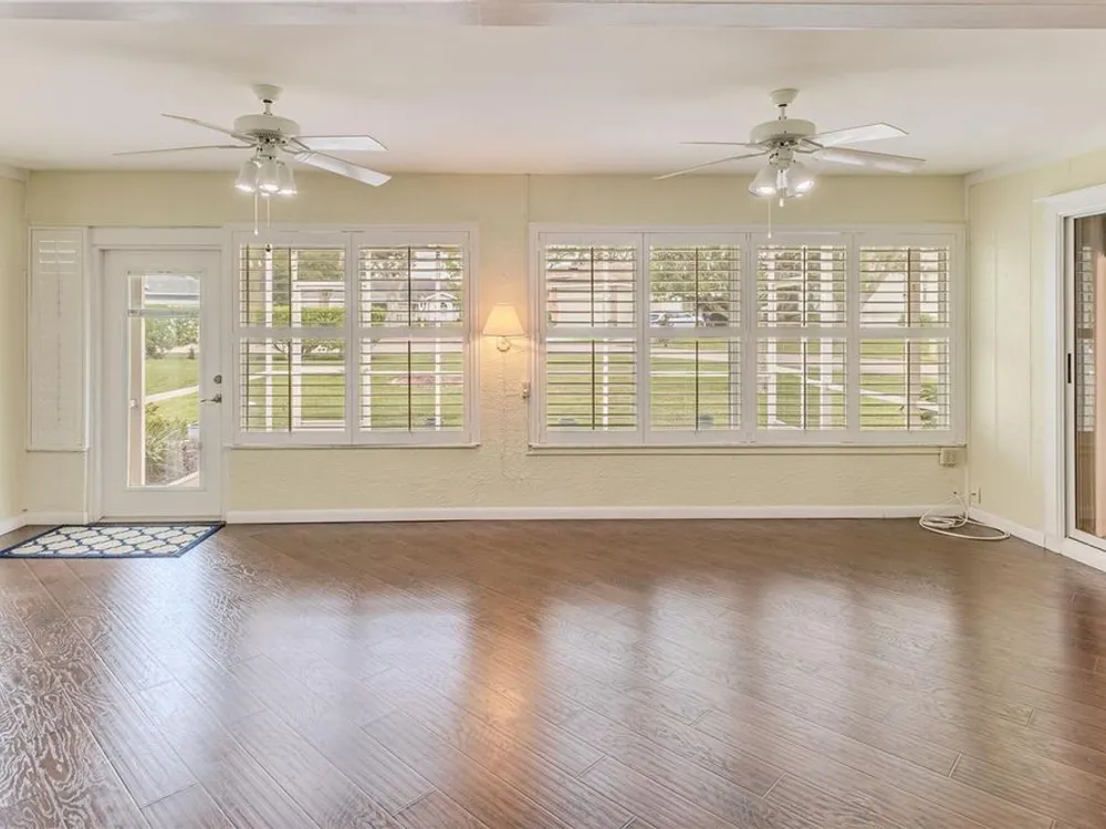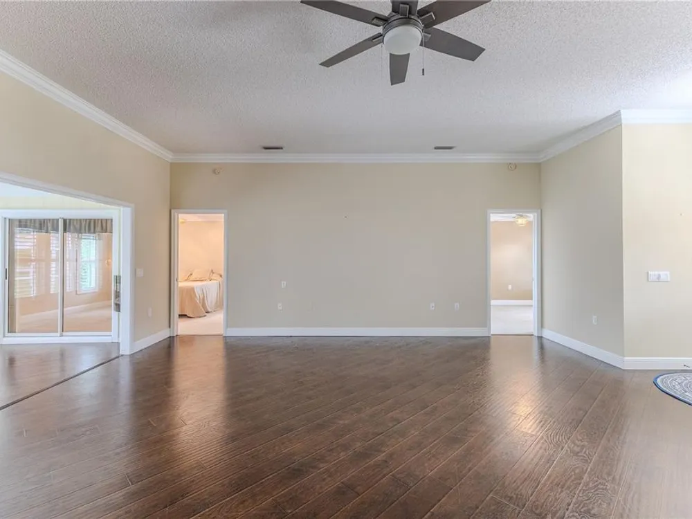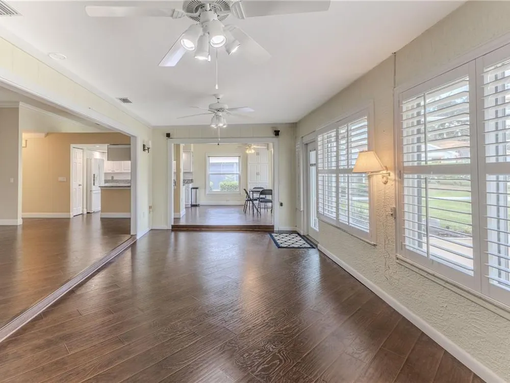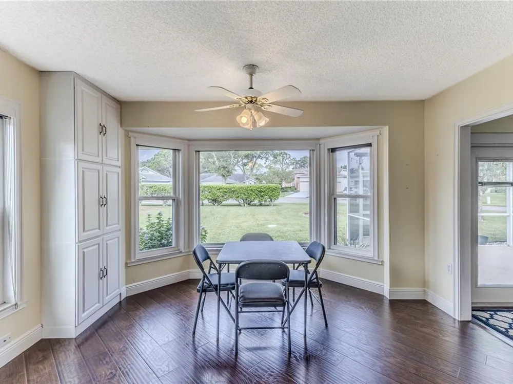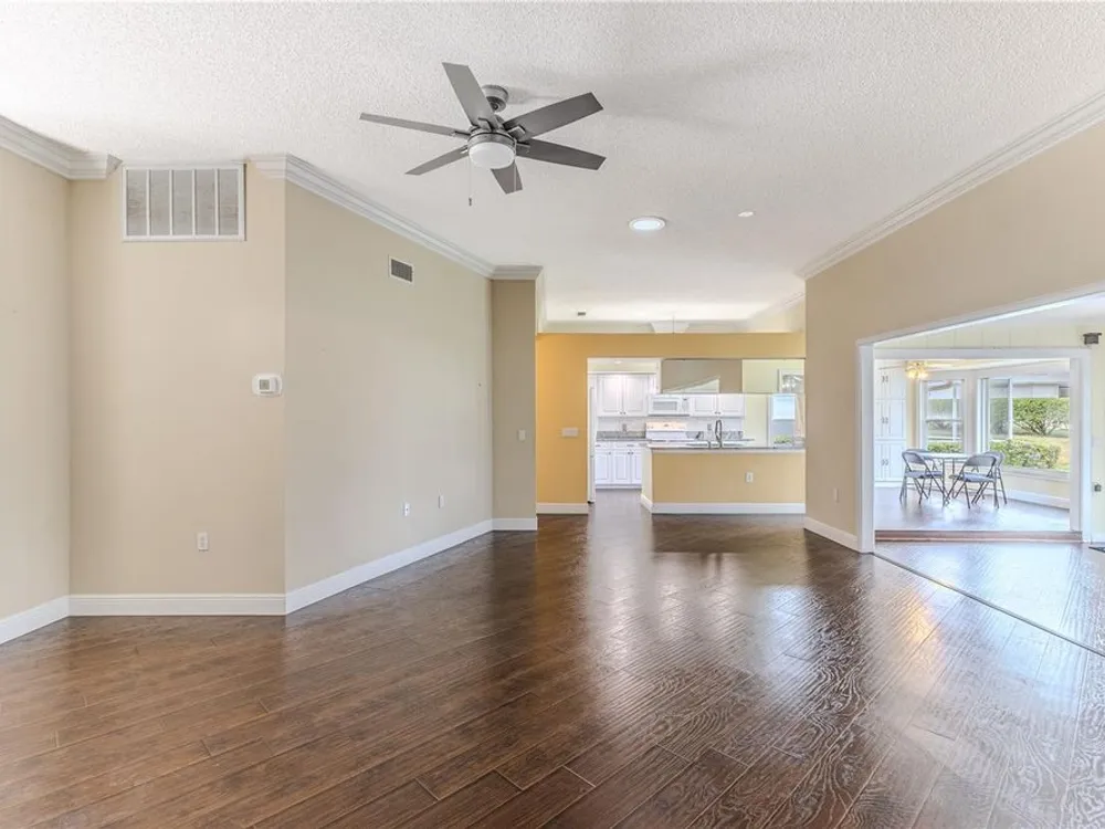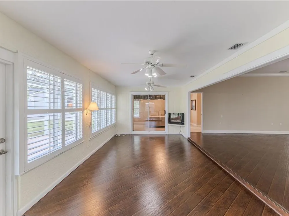 Welcome to this beautifully maintained 3-bedroom, 2-bathroom Tamarack floor plan home with a 2-car garage, perfectly situated on a desirable corner lot. From the moment you step inside, you'll appreciate the bright, open, and airy feel with high ceilings, crown molding, and gorgeous laminate wood flooring throughout the main living areas. The living room features a solar tube for natural light and ceiling fan for comfort, while the updated kitchen shines with granite countertops, ample cabinet space, and a sunny dining nook overlooking a peaceful garden. The Florida room is enclosed and accented with plantation shutters, an electric fireplace, and ceiling fans, offering the perfect spot to relax or entertain. Just beyond, enjoy the screened lanai with ceiling fan for year-round outdoor living. The split-bedroom layout ensures privacy for everyone. The spacious primary suite includes two large closets, plantation shutters, sliding glass doors to the Florida room, and access to a Jack and Jill-style bathroom featuring updated cabinetry, a newer toilet, shower, and ceiling fan. The second bedroom includes an extra-large walk-in closet. The third bedroom is steps from the guest bathroom and features an updated vanity with granite countertop. Practicality meets comfort in the laundry room, complete with solar tube, closet, and cabinetry, while the garage includes a workbench and dual exterior access doors for convenience. And there's more — this home is loaded with valuable upgrades! Whole-house generator powered by LP gas for peace of mind. Well-fed irrigation system to keep your lawn lush and your water bill low. New windows (2008) for energy efficiency. Roof replaced in 2016. HVAC system replaced in 2020. Timber Pines is an award winning, guard-gated, 55+, deed-restricted community offering a resort-style lifestyle: three 18-hole golf courses, a 9-hole pitch & putt, tennis, 12 pickleball courts, two community swimming pools, country club restaurant and bar, fitness center, billiards, performing arts, woodworking and over 100 social clubs and activities. This home blends comfort, style, and function in every detail — all set in a beautifully maintained community.