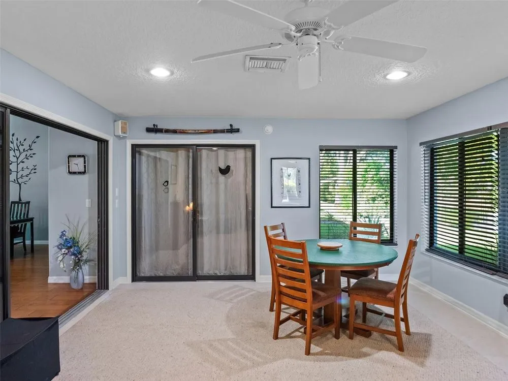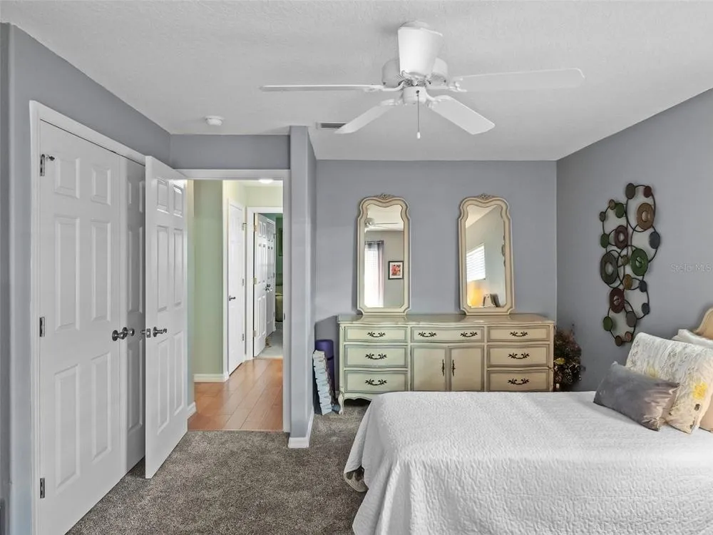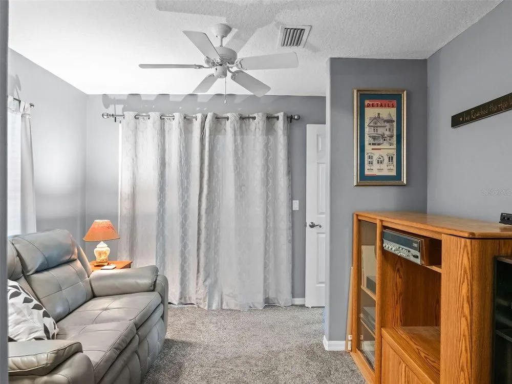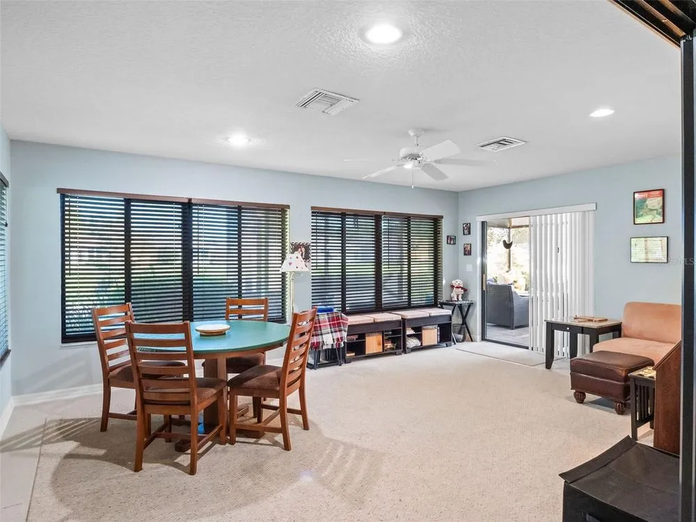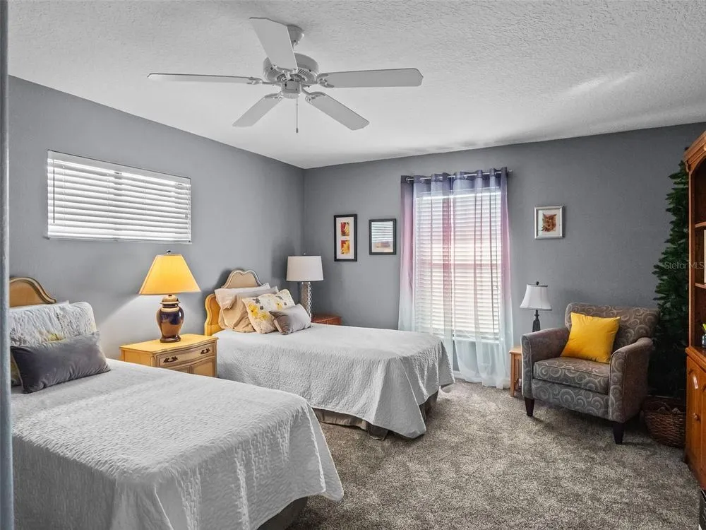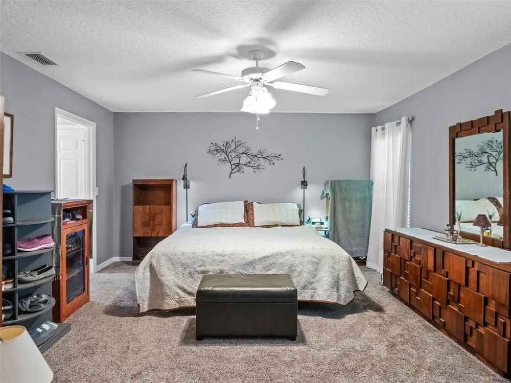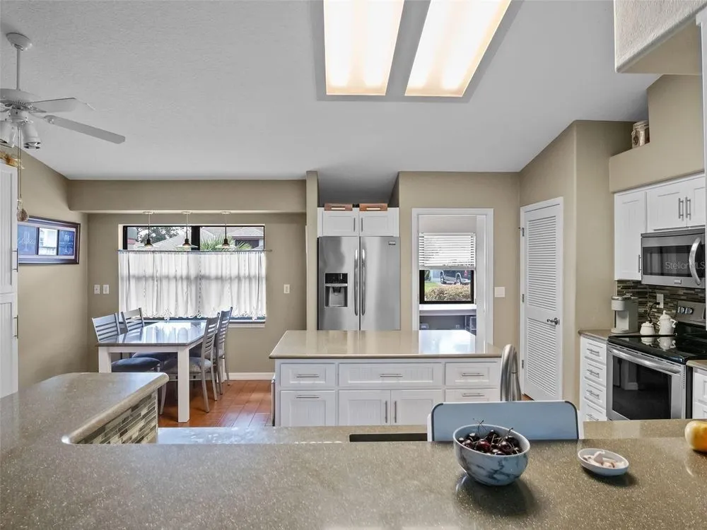 - Ceiling Fan(s), Central Vacuum, Eat-in Kitchen, High Ceilings, Living/Dining Room, Open Floorplan, Main Level Primary, Solid Surface Counters, Solid-Wood Cabinets, Split Bedrooms, Walk-In Closet(s), Window Treatments