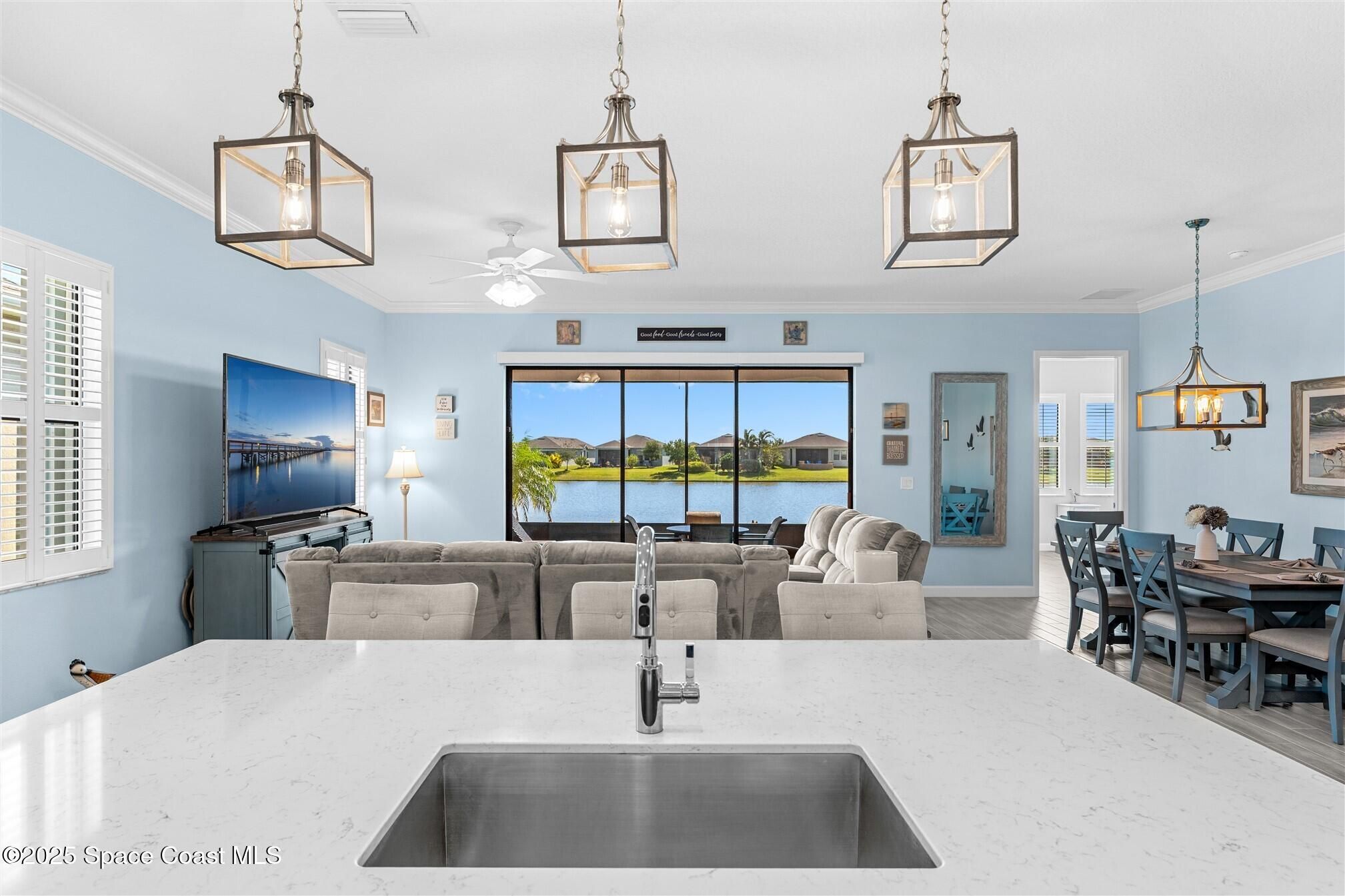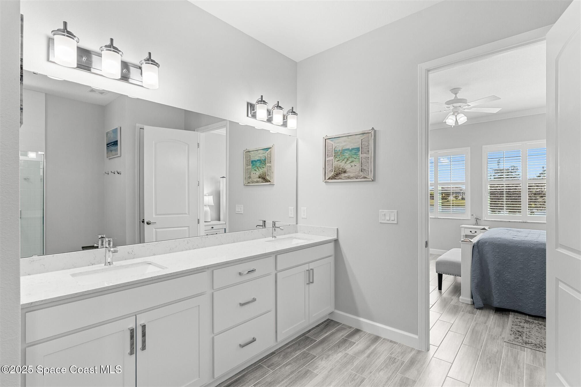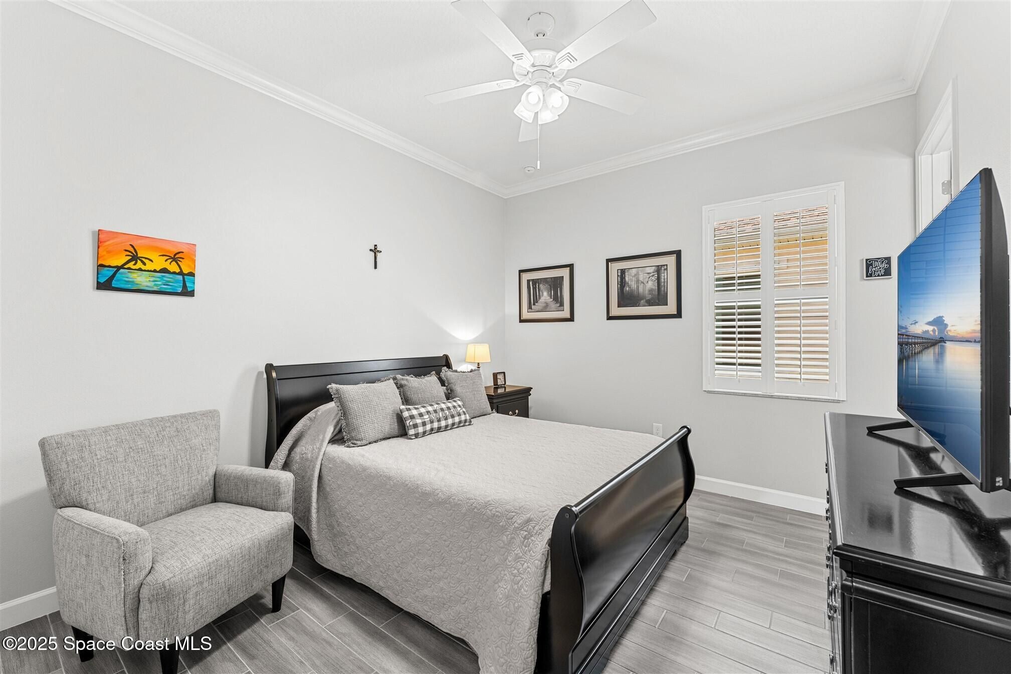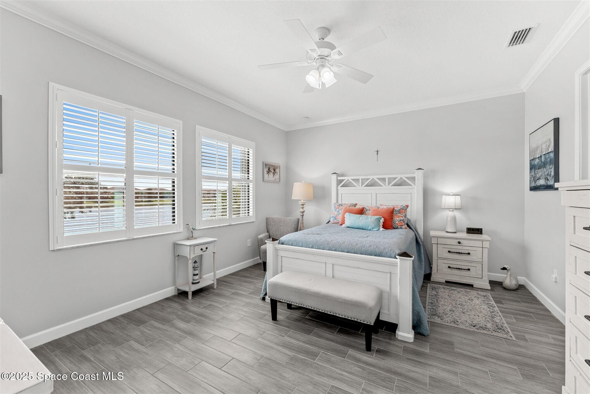 Pristine 3 bedroom plus study, 3 ½ bath home in Bridgewater, Viera's popular 55+ resort style community! Move in ready with every upgrade: new porcelain tile plank floors throughout, crown molding, plantation shutters, screened in lanai, 8' doors, epoxy garage floors and more! Perfect for guests, every bedroom is an ensuite with its own bath! Large three panel sliders in great room bring the beautiful lake views into your home and set it apart from similar key largo style homes! The outside is as meticulous as the interior with stone trim enhancing the freshly painted exterior. As you approach the home, you will notice the stone landscape beds and impact glass etched front door. Accordion shutters are on all windows and sliders and a transformer switch for a future generator add to your peace of mind. The private clubhouse offers a large heated pool and spa, fitness center, tennis & pickleball courts and a movie theater! Short drive to ocean beaches, cruise ships, shopping, dining!