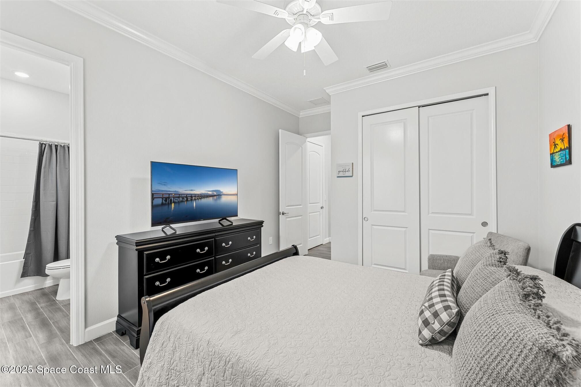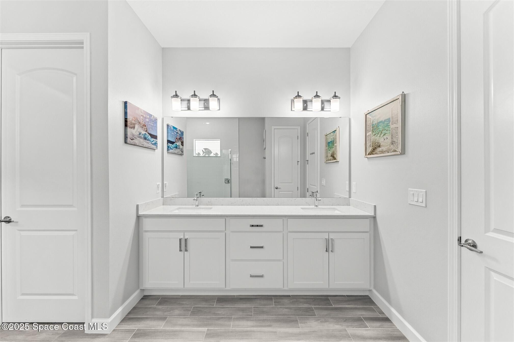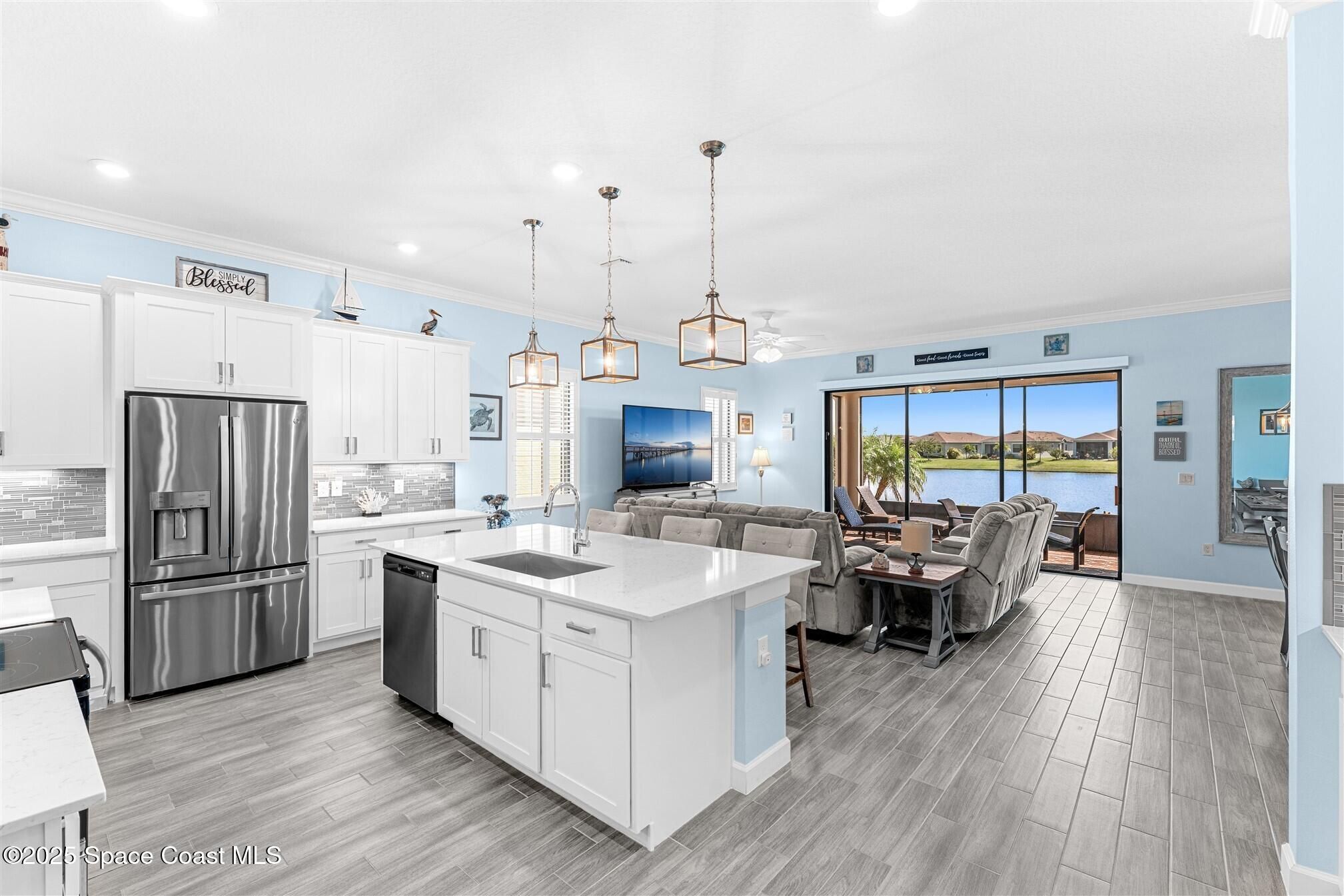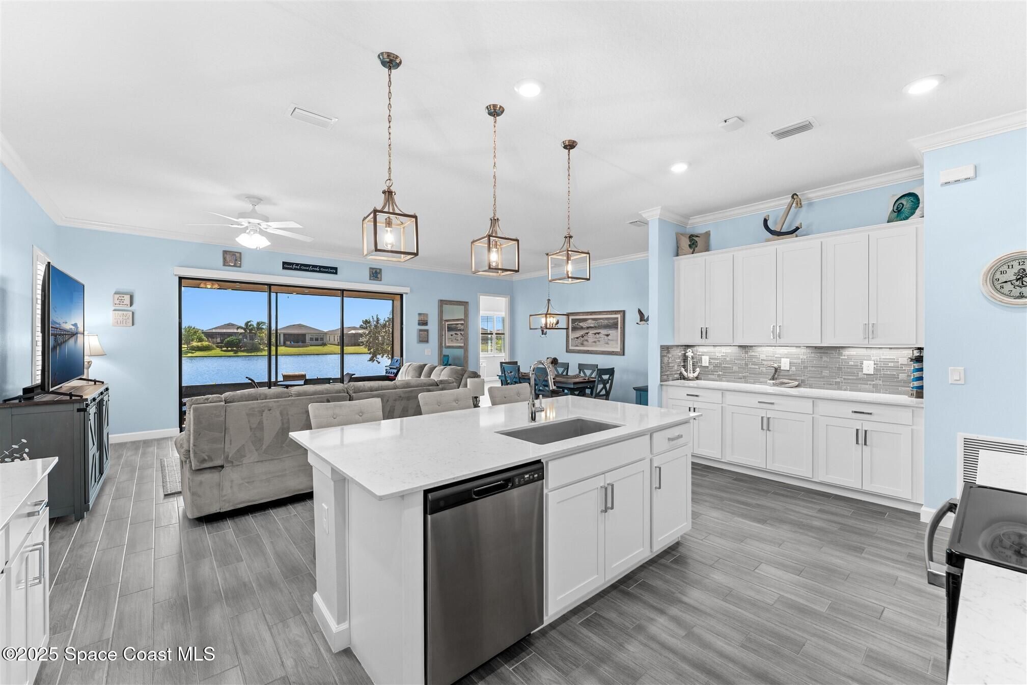 Pristine 3 bedroom plus study, 3 ½ bath home in Bridgewater, Viera's popular 55+ resort style community! Move in ready with every upgrade: new porcelain tile plank floors throughout, crown molding, plantation shutters, screened in lanai, 8' doors, epoxy garage floors and more! Perfect for guests, every bedroom is an ensuite with its own bath! Large three panel sliders in great room bring the beautiful lake views into your home and set it apart from similar key largo style homes! The outside is as meticulous as the interior with stone trim enhancing the freshly painted exterior. As you approach the home, you will notice the stone landscape beds and impact glass etched front door. Accordion shutters are on all windows and sliders and a transformer switch for a future generator add to your peace of mind. The private clubhouse offers a large heated pool and spa, fitness center, tennis & pickleball courts and a movie theater! Short drive to ocean beaches, cruise ships, shopping, dining!