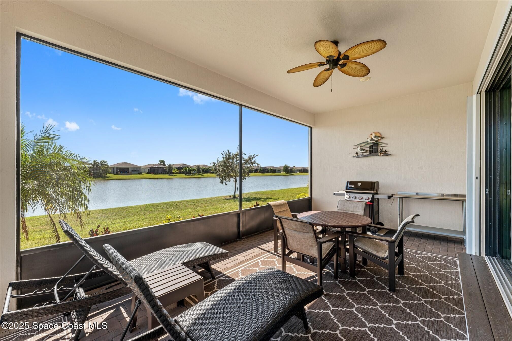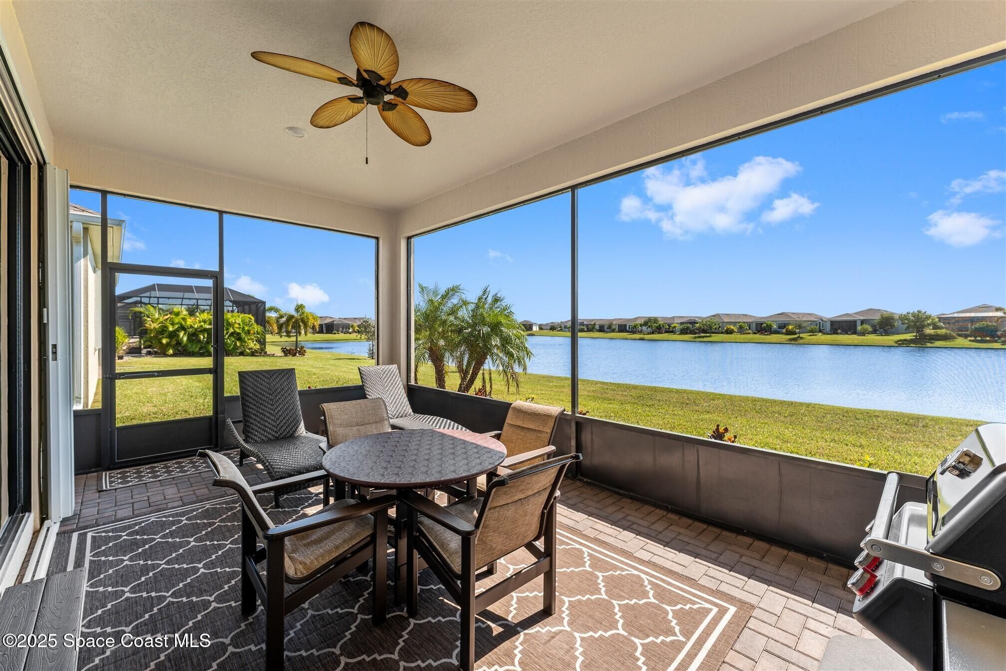 Pristine 3 bedroom plus study, 3 ½ bath home in Bridgewater, Viera's popular 55+ resort style community! Move in ready with every upgrade: new porcelain tile plank floors throughout, crown molding, plantation shutters, screened in lanai, 8' doors, epoxy garage floors and more! Perfect for guests, every bedroom is an ensuite with its own bath! Large three panel sliders in great room bring the beautiful lake views into your home and set it apart from similar key largo style homes! The outside is as meticulous as the interior with stone trim enhancing the freshly painted exterior. As you approach the home, you will notice the stone landscape beds and impact glass etched front door. Accordion shutters are on all windows and sliders and a portable generator w/transformer switch add to your peace of mind. The private clubhouse offers a large, heated pool and spa, fitness center, tennis & pickleball courts and a movie theater! Short drive to ocean beaches, cruise ships, shopping, dining!