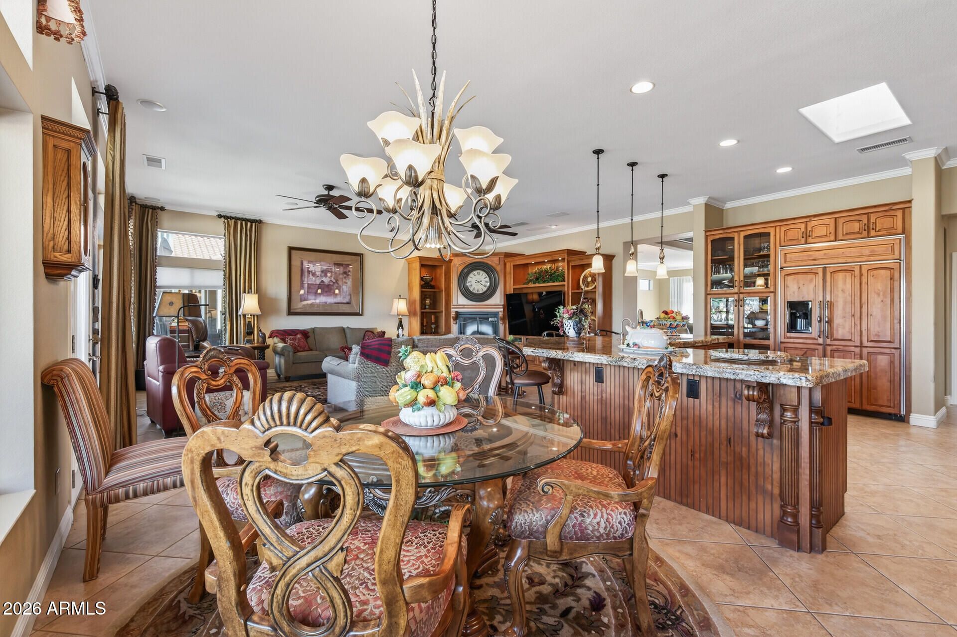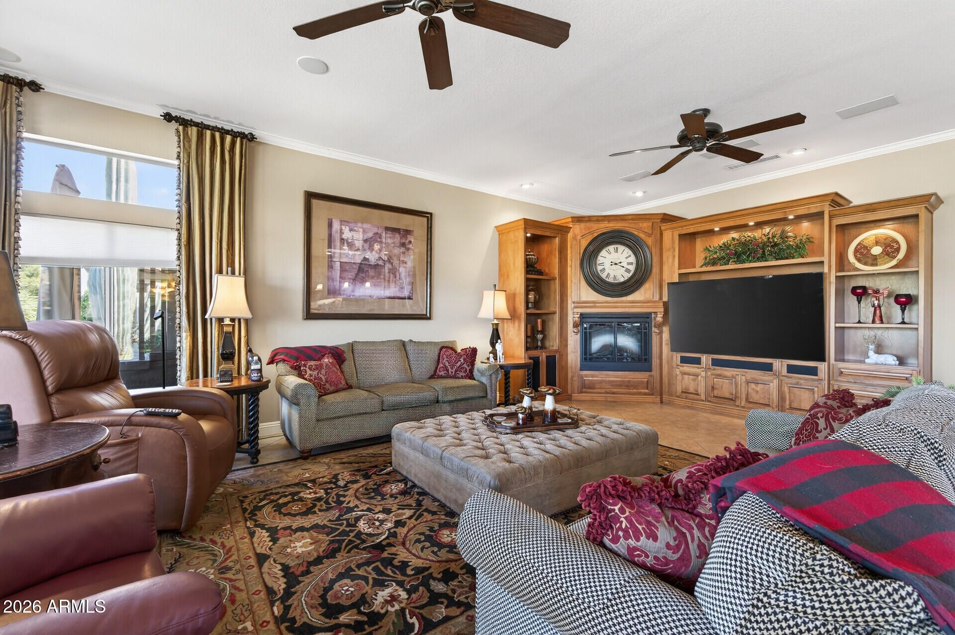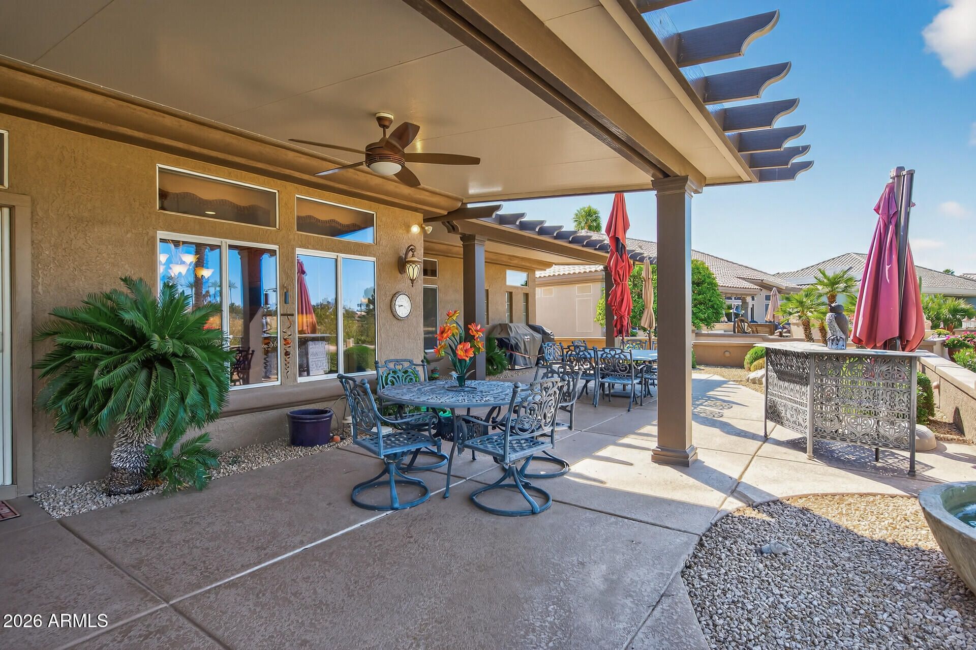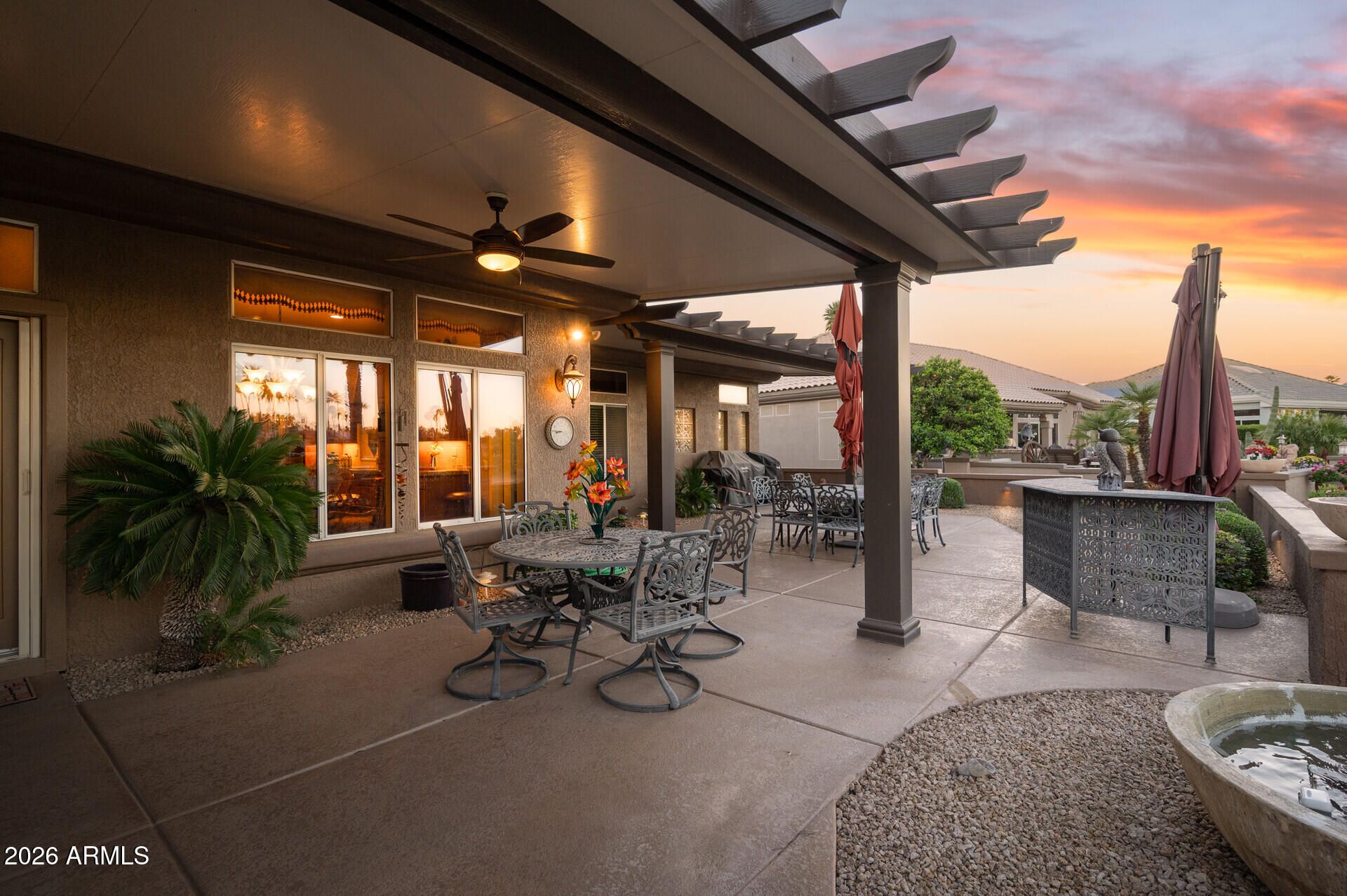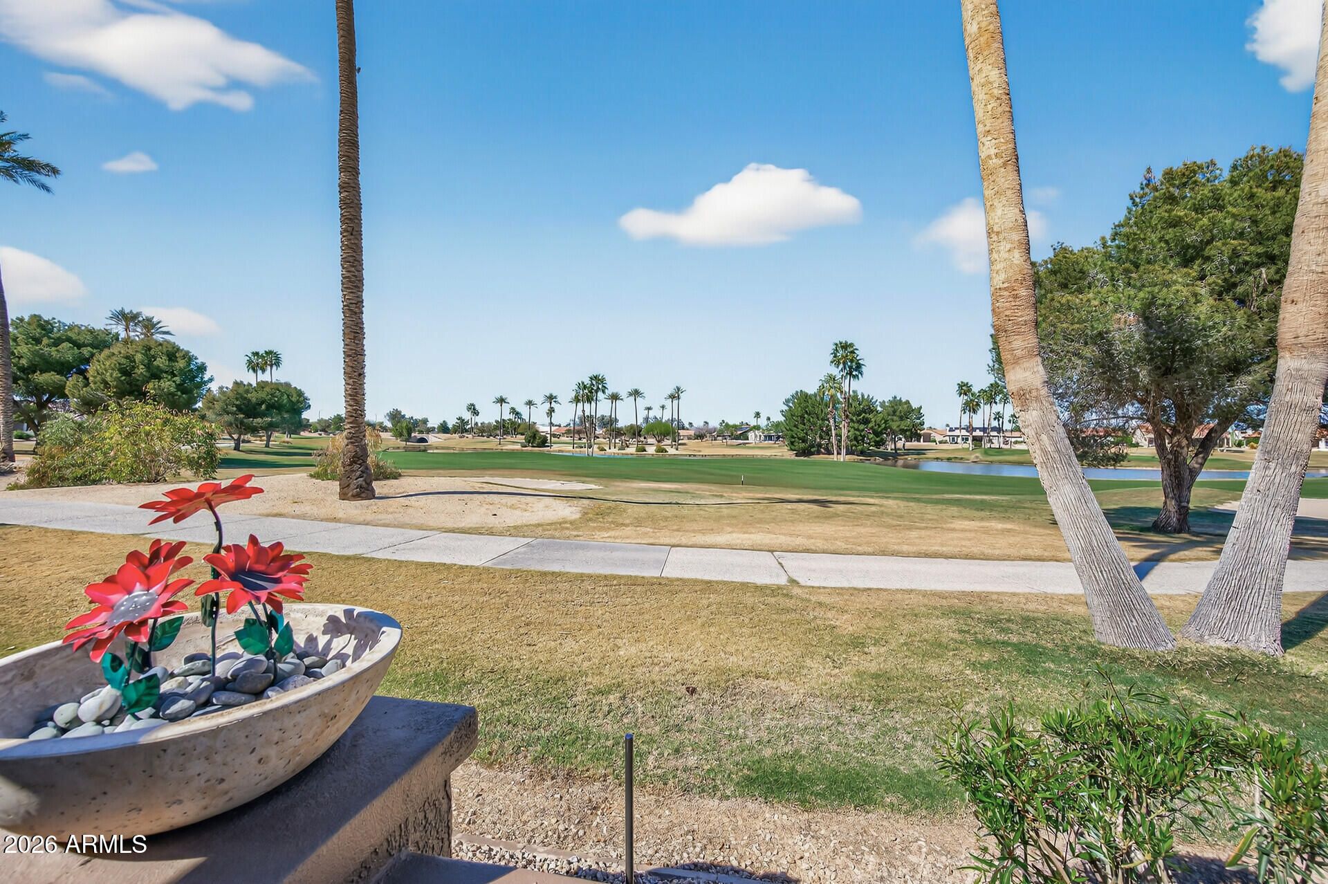 ONE-OF-A-KIND PROPERTY with MILLION-DOLLAR GOLF COURSE VIEWS! Prime lot overlooking the Desert Trails Golf Course featuring RARE TRIPLE FAIRWAY (15th, 16th and 17th) and WATER VEIWS This EXPANDED San Carlos model is being offered FULLY FURNISHED and is available for the first time from the original owner, who has METICULOUSLY MAINTAINED and THOUGHTFULLY UPDATED the home throughout the years. The ideal floor plan includes two spacious ensuite bedrooms plus a dedicated office/study with French doors and built-in cherry cabinetry. The home also features formal living and dining areas with custom chandelier lighting, along with an expanded family room highlighted by a full wall of built-ins, an entertainment center, and an electric holographic fireplace providing both ambiance and supplemental heat. The chef's kitchen is truly exceptional, featuring 6cm granite throughout, a massive kitchen island with counter seating, custom cabinetry (including built-in spice racks, premium appliances, induction cooktop, dual wall ovens, Ever-Hot water dispenser, pantry, and a dining area perfectly positioned to capture the spectacular water and golf course views. Outdoor living is equally impressive. The extended patio spans the full width of the home and includes an insulated patio roof, ceiling fans, and roll-down sunshades for year-round comfort. The patio furniture, custom fountain, BBQs, storage shed, and deck box all convey, making this outdoor space ready to enjoy immediately. Additional highlights include a 2.5-car garage plus dedicated golf cart garage, extensive storage, and a hobby/storage room leading to the garage. Major Improvements Include: New Premium Tyvek roof underlayment (2017) - 40-year material warranty and 10-year installation warranty -- Exterior paint and driveway/walkway resurfaced and painted (2024) - 5-year warranty -- New 50-gallon water heater with recirculation pump (2025) -- New water softener (2023) -- One A/C unit replaced (2022) -- Custom leaded glass double front doors with overhead window -- Hidden roll-away screens on front and patio doors -- Landscape lighting in front and back yards -- Solar tubes and skylights for abundant natural light -- Additional electrical outlets in kitchen and floor outlets in family room -- Coffered ceilings and custom 4" baseboards -- Two built-in shoe closets in the primary bedroom -- Spa-inspired primary bath with large roll-in shower, bench seating, 6cm granite counters, dual vanities, extra outlets (including USB), and walk-in closet -- Spacious guest suite with private bath and walk-in closet -- Central vacuum system -- Storage/hobby room leading to garage -- New Samsung washer and dryer -- Extended 2.5-car garage with utility sink, extensive built-in cabinetry, storage drawers, and dedicated golf cart bay -- A rare opportunity to own a beautifully maintained golf course property with exceptional views, upgrades, and furnishings included in one of Sun City West's most desirable locations.