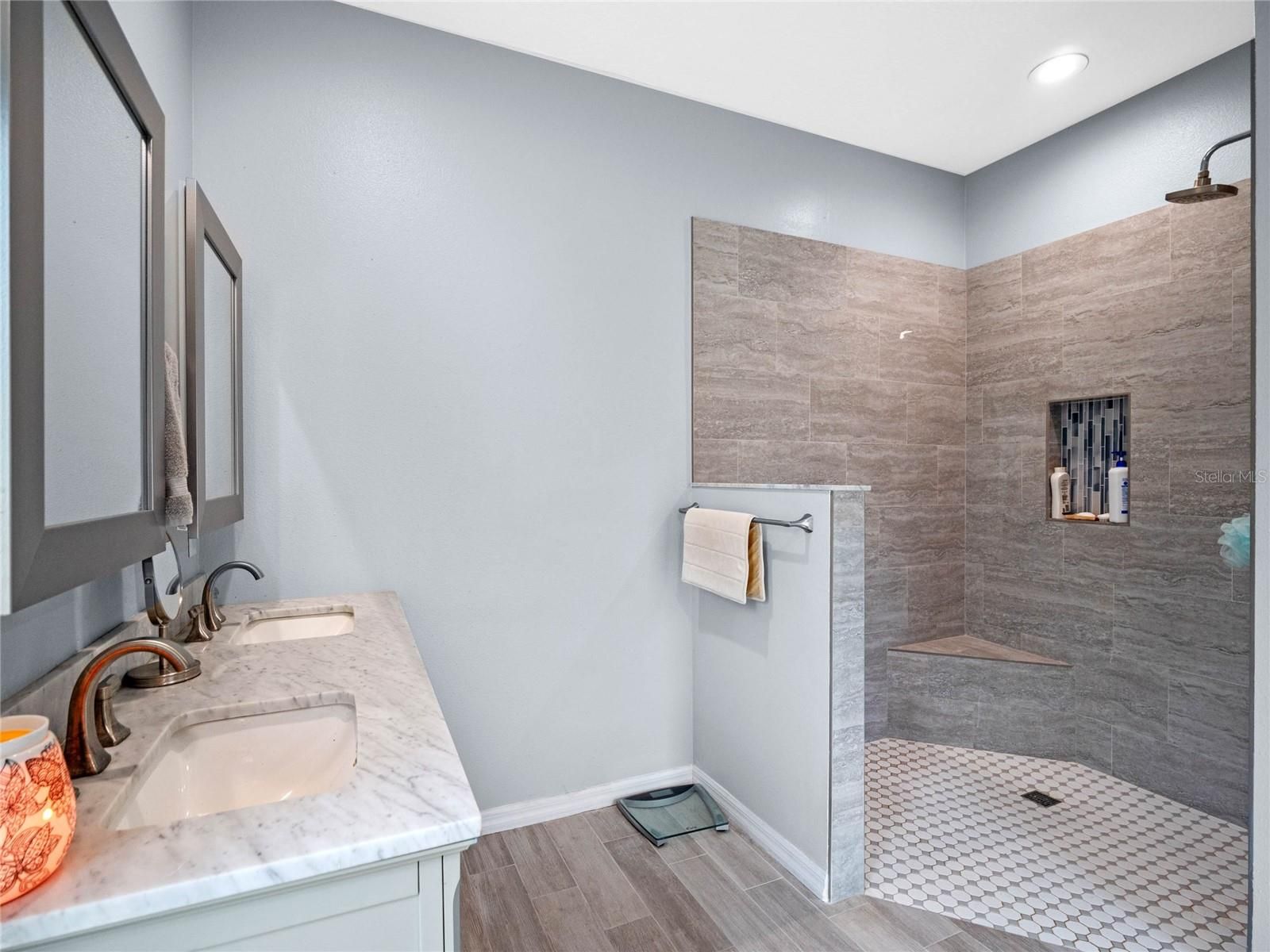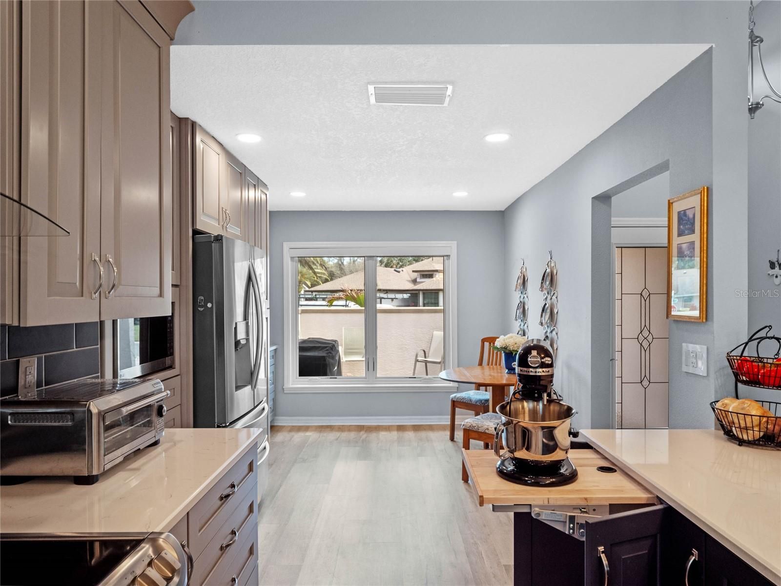 - Built-in Features, Ceiling Fan(s), Eat-in Kitchen, High Ceilings, Living/Dining Room, Open Floorplan, Main Level Primary, Solid Surface Counters, Solid-Wood Cabinets, Split Bedrooms, Thermostat, Tray Ceiling(s), Walk-In Closet(s), Window Treatments