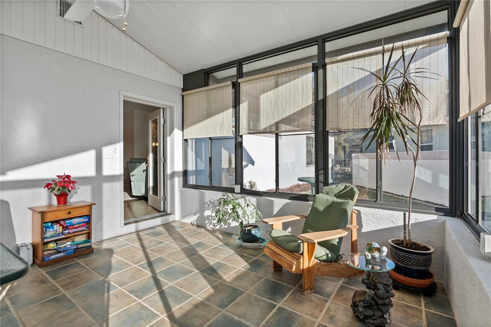 Roof Built in June 2025! This distinctive corner-lot home offers exceptional curb appeal with a side-entry garage, attractive landscaping, and a privately fenced courtyard (perfect for added privacy and pet safety). Inside, you’ll find a bright and inviting Florida room measuring 14x15 (an additional 210 sq ft heated) with mini-split air conditioning, ideal for year-round enjoyment. A versatile bonus room located behind French doors provides endless possibilities as a 4th bedroom, home office, den, or hobby space, featuring generous closet storage, backyard access, and abundant natural light. One of the bedrooms comes equipped with a convenient queen-sized Murphy bed, maximizing space and functionality. The home showcases quality CBS construction, elegant porcelain tile flooring, plantation shutters, built-ins, and thoughtful architectural details throughout. The well-appointed kitchen includes stainless steel appliances, ample cabinetry, a pantry, a Kinetico water softener with reverse osmosis, and both casual and formal dining areas that offer flexibility for everyday living and entertaining. The spacious owner’s suite provides a peaceful retreat with a walk-in closet and an ensuite bathroom featuring a dual vanity, step-in shower, and an on-demand water heating system for endless hot water and added efficiency. Additional bedrooms and a guest bath are tastefully finished. Meticulously maintained and move-in ready, this home reflects pride of ownership throughout. Located in Royal Highlands, a premier 55+ community offering golf, one indoor pool, one outdoor pool, a fitness center, Great Hall, and an active social calendar. Conveniently situated in Lake County near shopping, medical facilities, major attractions, and Orlando International Airport. CABLE AND INTERNET ARE INCLUDED IN THE HOA FEE.