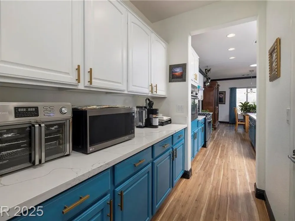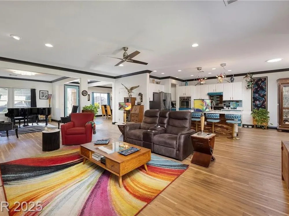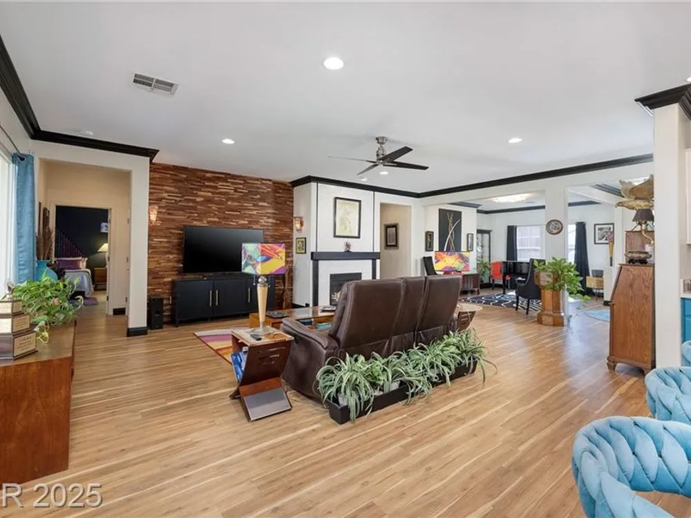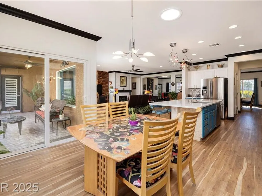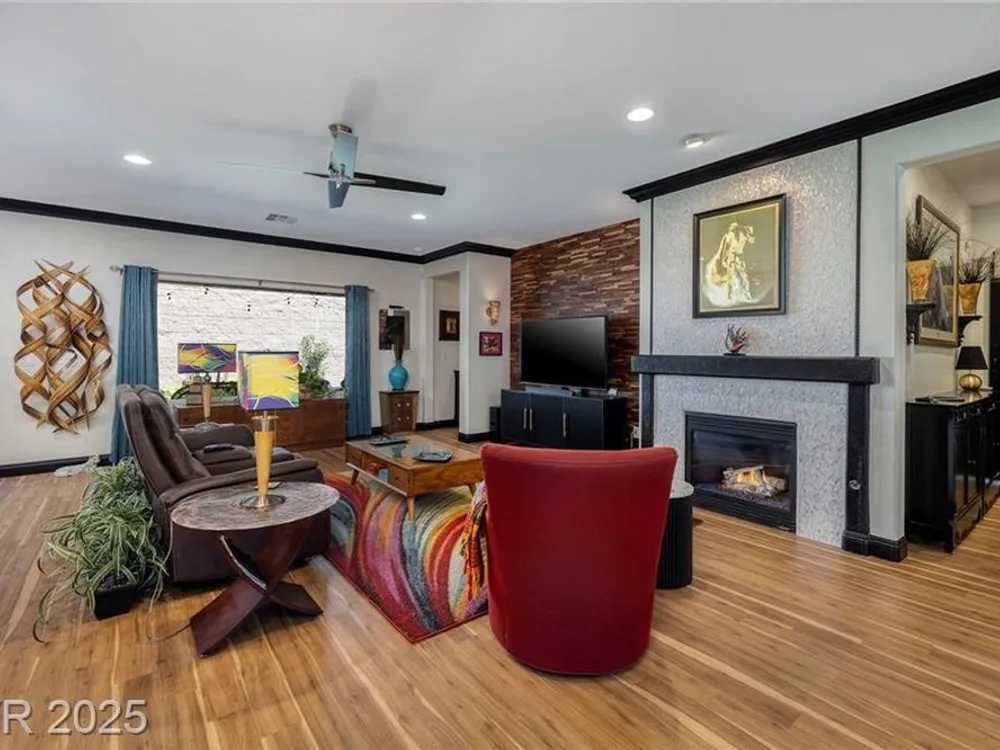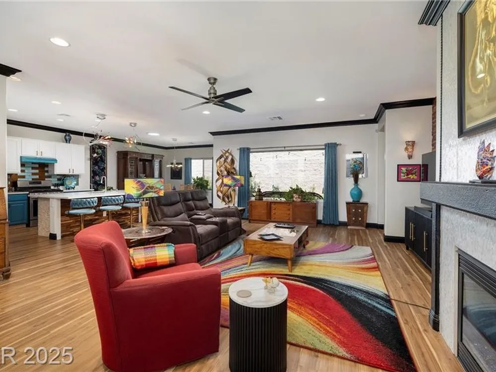 Stunning Columbia Model in Sun City Anthem – 55+ Living at Its Finest! Welcome to this beautifully maintained and popular floor plan with thoughtfully designed living spaces, featuring 2 bedrooms, 2 bathrooms, and a flex room with a stylish barn door—perfect as a den, office, fitness space, or hobby room. Large family room with gas fireplace and plenty of natural light. The upgraded kitchen boasts 2 ovens, SS appliances, eat-in nook, island, butler’s pantry + walk-in pantry for ample storage. Interior highlights include luxury vinyl plank flooring, crown molding, and custom light fixtures—all adding warmth and elegance. Garage has Electric car charger. Step outside to your fully enclosed backyard with covered patio and low-maintenance desert landscaping, offering peaceful outdoor living year-round. 3 Clubhouses, restaurant, 2 golf courses, fitness center, pickleball, swimming, tennis and more. Don't miss this opportunity to live in one of Henderson’s premier active adult communities!