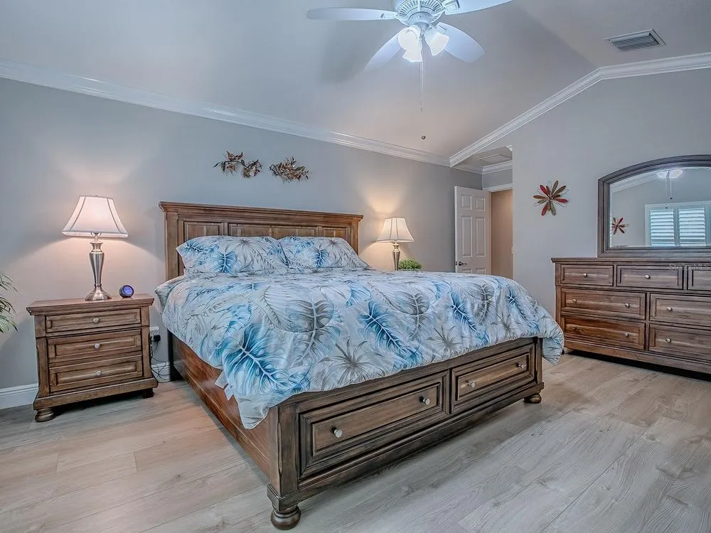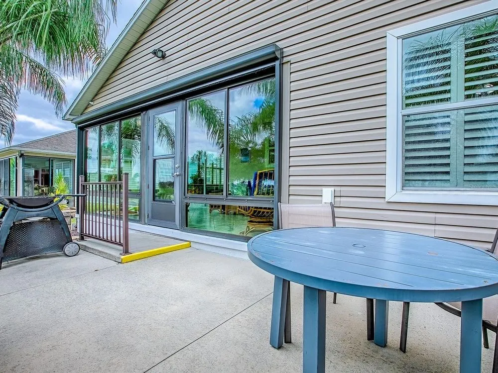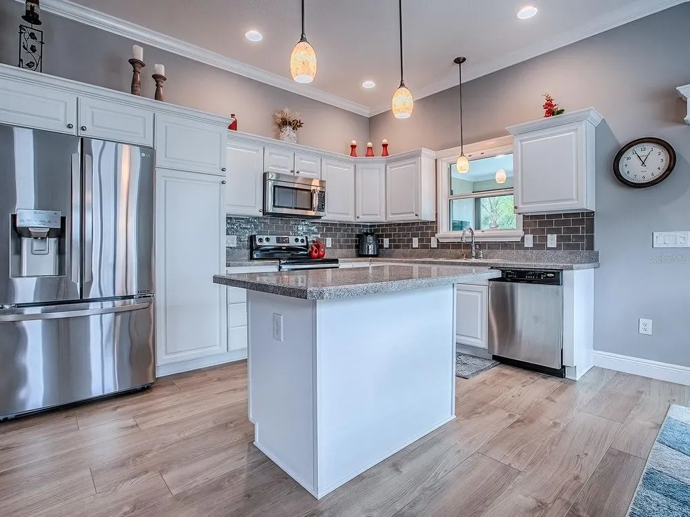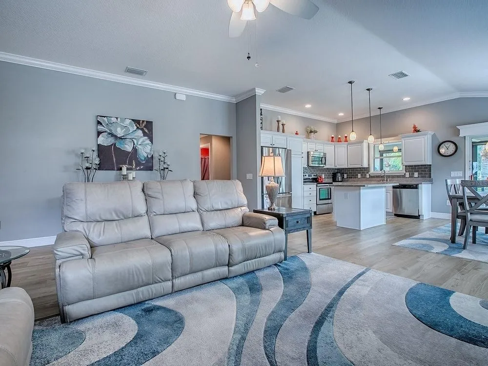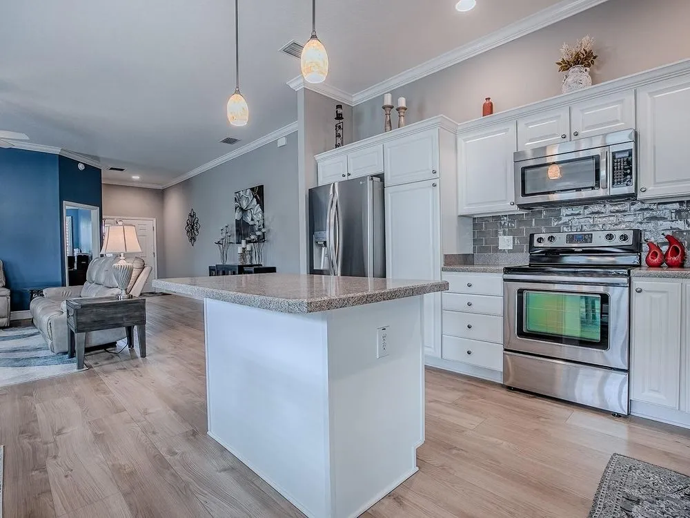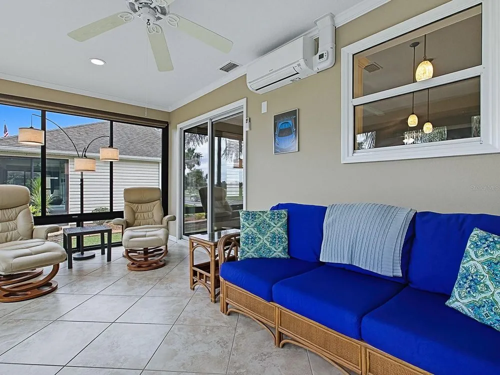 NEW ROOF COMING, and NEW 2024 HVAC on this LOVELY FURNISHED 3/2 COTTAGE with 2 car+ GOLF CART GARAGE located in the VILLAGE OF ST. JAMES. This beautiful, upgraded Seabreeze has lovely curb appeal with curbing, rock beds, and palm trees surrounding the entire home. You’ll find custom features throughout; PLANTATIONS SHUTTERS, CROWN MOLDING and NEW LUXURY VINYL PLANK FLOORING! The kitchen offers WHITE cabinetry with beveled edge hi-definition counter tops, SUBWAY TILE BACKSPLASH, STAINLESS appliances, closet PANTRY, under cabinet lighting, and an island with extra storage and pendant lighting. The dining room opens with sliding glass doors out to the GLASS ENCLOSED LANAI with drywall walls, TILE flooring, a mini-split unit for year round comfort, and motorized shades AND a GREAT VIEW! You’ll also love the custom PATIO off the enclosed lanai with a stacked stone wall, and plenty of room for grilling and entertaining while enjoying the VIEW! The two guest rooms both have all the lovely upgrades and large closets. The guest bath has a custom mirror, white cabinetry, crown molding, and a tub/shower. The primary bedroom has a large WALK-IN CLOSET with extra shelving, and an EN-SUITE BATH. The bath has a linen closet, dual sinks, and a pocket door that leads to the toilet and shower with glass enclosures. The laundry room has extra cabinetry and, of course, the washer and dryer do convey with the home. You’ll really enjoy all the room in the 2 car+ GOLF CART GARAGE where you’ll also find the NOVA water filtration system, pull down stairs, and power ventilation. Many other features include lightning rods, solar tube, and a security system with cameras, and so much more! This house has so much to offer whether a full time residence, snowbird, or a rental in a prime location. Located between Lake Sumter Landing and Brownwood with plenty of golf courses, recreation centers and nearby shopping, dining, and plenty of neighborhood fun!