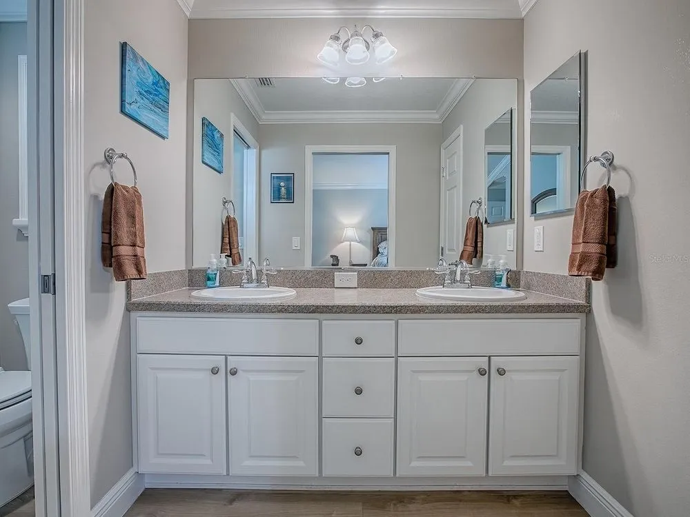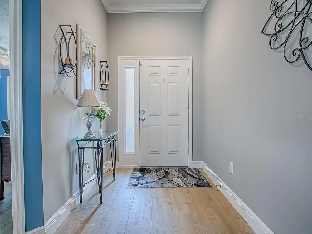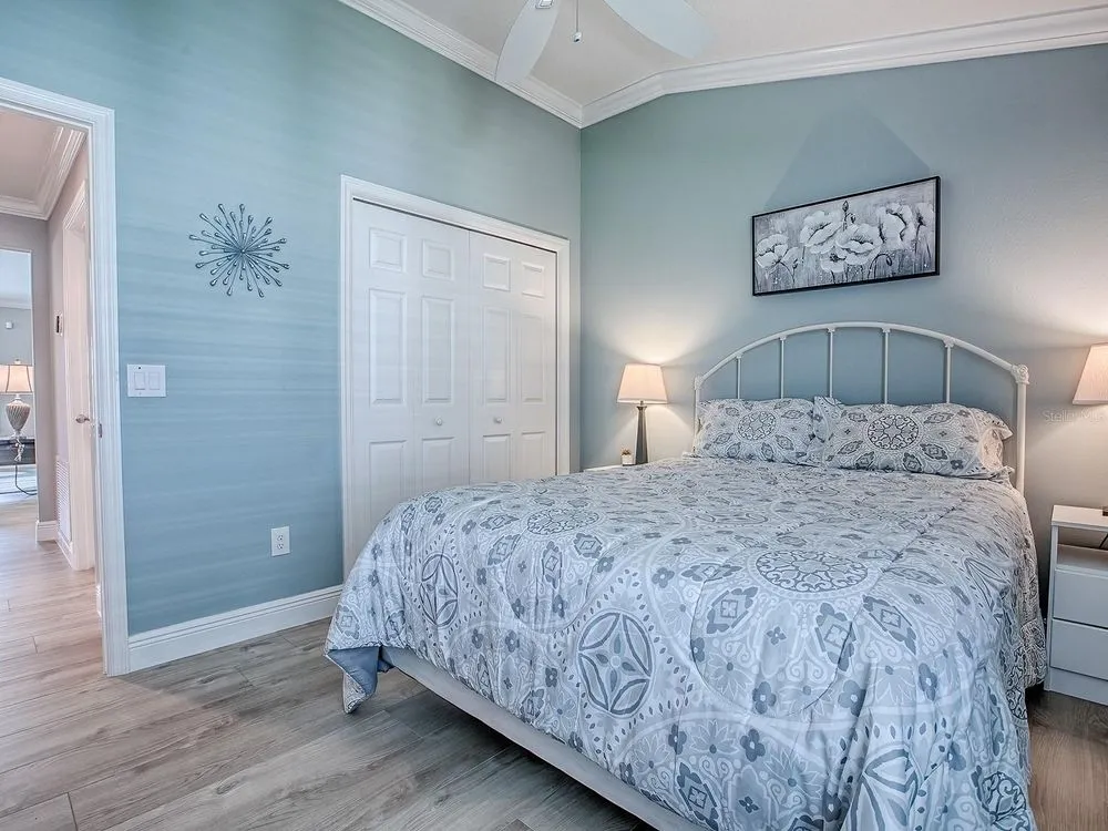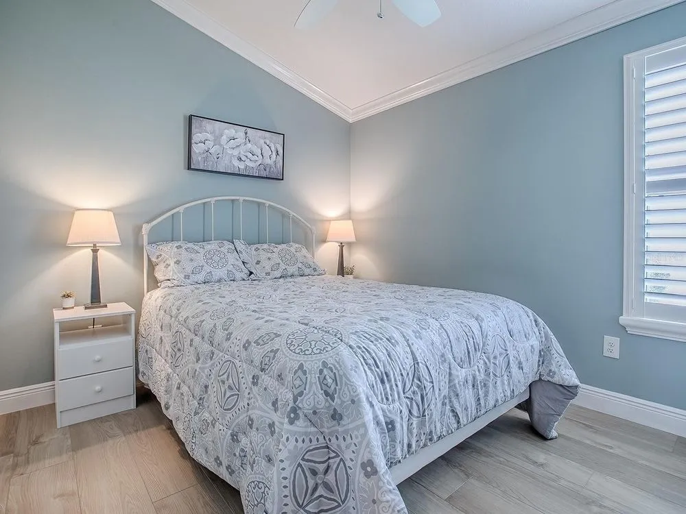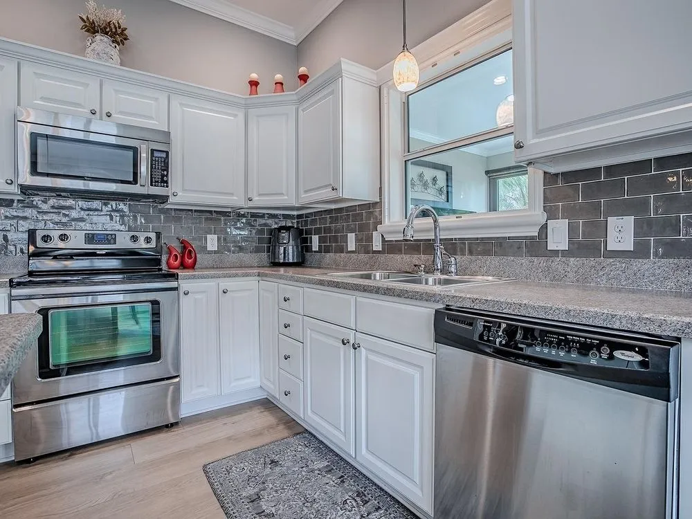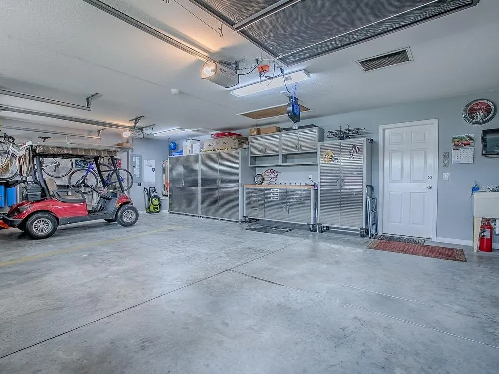 NEW ROOF COMING, and NEW 2024 HVAC on this LOVELY FURNISHED 3/2 COTTAGE with 2 car+ GOLF CART GARAGE located in the VILLAGE OF ST. JAMES. This beautiful, upgraded Seabreeze has lovely curb appeal with curbing, rock beds, and palm trees surrounding the entire home. You’ll find custom features throughout; PLANTATIONS SHUTTERS, CROWN MOLDING and NEW LUXURY VINYL PLANK FLOORING! The kitchen offers WHITE cabinetry with beveled edge hi-definition counter tops, SUBWAY TILE BACKSPLASH, STAINLESS appliances, closet PANTRY, under cabinet lighting, and an island with extra storage and pendant lighting. The dining room opens with sliding glass doors out to the GLASS ENCLOSED LANAI with drywall walls, TILE flooring, a mini-split unit for year round comfort, and motorized shades AND a GREAT VIEW! You’ll also love the custom PATIO off the enclosed lanai with a stacked stone wall, and plenty of room for grilling and entertaining while enjoying the VIEW! The two guest rooms both have all the lovely upgrades and large closets. The guest bath has a custom mirror, white cabinetry, crown molding, and a tub/shower. The primary bedroom has a large WALK-IN CLOSET with extra shelving, and an EN-SUITE BATH. The bath has a linen closet, dual sinks, and a pocket door that leads to the toilet and shower with glass enclosures. The laundry room has extra cabinetry and, of course, the washer and dryer do convey with the home. You’ll really enjoy all the room in the 2 car+ GOLF CART GARAGE where you’ll also find the NOVA water filtration system, pull down stairs, and power ventilation. Many other features include lightning rods, solar tube, and a security system with cameras, and so much more! This house has so much to offer whether a full time residence, snowbird, or a rental in a prime location. Located between Lake Sumter Landing and Brownwood with plenty of golf courses, recreation centers and nearby shopping, dining, and plenty of neighborhood fun!