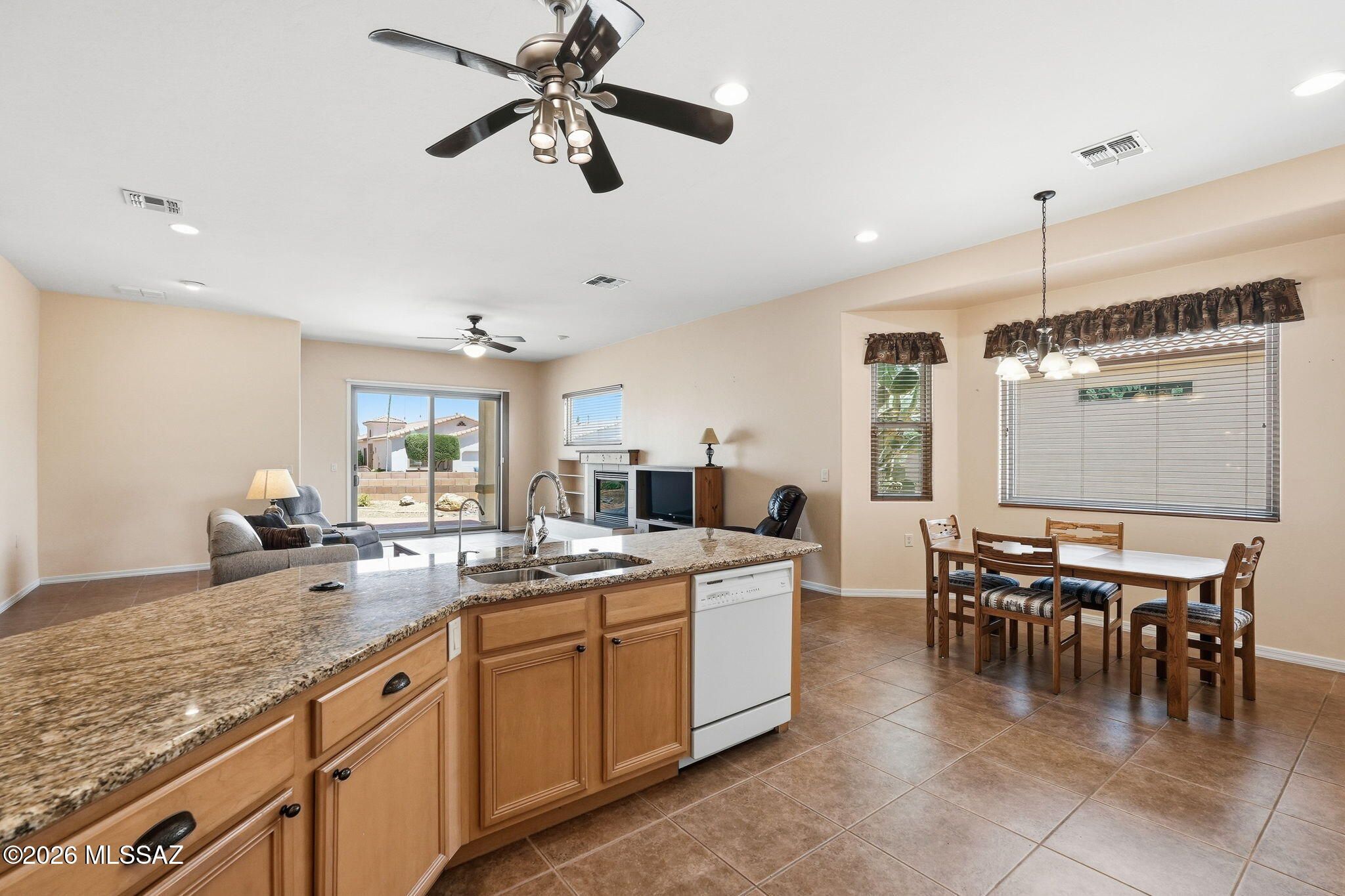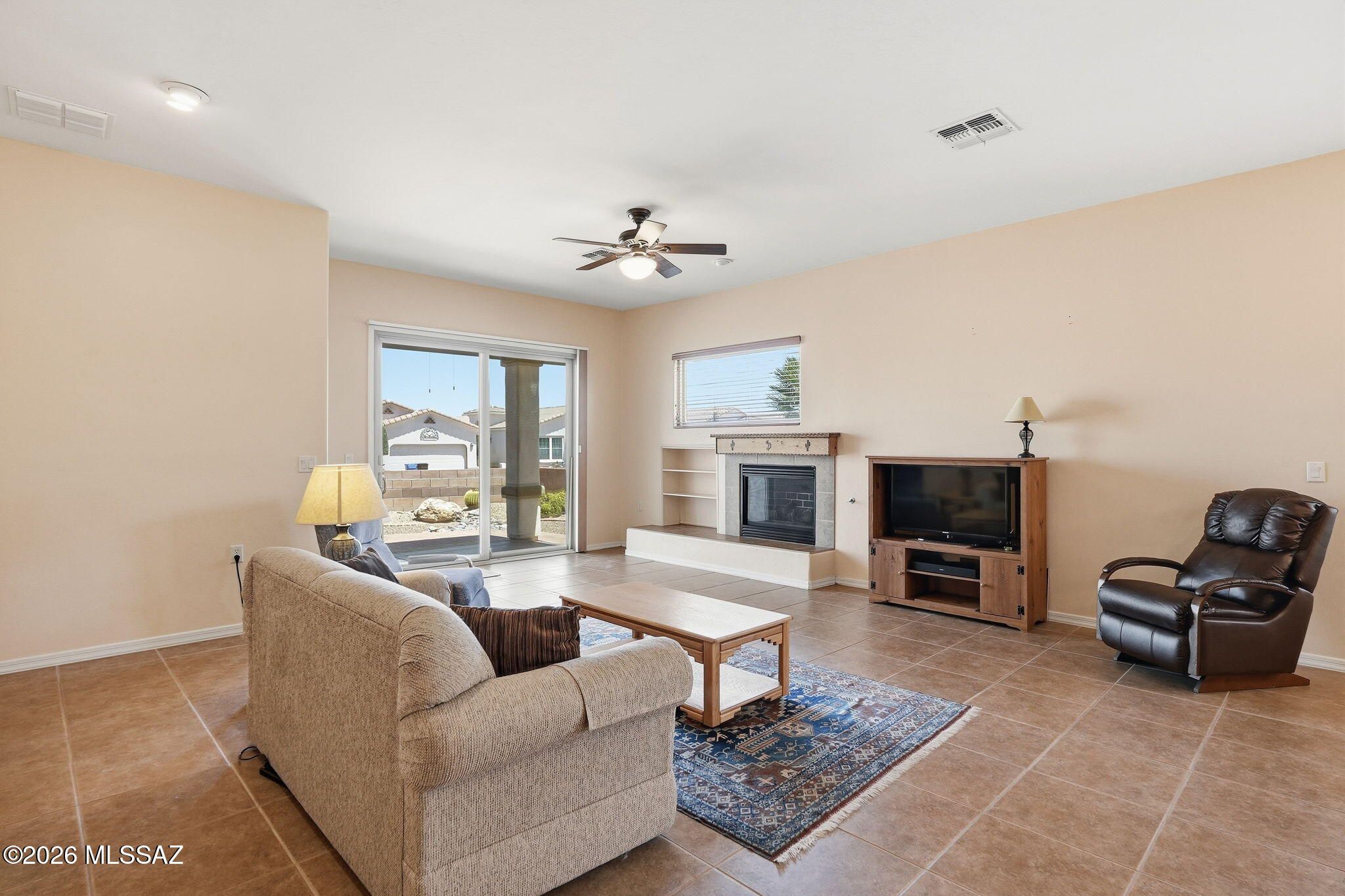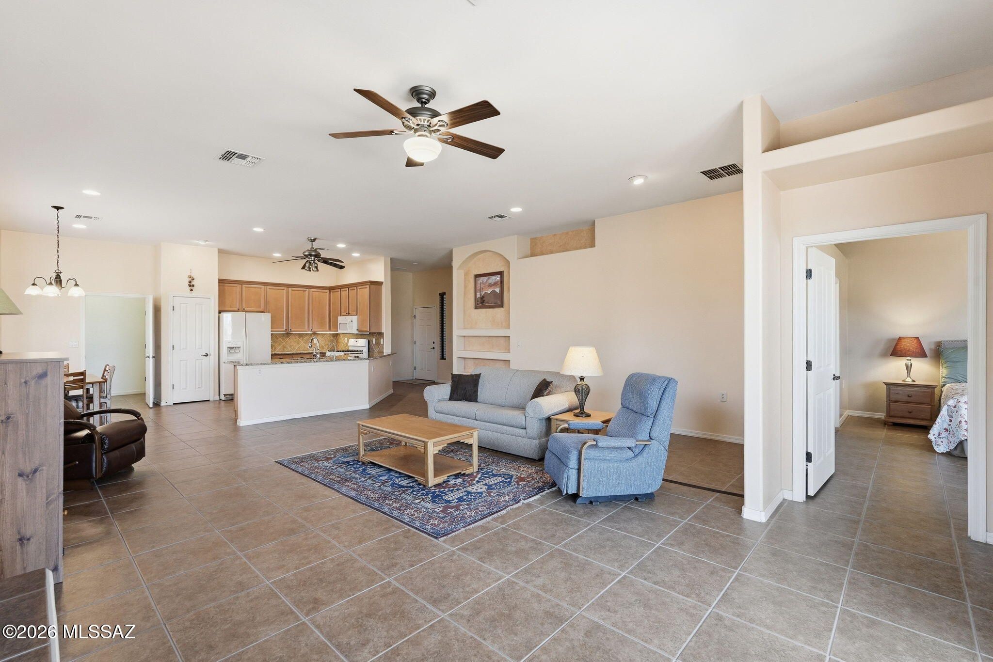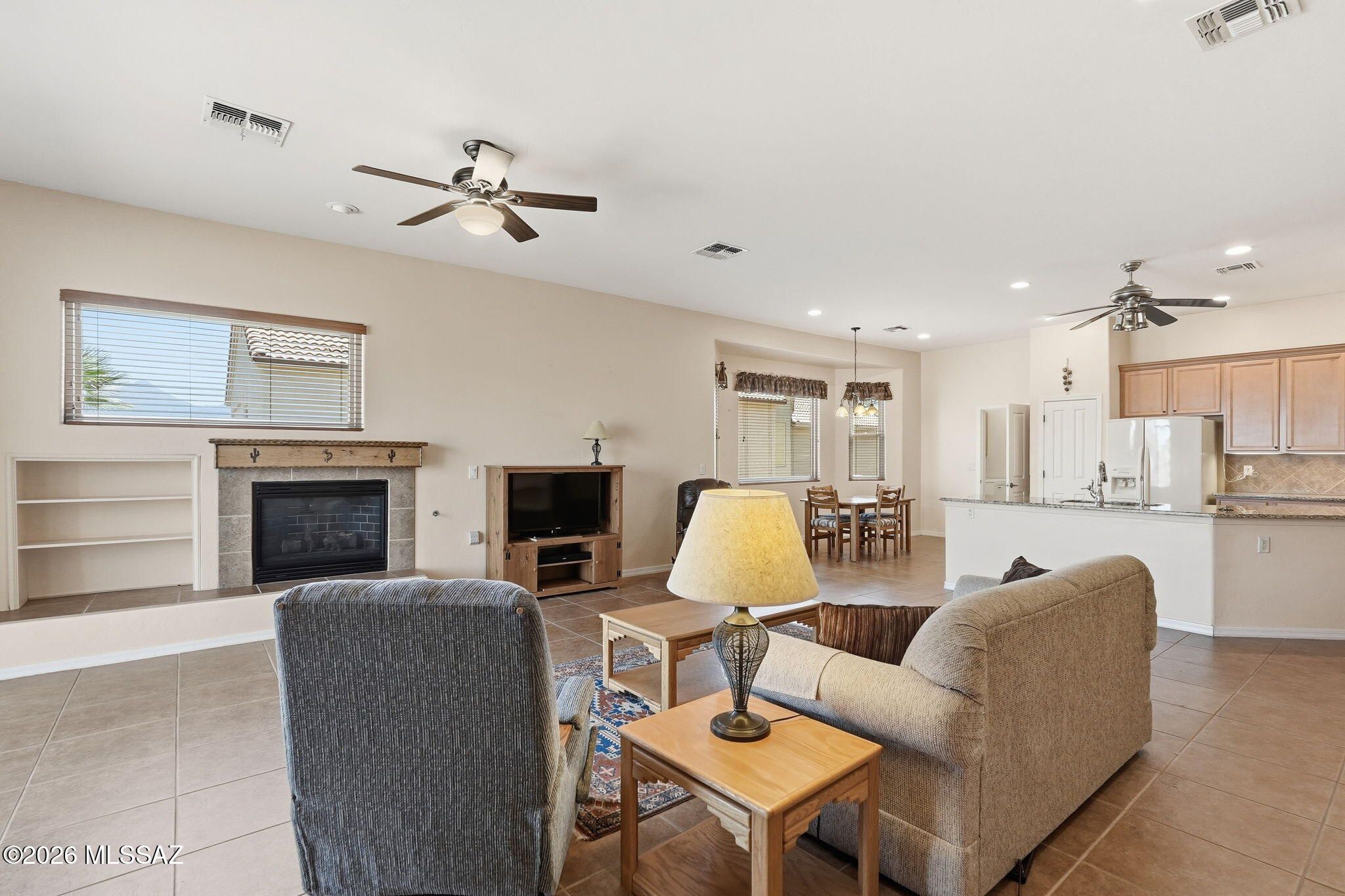 Experience comfortable, easy Southwest living in this well-maintained 1,599 sq. ft. home, ideally situated in the heart of Green Valley. Offering 2 bedrooms, 2 bathrooms, a versatile den, and a 2-car garage, this home is thoughtfully designed for both everyday comfort and relaxed entertaining.A spacious front courtyard creates a warm welcome and provides a private setting to enjoy morning coffee or quiet afternoons. Inside, the open great room is filled with natural light and centered around a cozy fireplace, adding both charm and a sense of comfort. The adjoining kitchen is designed to stay connected to the living space and features granite countertops, white appliances, generous cabinetry, and a functional layout that makes hosting simple.