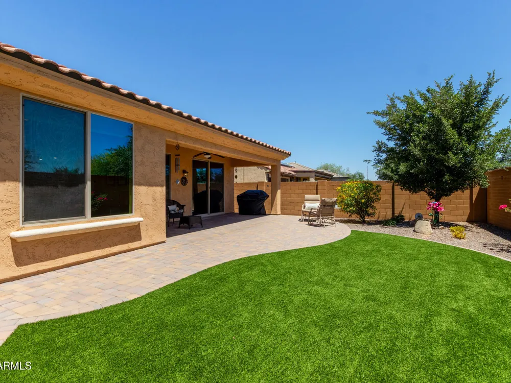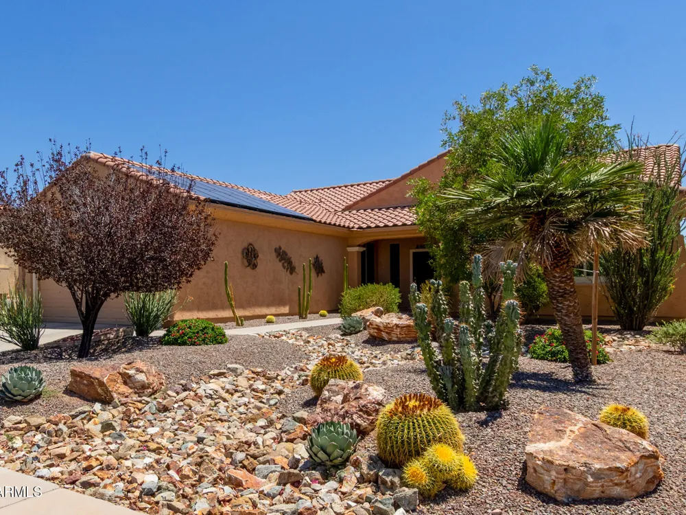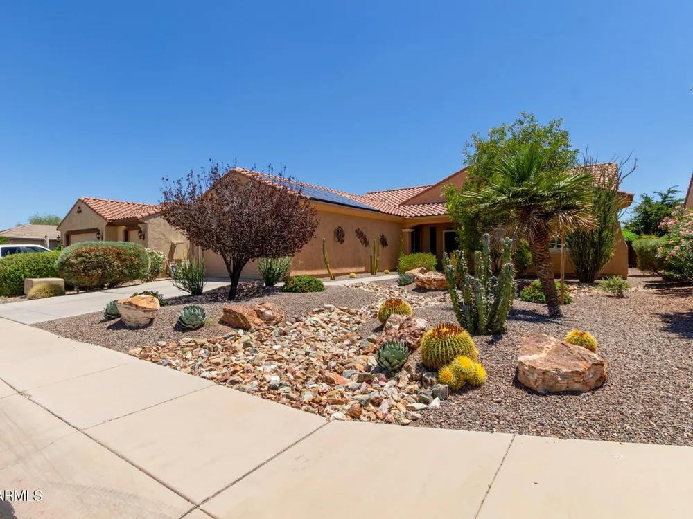 You must see this AMAZING Spanish Jamboree home with OWNED SOLAR, 27Ft extended 2 car garage and beautifully landscaped private walled backyard. This 2 bed 2 bath w/Office is Conveniently located near an inviting greenspace with walking trails. Enjoy the open floorplan with granite countertops, staggered cabinets, KitchenAid Stainless Steel appliances and breakfast nook. The cabinets have pull out drawers and under cabinet lighting. The oversized garage has an epoxy coat floor, storage cabinets, sink and a tankless water heater. The new HVAC system and Owned Solar will keep your Utility bills at a minimum. Relax in the spacious owner's suite with a large bay window, dual sinks, walk in shower and walk in closet. A must see!