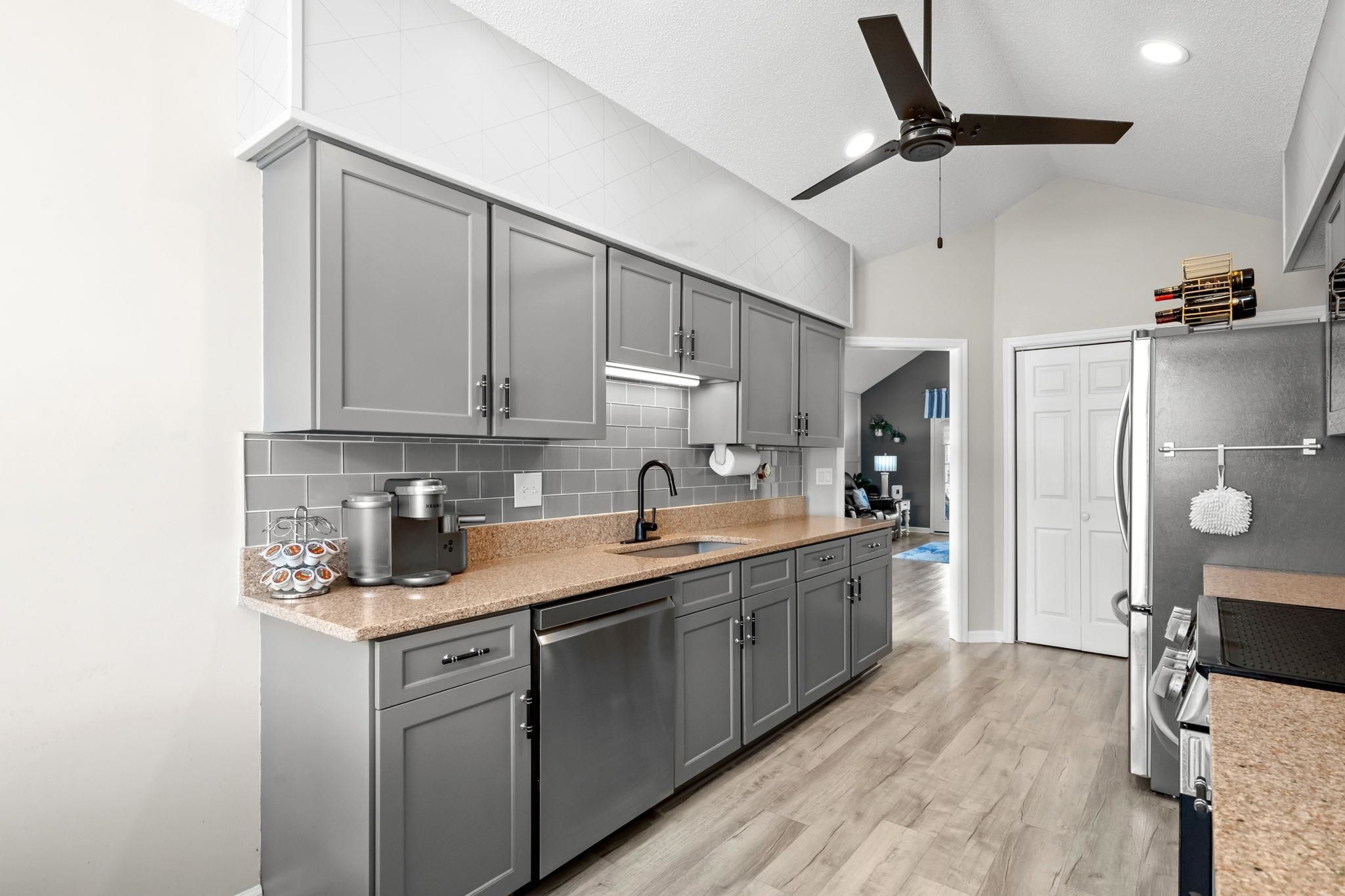 - Ceiling Fan(s), Fully Furnished, Accessibility Features, Main Level Primary, Split Bedrooms, Separate Shower, Walk-In Closet(s), Window Treatments, Bedroom on Main Level, Breakfast Area, Entrance Foyer, Kitchen Island, Stainless Steel Appliances, Solid Surface Counters