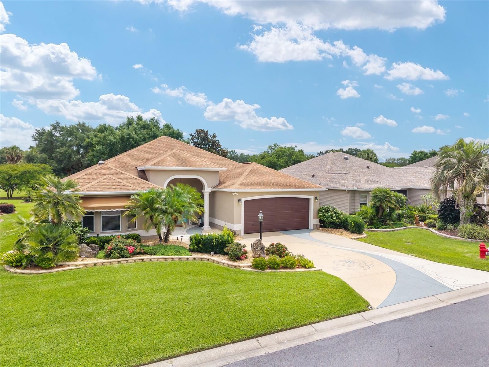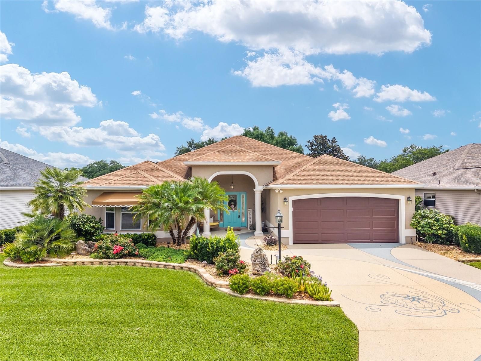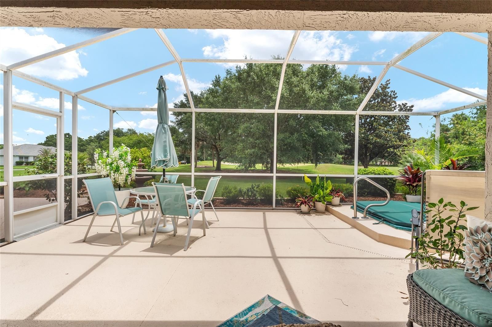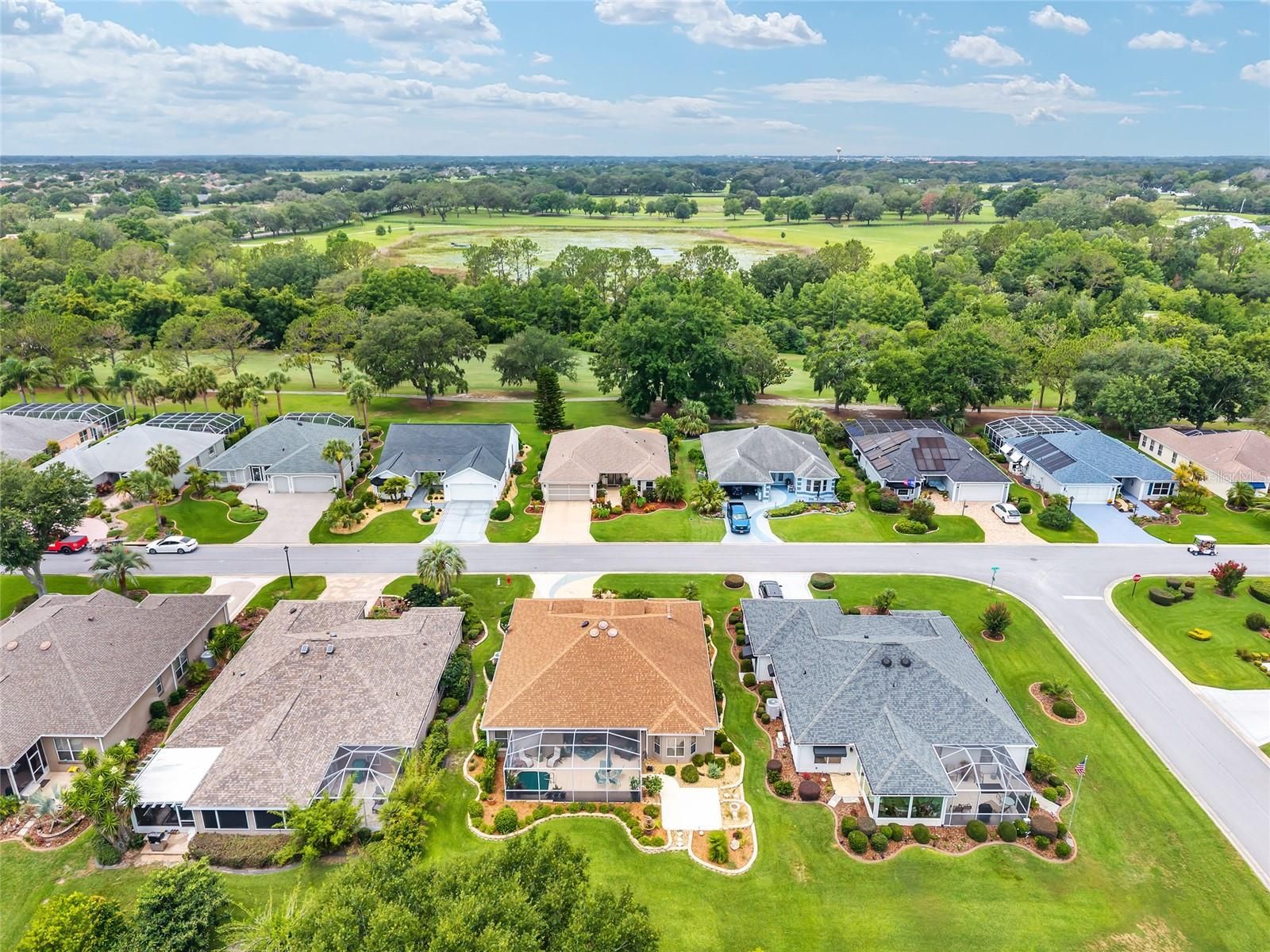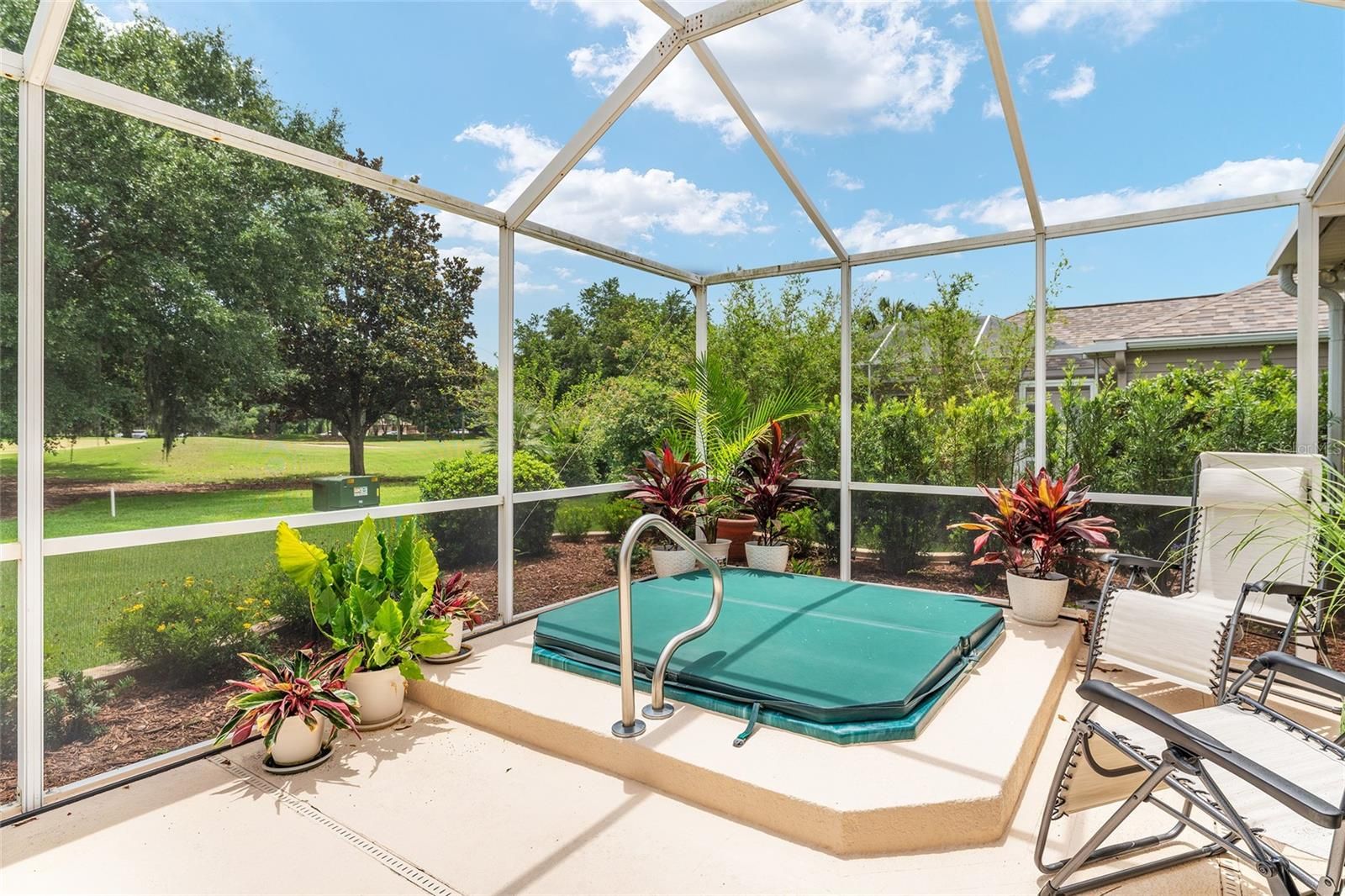 This stylish and desirable 3/2, 1831sf Sierra Model home is located near the 15th hole of the Tierra del Sol golf course. PRIVATE VIEW OF THE GOLF COURSE W/ NO CART PATH IN SITE! It has a SPLIT PLAN which allows guests their own private bath and bedroom area. The kitchen is bright and spacious with STAINLESS STEEL APPLIANCES, BREAKFAST BAR, WHITE CABINETS, GRANITE COUNTERS/ BACKSPLASH, and a space for a dining table that overlooks the greens. NEUTRAL Interior paint. Great bedroom sizes. Large screened-in lanai and birdcage with OUTDOOR SINK and in-ground hot tub. Elevated PROFESSIONALLY LANDSCAPED and the exterior is BLOCK & STUCCO. TANKLESS H20 HTR, NEW ROOF, NEW WASHER/ DRYER, NEW DECORATIVE DRIVEWAY, EPOXY garage floor. HIGH END WHOLE HOUSE FILTRATION and WATER SOFTENING SYSTEM. NO BOND. Some of the lovely furnishings are available separately. Superior location, just minutes from 466 shopping, restaurants, banks, pools and Rec areas. SHORT CART RIDE to Sumter Lndg. This home is unique and beautiful so don’t miss the opportunity to see it.