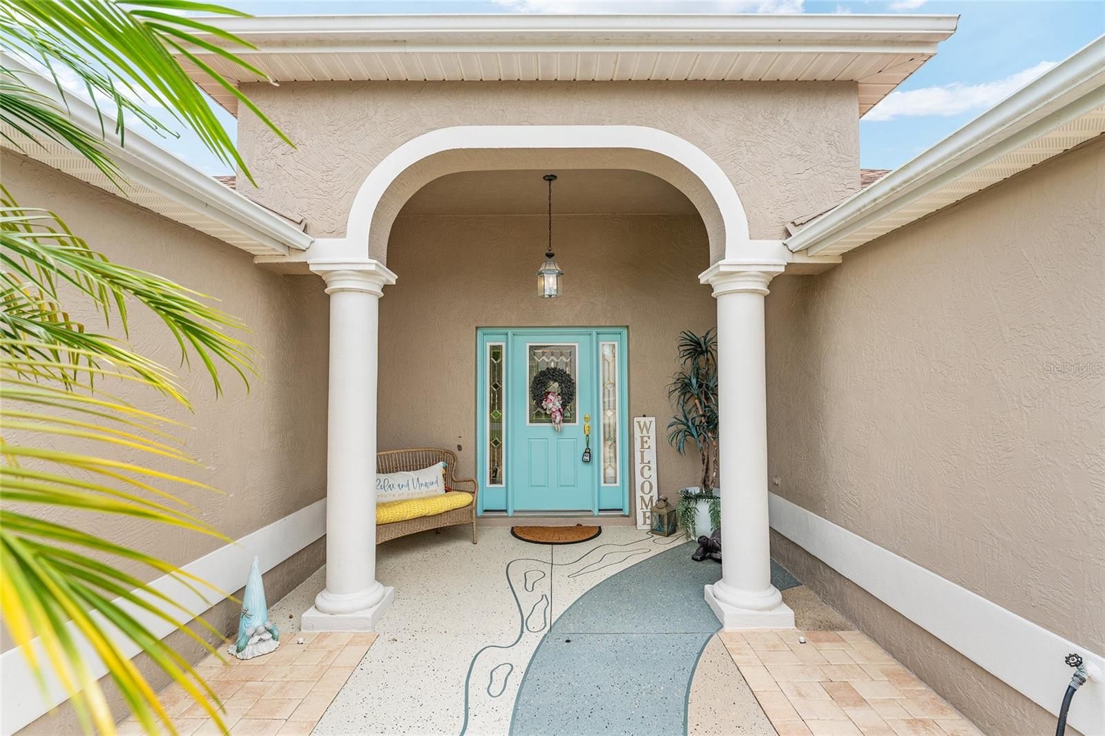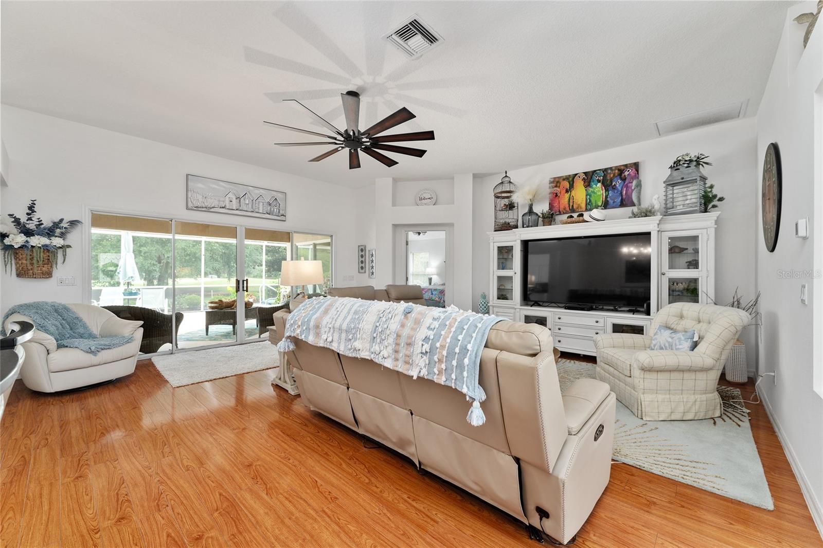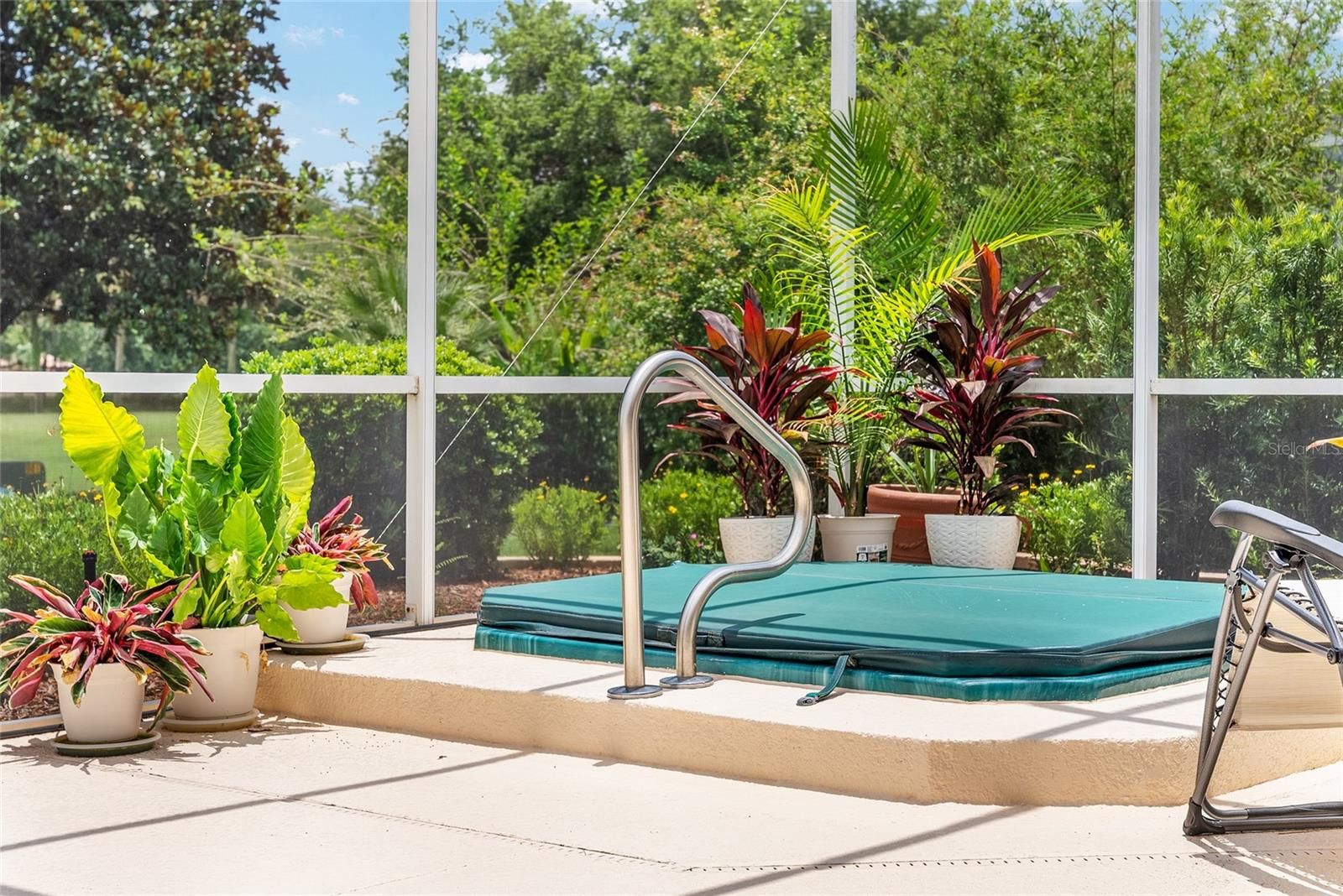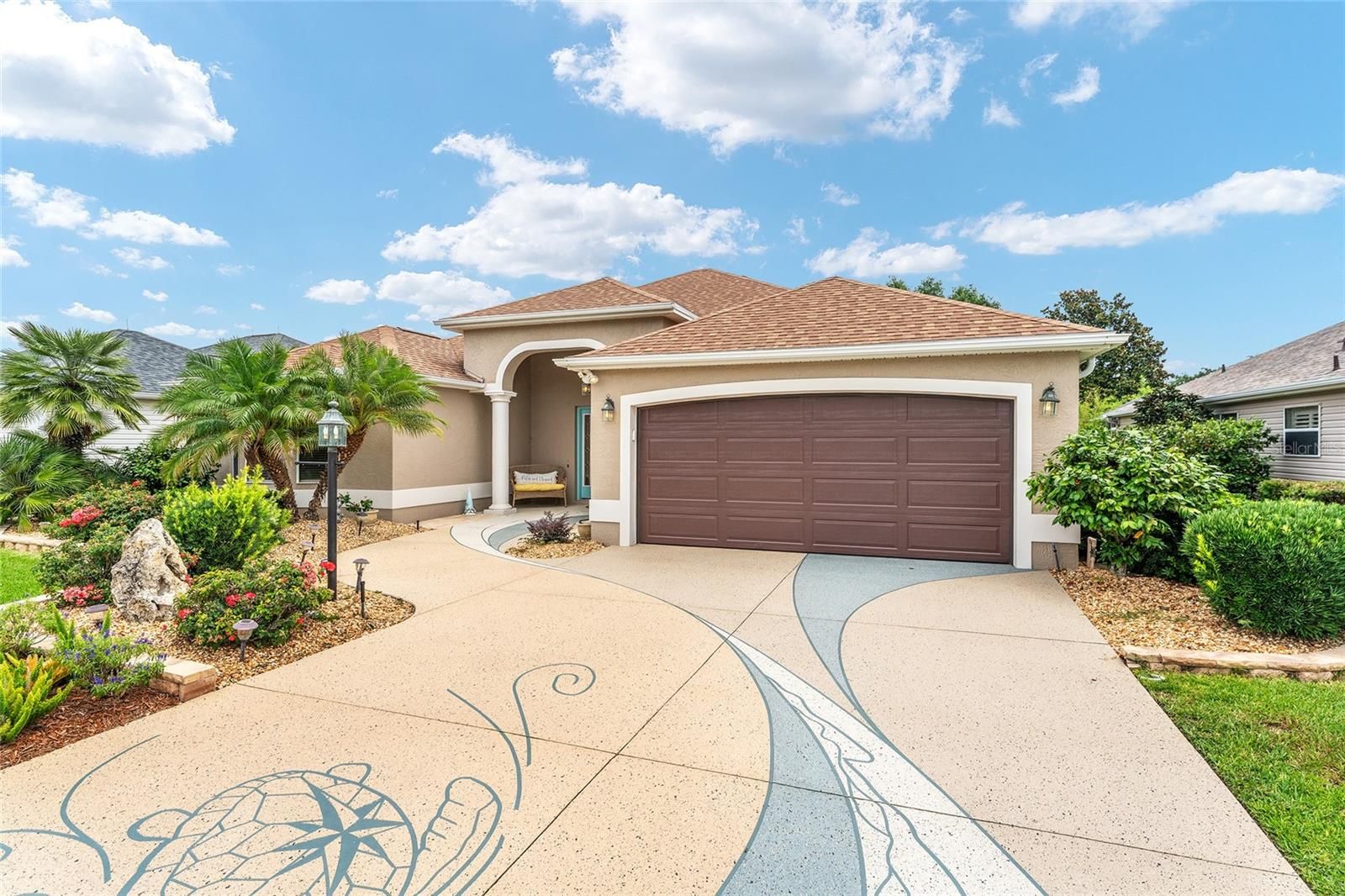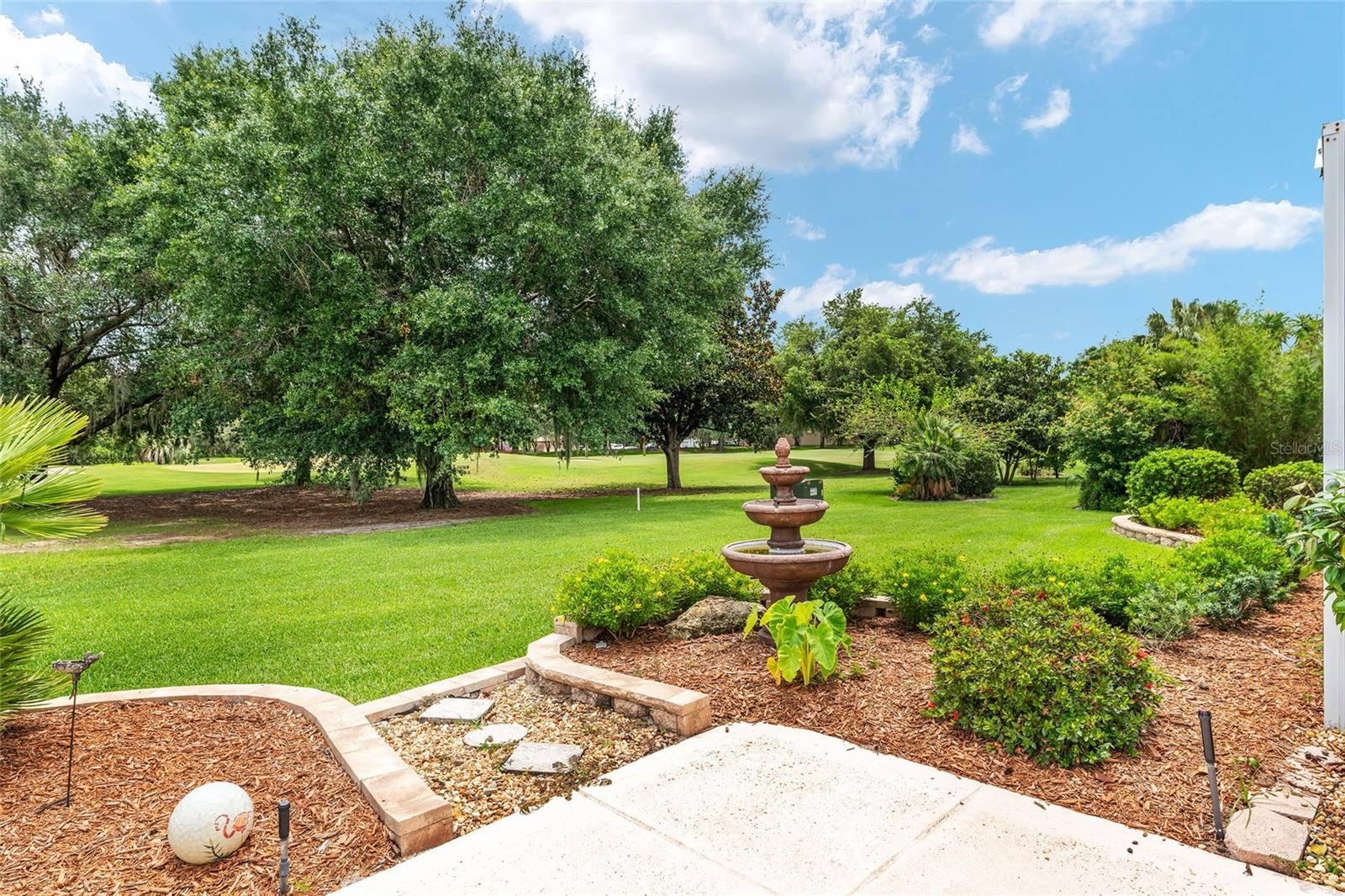 This stylish and desirable 3/2, 1831sf Sierra Model home is located near the 15th hole of the Tierra del Sol golf course. PRIVATE VIEW OF THE GOLF COURSE W/ NO CART PATH IN SITE! It has a SPLIT PLAN which allows guests their own private bath and bedroom area. The kitchen is bright and spacious with STAINLESS STEEL APPLIANCES, BREAKFAST BAR, WHITE CABINETS, GRANITE COUNTERS/ BACKSPLASH, and a space for a dining table that overlooks the greens. NEUTRAL Interior paint. Great bedroom sizes. Large screened-in lanai and birdcage with OUTDOOR SINK and in-ground hot tub. Elevated PROFESSIONALLY LANDSCAPED and the exterior is BLOCK & STUCCO. TANKLESS H20 HTR, NEW ROOF, NEW WASHER/ DRYER, NEW DECORATIVE DRIVEWAY, EPOXY garage floor. HIGH END WHOLE HOUSE FILTRATION and WATER SOFTENING SYSTEM. NO BOND. Some of the lovely furnishings are available separately. Superior location, just minutes from 466 shopping, restaurants, banks, pools and Rec areas. SHORT CART RIDE to Sumter Lndg. This home is unique and beautiful so don’t miss the opportunity to see it.