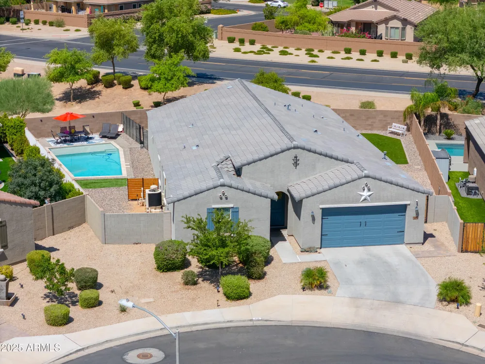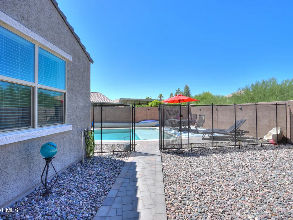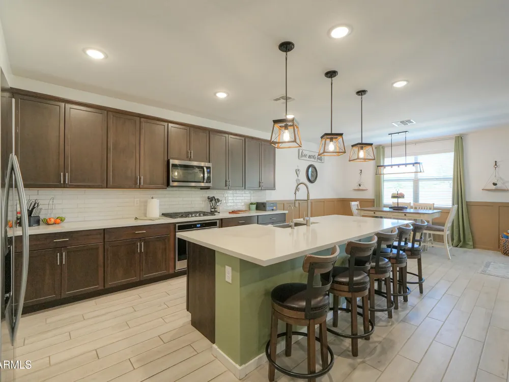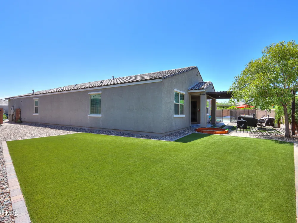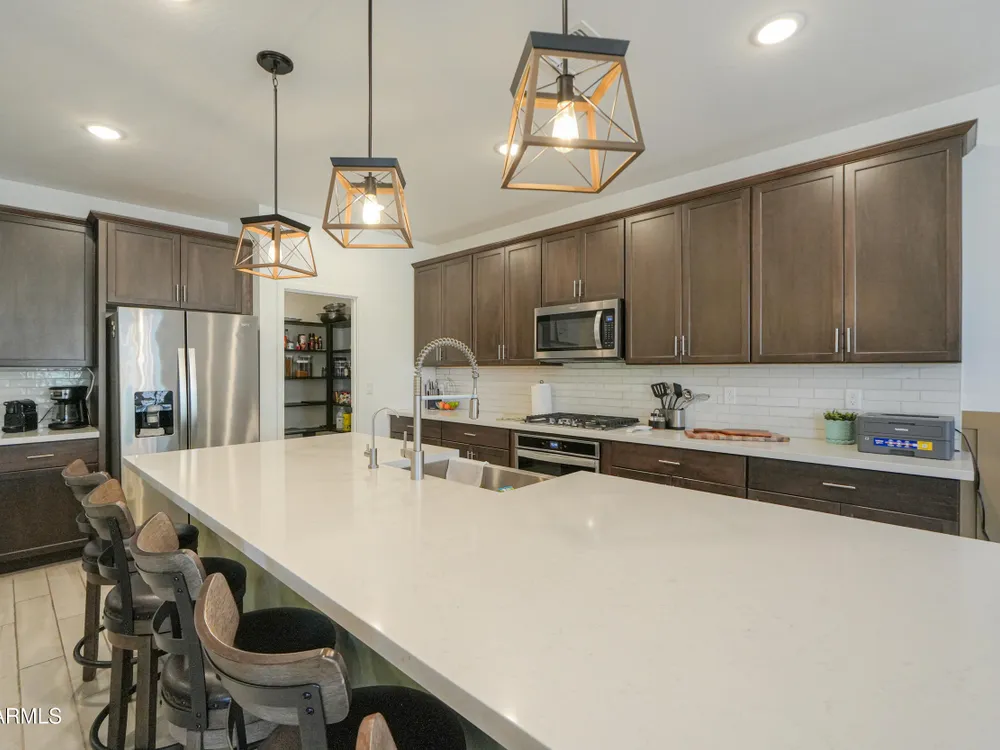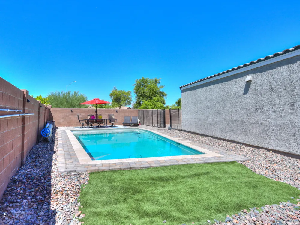 What an absolutely beautiful home! This 5 bedroom, 3 bath home with a split floorplan features a gorgeous master bath with a large walk-in closet, huge eat-in kitchen with Quartz countertops, cabinets galore, farm sink, walk-in pantry, kitchen island, breakfast bar and all appliances. Additional features include wood tile flooring, ceiling fans throughout, utility sink in laundry, triple panel sliding doors to the patio, R/O system with water softener and a 3 car tandem garage. Two of the bedrooms can be converted to a guest quarter if needed, each bedroom has a walk-in closet. The backyard is an oasis, covered patio, pergola, artificial turf and a salt water pool that is temperature controlled (heating & cooling). Located in the family section of Mission Royale, you also have access to the waterpark, playground and walking/biking paths. Conveniently located to shopping, dining and the freeway leading to both Tucson or Phoenix.