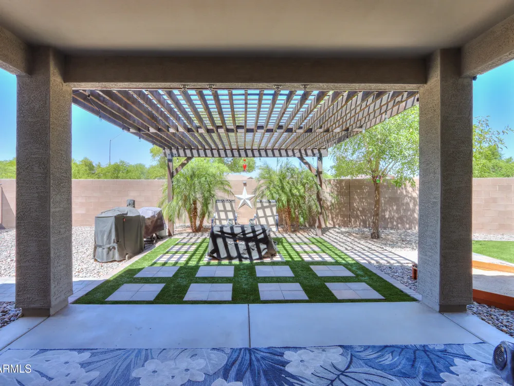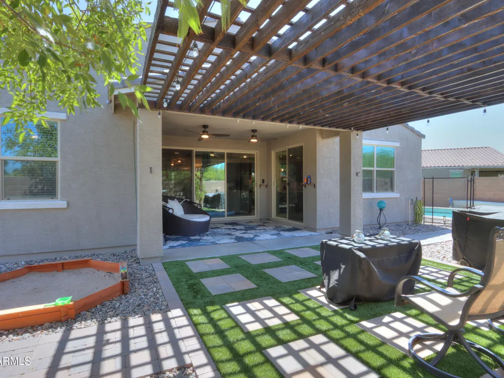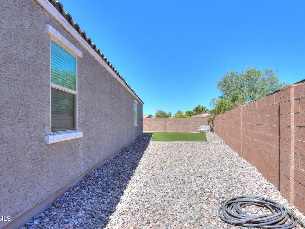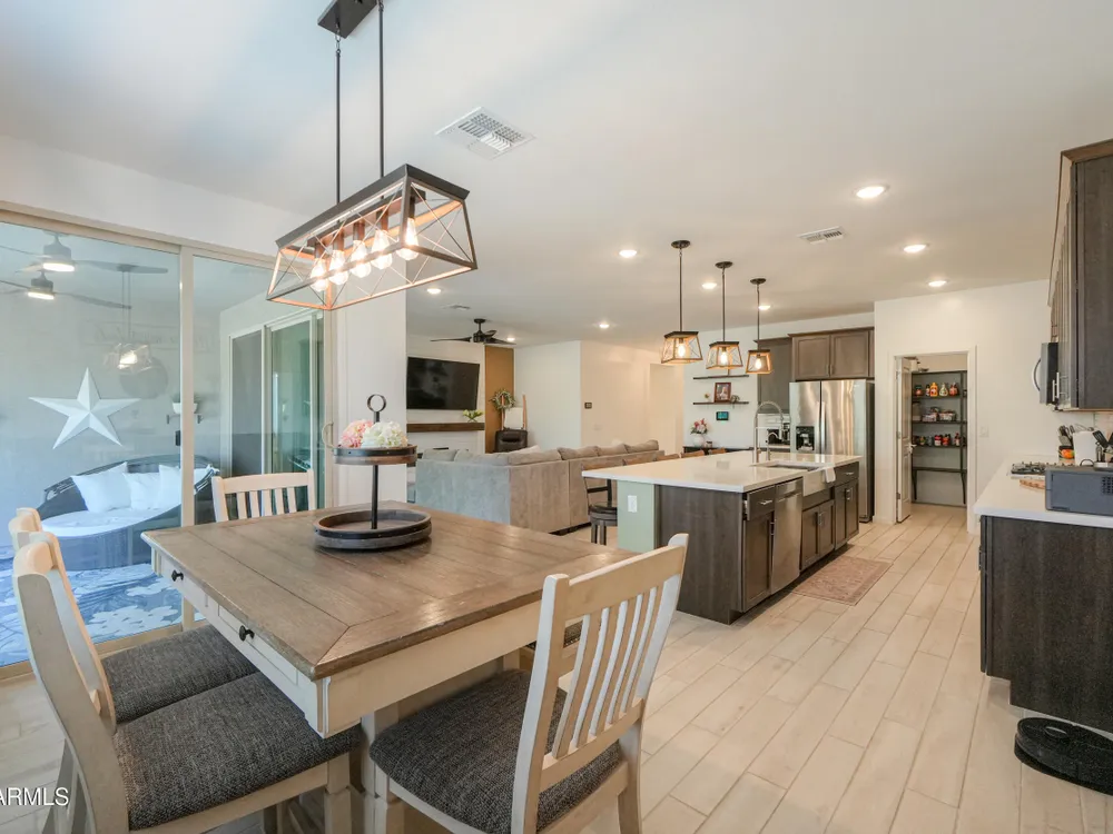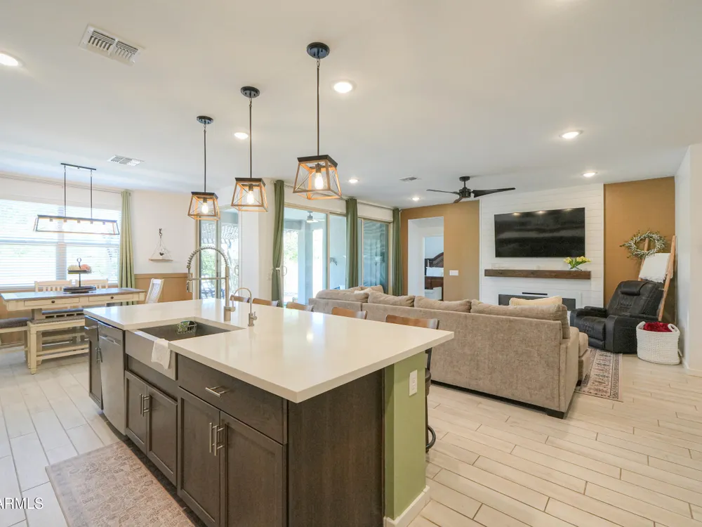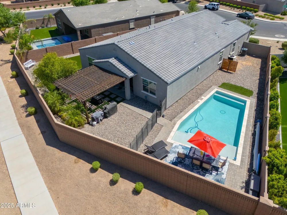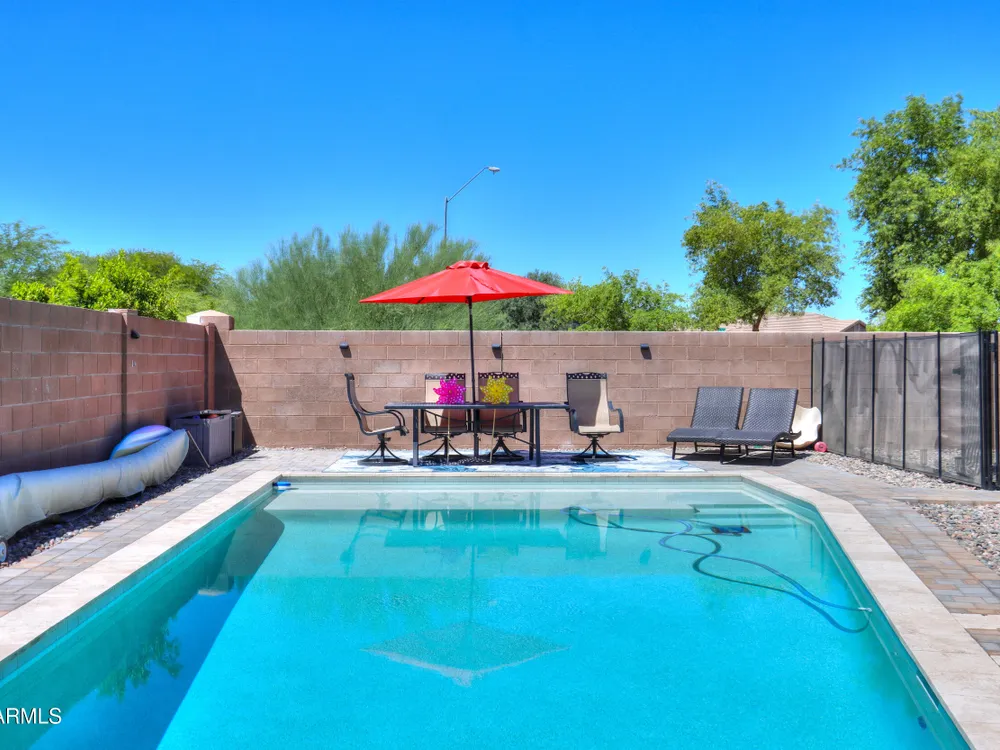What an absolutely beautiful home! This 5 bedroom, 3 bath home with a split floorplan features a gorgeous master bath with a large walk-in closet, huge eat-in kitchen with Quartz countertops, cabinets galore, farm sink, walk-in pantry, kitchen island, breakfast bar and all appliances. Additional features include wood tile flooring, ceiling fans throughout, utility sink in laundry, triple panel sliding doors to the patio, R/O system with water softener and a 3 car tandem garage. Two of the bedrooms can be converted to a guest quarter if needed, each bedroom has a walk-in closet. The backyard is an oasis, covered patio, pergola, artificial turf and a salt water pool that is temperature controlled (heating & cooling). Located in the family section of Mission Royale, you also have access to the waterpark, playground and walking/biking paths. Conveniently located to shopping, dining and the freeway leading to both Tucson or Phoenix.