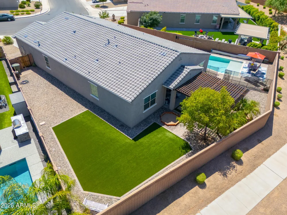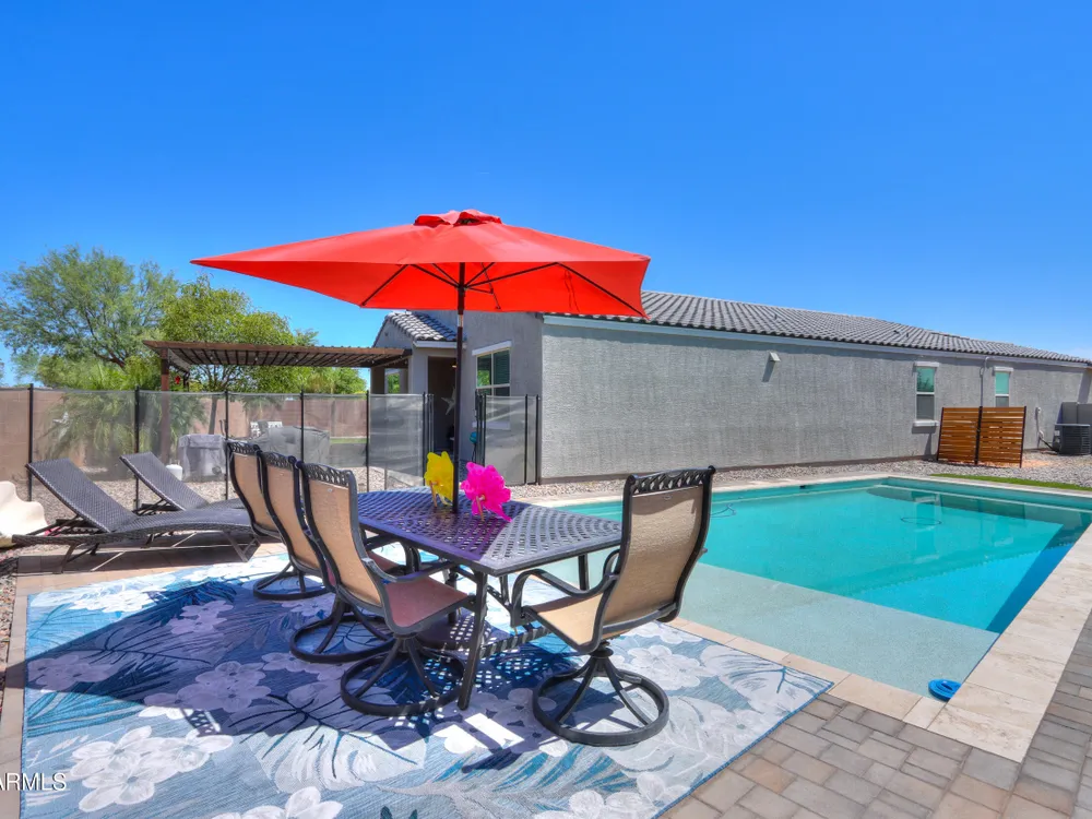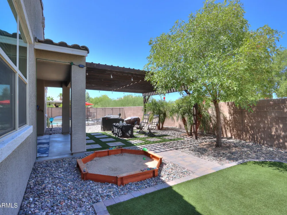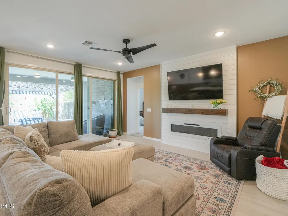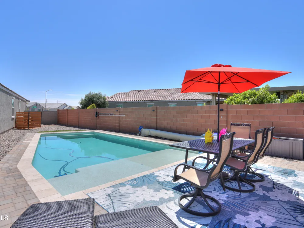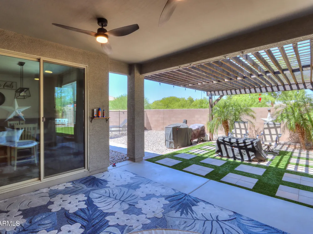 What an absolutely beautiful home! This 5 bedroom, 3 bath home with a split floorplan features a gorgeous master bath with a large walk-in closet, huge eat-in kitchen with Quartz countertops, cabinets galore, farm sink, walk-in pantry, kitchen island, breakfast bar and all appliances. Additional features include wood tile flooring, ceiling fans throughout, utility sink in laundry, triple panel sliding doors to the patio, R/O system with water softener and a 3 car tandem garage. Two of the bedrooms can be converted to a guest quarter if needed, each bedroom has a walk-in closet. The backyard is an oasis, covered patio, pergola, artificial turf and a salt water pool that is temperature controlled (heating & cooling). Located in the family section of Mission Royale, you also have access to the waterpark, playground and walking/biking paths. Conveniently located to shopping, dining and the freeway leading to both Tucson or Phoenix.