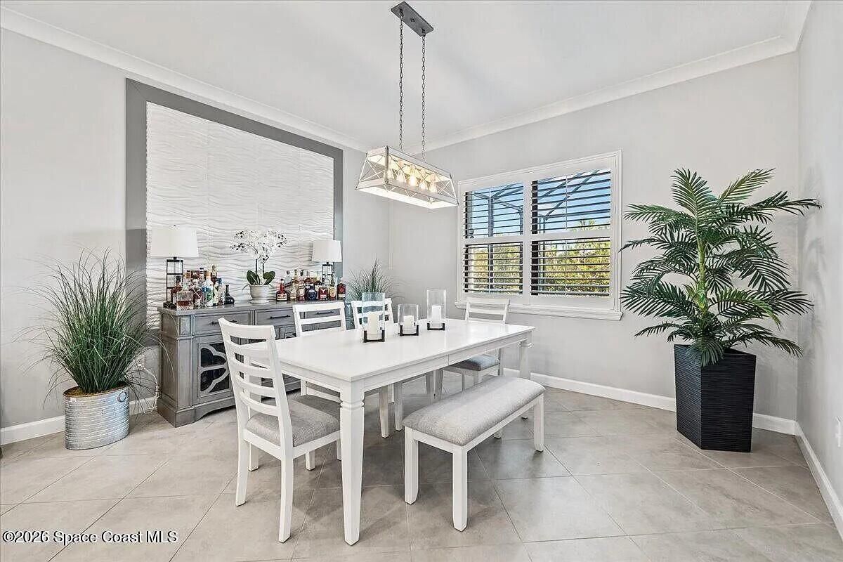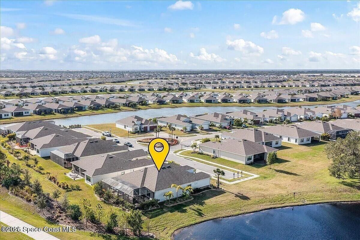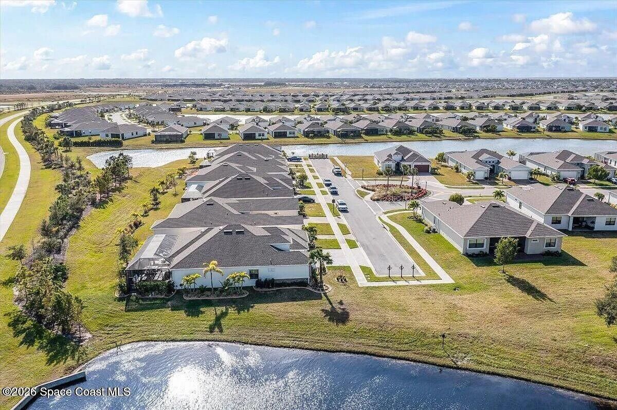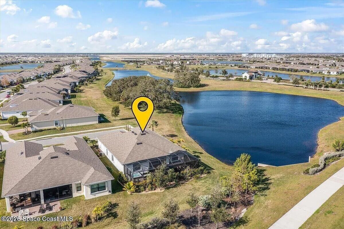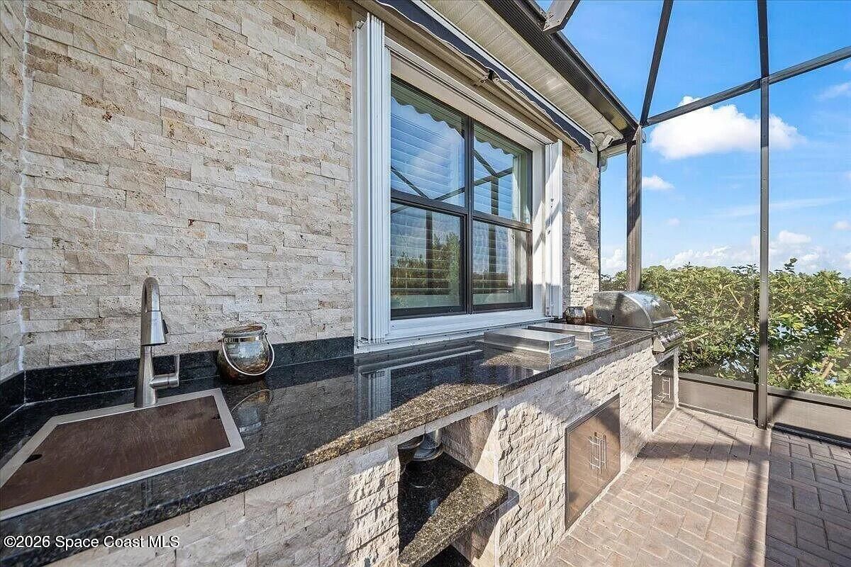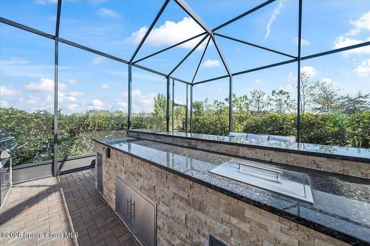 Welcome to this turn-key home with lake view in the sought after 55+ Bridgewater community of Viera. Located on a deed end, this property offers privacy, water view, and an open-concept layout with kitchen featuring large island and stainless steel appliances. The extended screened enclosure includes a summer kitchen, bar, granite countertop, and a wrap-around deck. Interior upgrades include plantation shutters, crown molding, faux beams, recessed lighting with smart dimmers, and a built in office/den. Additional features include hurricane shutters, decorative curbing, river rock landscaping, ring system and a garage with epoxy flooring, EV outlet and overhead storage, Community amenities are outstanding, include clubhouse, heated pool, tennis and pickleball courts, bocce and fitness center. Close to shopping, restaurants and beaches.
