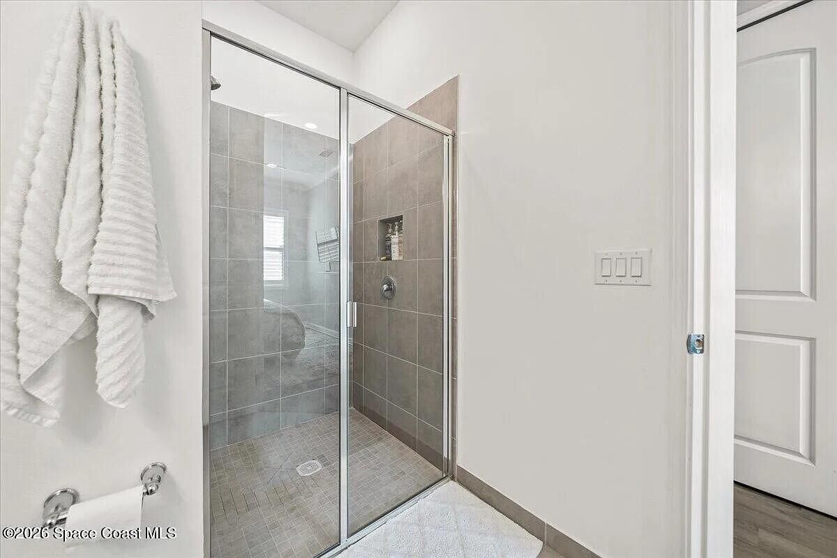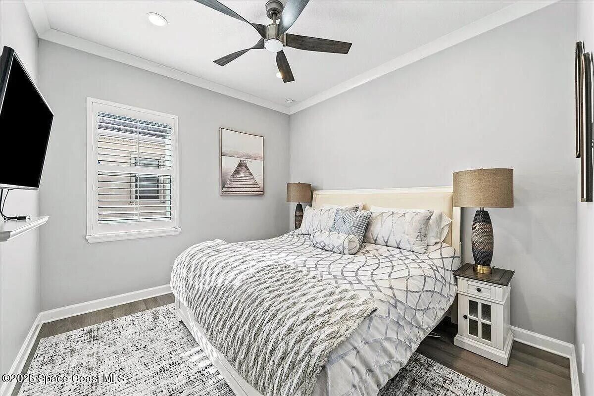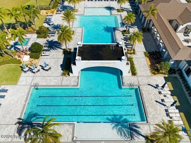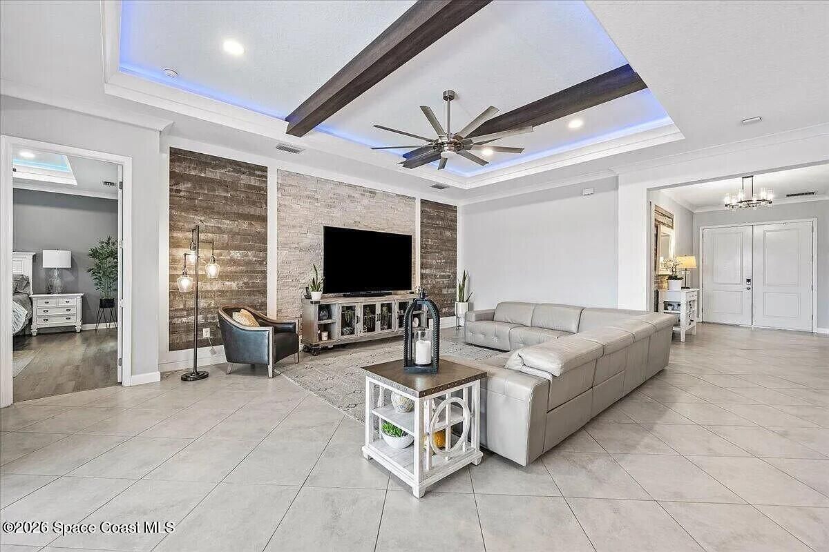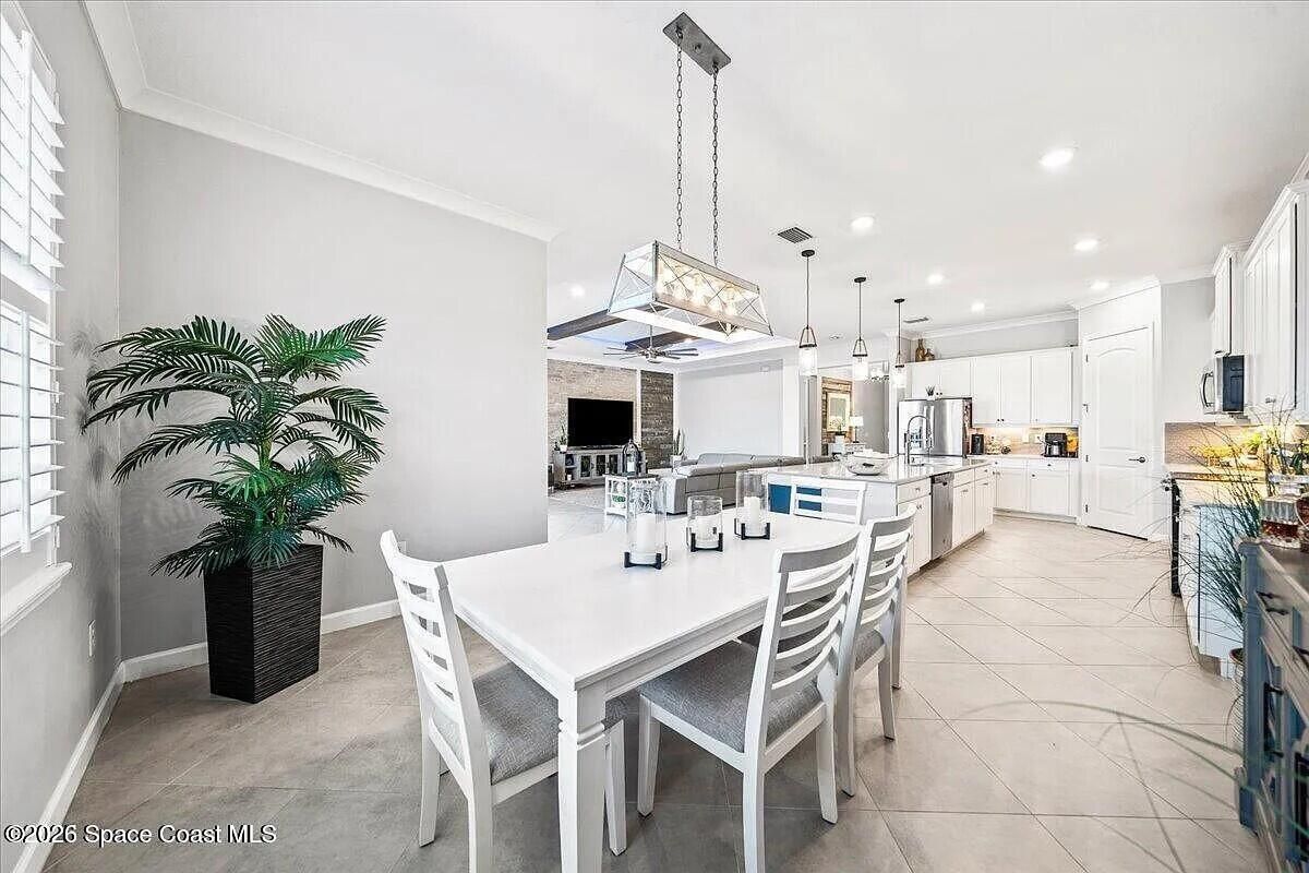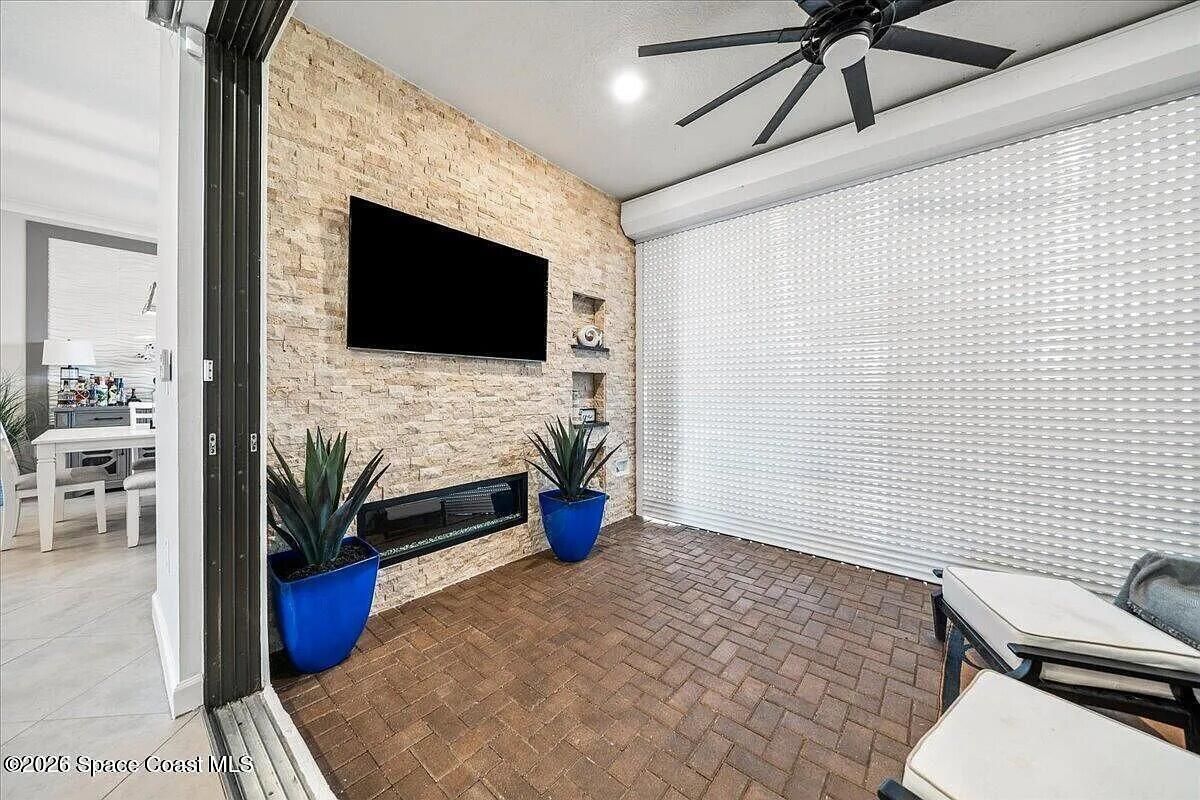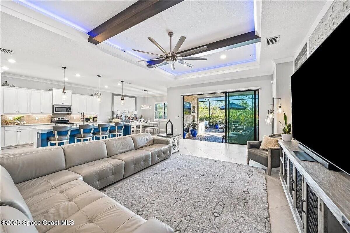Welcome to this turn-key home with lake view in the sought after 55+ Bridgewater community of Viera. Located on a deed end, this property offers privacy, water view, and an open-concept layout with kitchen featuring large island and stainless steel appliances. The extended screened enclosure includes a summer kitchen, bar, granite countertop, and a wrap-around deck. Interior upgrades include plantation shutters, crown molding, faux beams, recessed lighting with smart dimmers, and a built in office/den. Additional features include hurricane shutters, decorative curbing, river rock landscaping, ring system and a garage with epoxy flooring, EV outlet and overhead storage, Community amenities are outstanding, include clubhouse, heated pool, tennis and pickleball courts, bocce and fitness center. Close to shopping, restaurants and beaches.