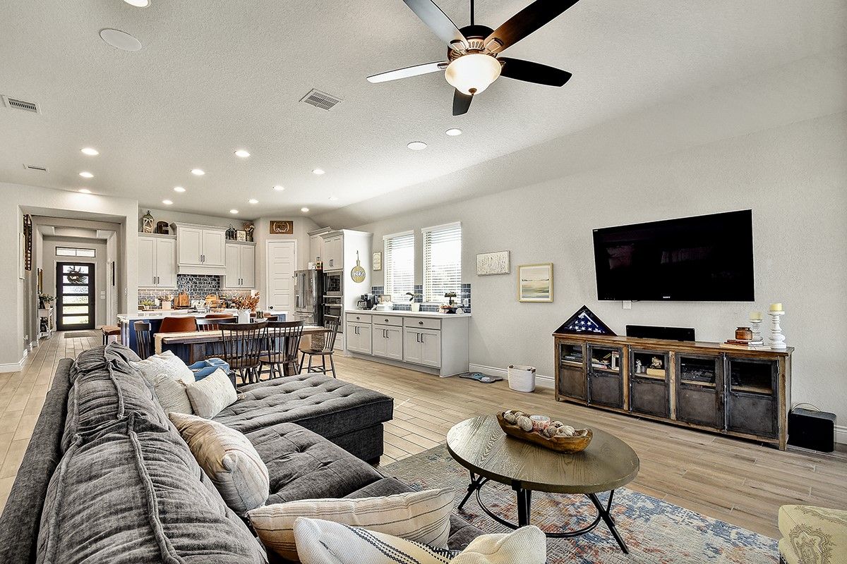 Welcome to this exceptional 3-bedroom, 3-bath Perry Home in vibrant New Braunfels—where thoughtful design, modern finishes, and community convenience come together seamlessly. Situated on a prime corner lot, this home features striking curb appeal with light stone exterior, manicured landscaping, and a warm, inviting entry. Inside, you’re greeted by a long, elegant hallway accented with tall ceilings and natural light, leading you into the heart of the home. The open-concept kitchen is a true showpiece, offering a large island, sleek tile backsplash, upgraded stainless-steel appliances, and abundant custom cabinetry. Perfect for hosting or everyday gatherings, the kitchen flows effortlessly into the main living and dining areas. Each bedroom is generously sized, and the home includes three full baths for added privacy and convenience. A 3-car tandem garage offers versatility for parking, storage, or workspace needs. This sought-after community features on-site schools, pocket parks, walking trails, and a refreshing neighborhood pool, making daily life both convenient and enjoyable. Nearby shopping, dining, and commercial hubs add to the unbeatable location. Crafted with the quality and timeless style Perry Homes is known for, this property blends comfort, character, and convenience—making it a must-see in New Braunfels.