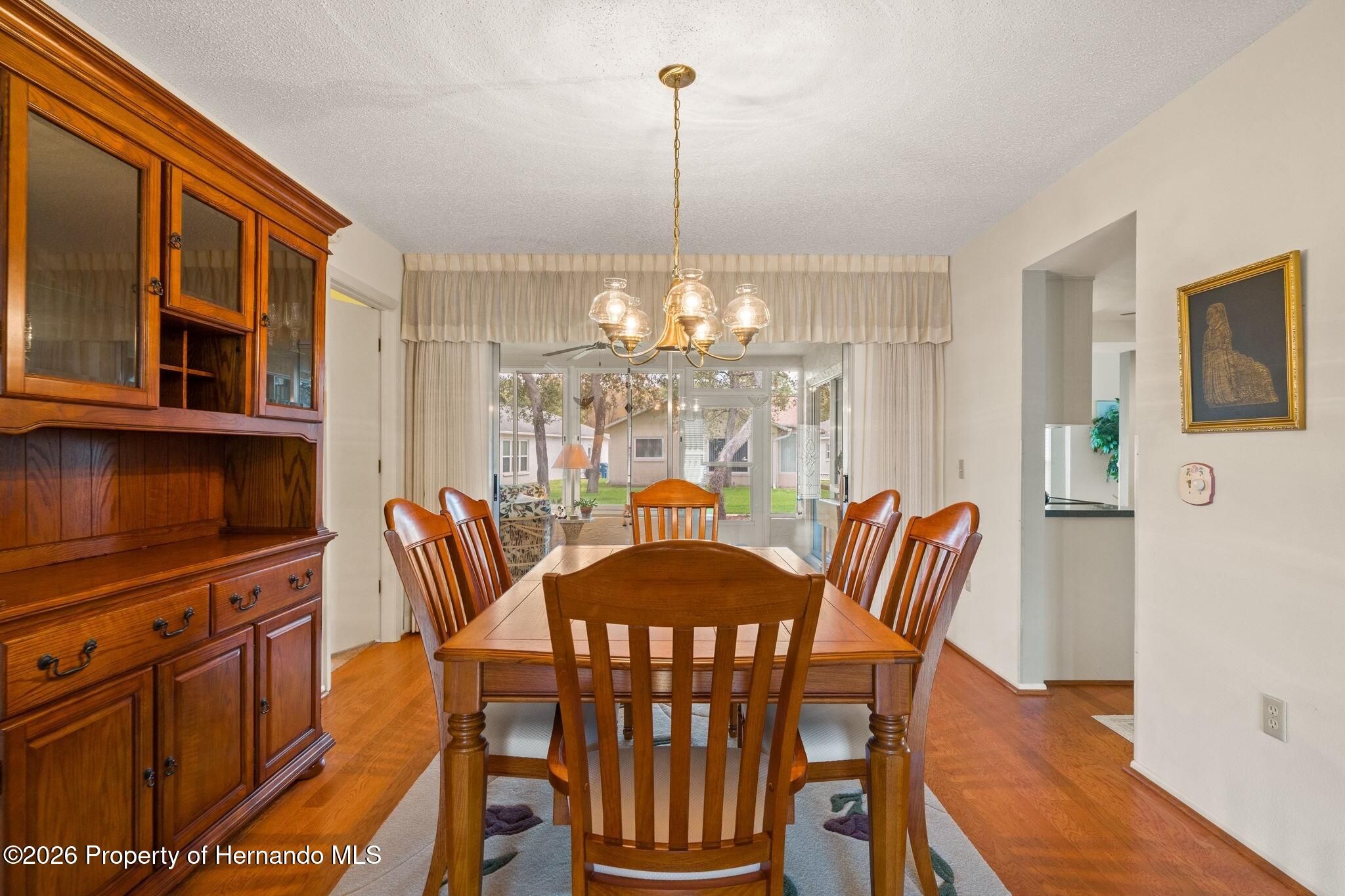 Immaculate 2 bedroom, 2 bath home in award-winning Timber Pines! This desirable Palm Beach model offers approximately 1,800 square feet of comfortable living space with beautiful hardwood flooring and tiled wet areas throughout. Enter into the bright living and dining room combination that flows seamlessly into the kitchen and opens to a large lanai, perfect for relaxing or entertaining. Just beyond the lanai is a beautiful paver patio, ideal for outdoor living and enjoying Florida's sunshine. The updated kitchen features newer appliances, plenty of cabinet and counter space, and a charming kitchen nook. The kitchen opens to a spacious family room with vaulted ceilings, creating a light and airy feel. The guest bedroom is conveniently located near the hall bath, which features tile flooring and a tub/shower combination. The spacious primary bedroom offers two walk-in closets and an updated ensuite bath with Corian countertops and a large step-in shower. Major updates include HVAC (2023) with new blown-in insulation, roof (2019), and newer windows, providing comfort and efficiency. This home is being sold mostly furnished, making it an easy move-in opportunity to begin enjoying retirement. Enjoy the exceptional lifestyle Timber Pines offers--a gated 55+ active adult community featuring 4 pristine golf courses, award-winning pickleball center, state-of-the-art fitness & wellness center, clubhouse & restaurant, performing arts center, resident activity center, 2 geothermal pools, tennis, bocce, billiards, wood shop, arts & crafts center, Paws Park, and 100+ clubs & activities. HOA includes Spectrum high-speed internet, 1 HD box, and 1 cloud-based or HD DVR box. CALL TODAY!