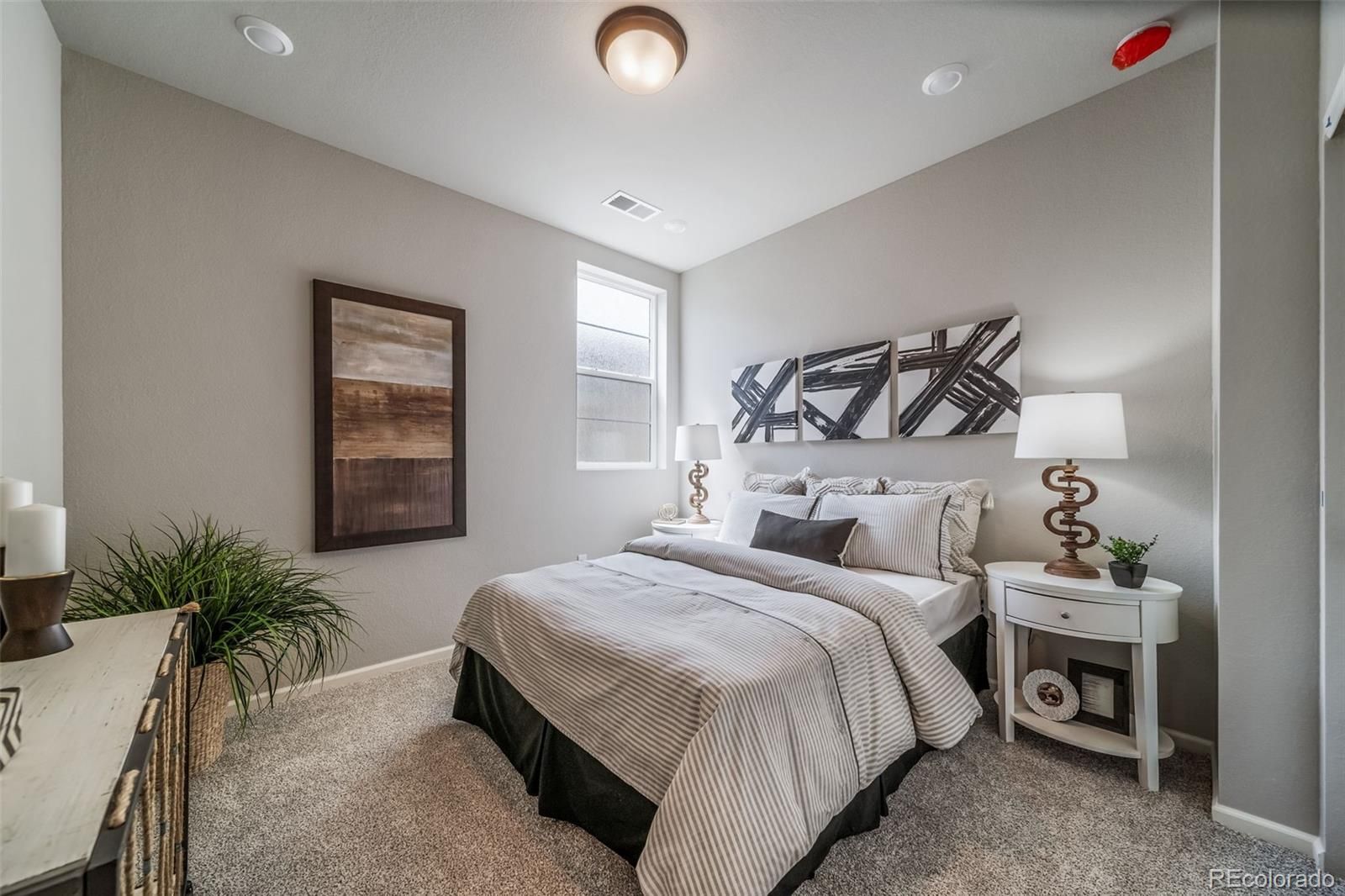The Sojourner- Resort style living at it’s finest located at the Reserve in Green Valley Ranch, Aurora. This charming home offers 1409 sq.ft. with 2 bedrooms, 2 bathrooms, open great room living space and a 2-car attached garage. The primary suite offers a spa shower experience with tile surround and bench seat and a walk-in closet. The smartly designed kitchen has an island with quartz countertops and seating. The dining room/great room are perfect for large or small gatherings and the enlarged patio is perfect for your outdoor enjoyment and entertaining. The Farmhouse lifestyle center has a dedicated Lifestyle director who creates engaging events and programs year round. The completed Farmhouse is a 10,000 sq.ft. community center that is the very essence of active living and features a dedicated fitness room, movement studio, special events space and demonstration kitchen plus pickleball and tennis courts, bocce ball courts, a large covered patio and grass event/activity area plus a beach-entry pool and a hot tub with year round access. Residents will have an array of activities to choose from. Available NOW! Ask about our $5K flex cash when using our preferred lender.