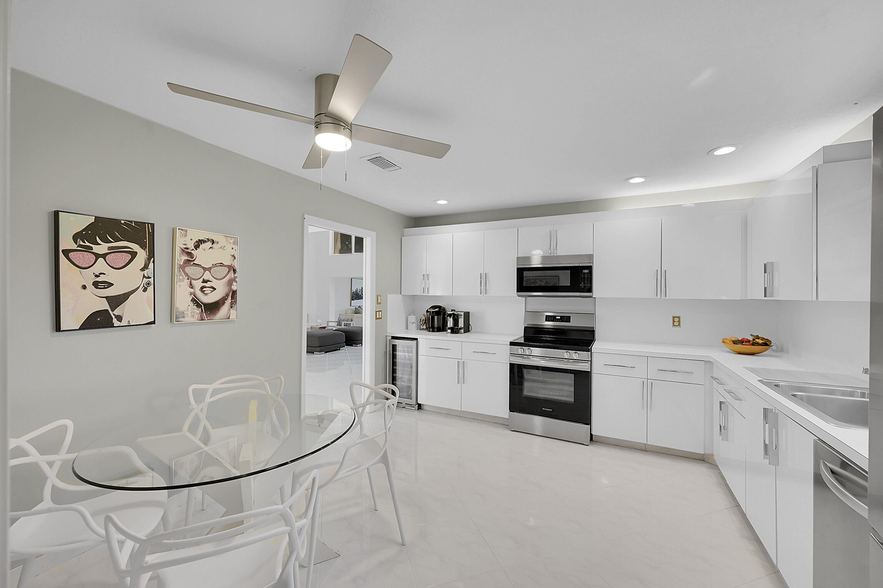 Elegant 3B/R 2 Bath villa. 2500 sq ft of living space. Lake view from a huge glass enclosed patio which can be used for office, 4th bedroom or entertainment space. This corner villa has extended driveway for several cars and a garage Villa is completely tiled with beautiful neutral tile and has been freshly painted and all new fans with remotes. New SS oven and microwave. All SS appliances and a wine cooler. Lots of closet space. Front loading washer and dryer in a big laundry room. Non mandatory club. New roof installed 2023 and has been paid for. Newer AC and hot water heater, Lovely community pool. Guard gate entry.