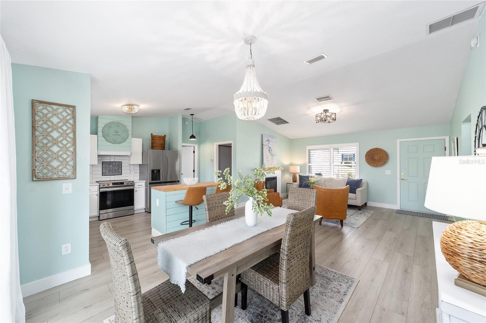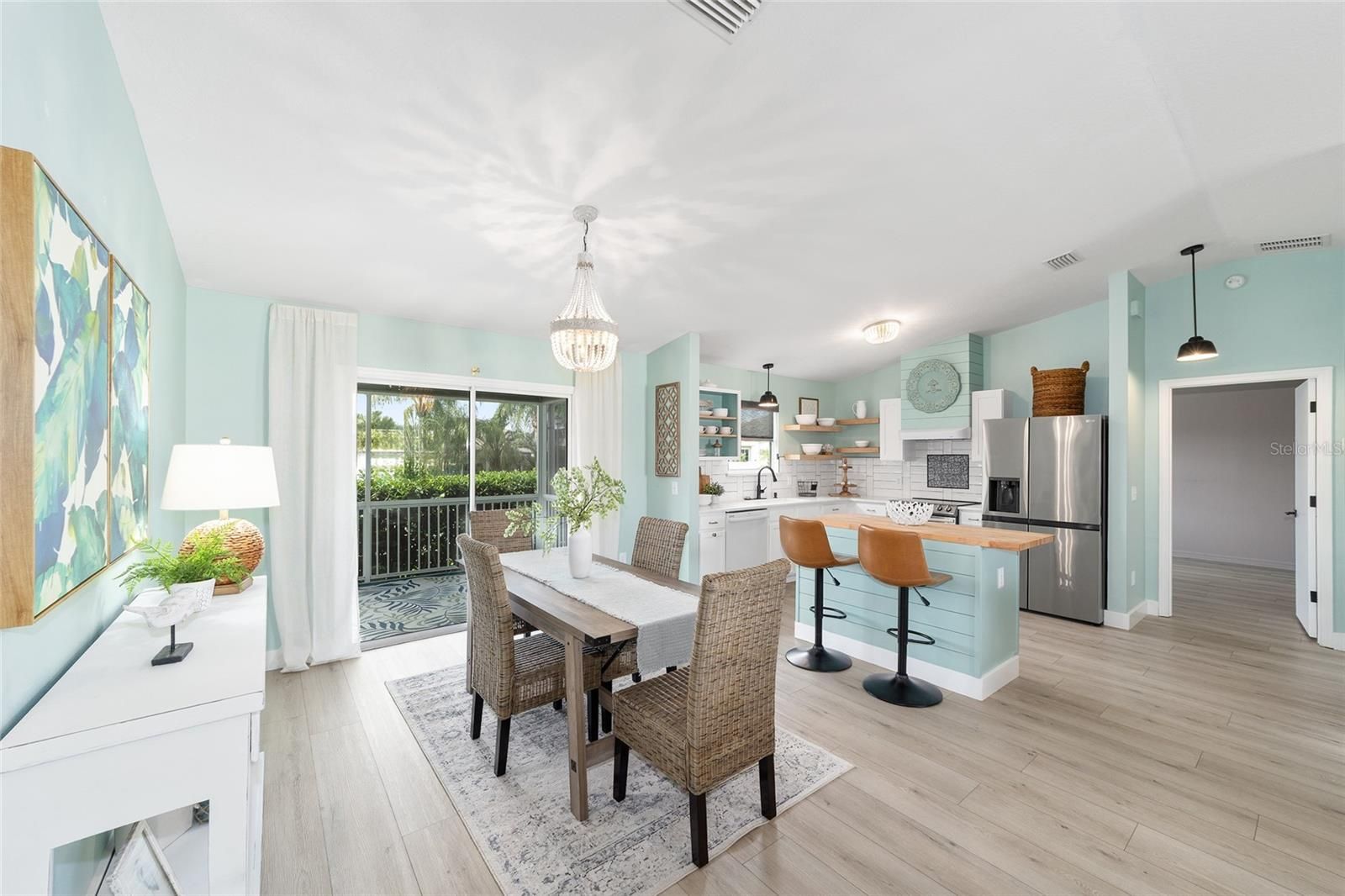 Coastal-Inspired Amarillo in Prime Amelia Location! Step inside this charming Amarillo model in the highly desirable Village of Amelia—perfectly positioned halfway between Brownwood Paddock Square and Lake Sumter Landing, and just minutes from Colony Plaza’s grocery, banking, dining, and everyday conveniences. NEW ROOM COMING! This 3-BEDROOM, 2-BATH home lives bright and airy with an OPEN FLOOR PLAN, abundant NATURAL LIGHT, and VAULTED CEILINGS with modern knockdown texture (no popcorn). Luxury Vinyl Plank flooring flows throughout, complemented by UPDATED LIGHT FIXTURES for a clean, stylish look. The kitchen stands out with STAINLESS STEEL APPLIANCES, modern OPEN SHELVING, QUARTZ COUNTERTOPS, a BUTCHER BLOCK-Topped ISLAND, shiplap range hood, and TILE BACKSPLASH. The PRIMARY BEDROOM offers generous privacy, while the EN-SUITE BATHROOM features GRANITE COUNTERTOPS, TILE FLOORING, and a LOW-MAINTENANCE SHOWER. Guests will appreciate the UPDATED bath with QUARTZ counters and tile accents. Enjoy INDOOR LAUNDRY in the mud room, a 2-CAR GARAGE for storage and vehicles, and a SCREEN-ENCLOSED LANAI with NO “kissing lanais” for enhanced PRIVACY. Located less than a minute from two neighborhood pools and steps from the Duval Family Recreation Center offering PICKLEBALL, TENNIS, BOCCE BALL, BILLIARDS, a FAMILY POOL, and more. A beautifully styled home in an unbeatable spot—ideal for anyone ready to dive into The Villages lifestyle at a smart value! Low Bond Balance of $10,898.