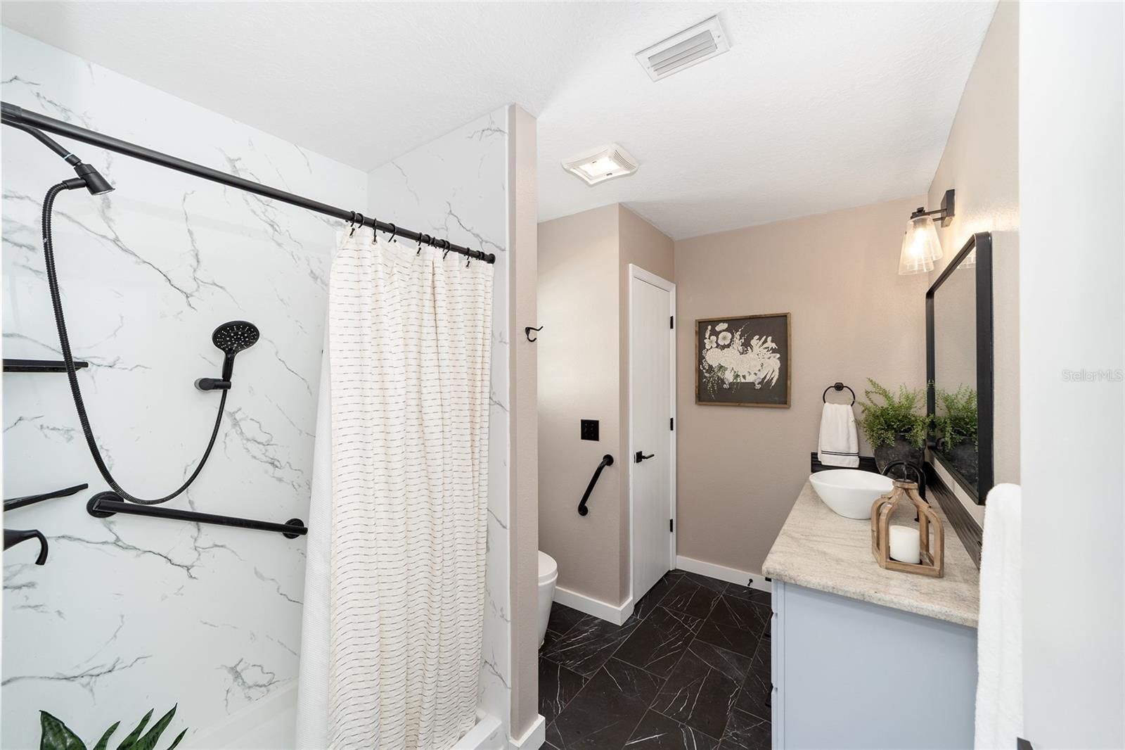 - Ceiling Fan(s), High Ceilings, Kitchen/Family Room Combo, Living/Dining Room, Open Floorplan, Main Level Primary, Split Bedrooms, Stone Counters, Thermostat, Vaulted Ceiling(s), Walk-In Closet(s)