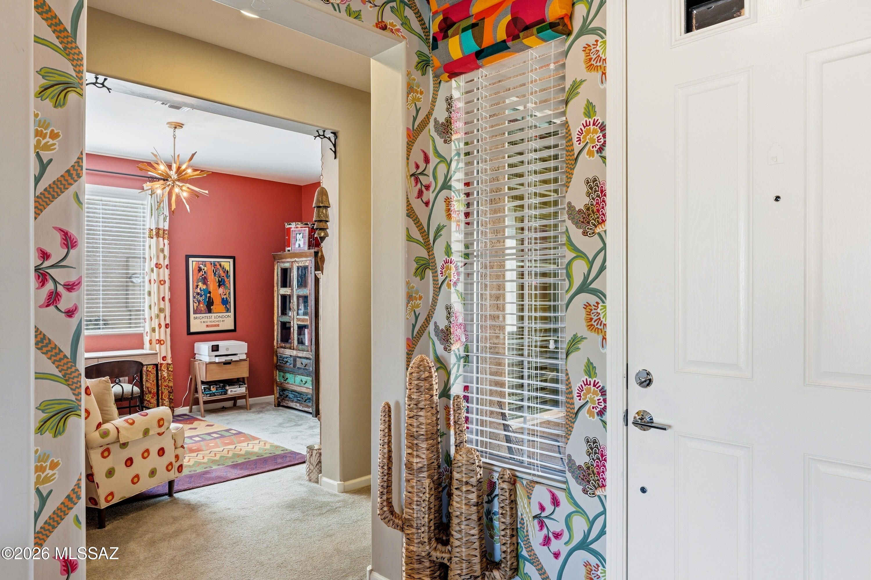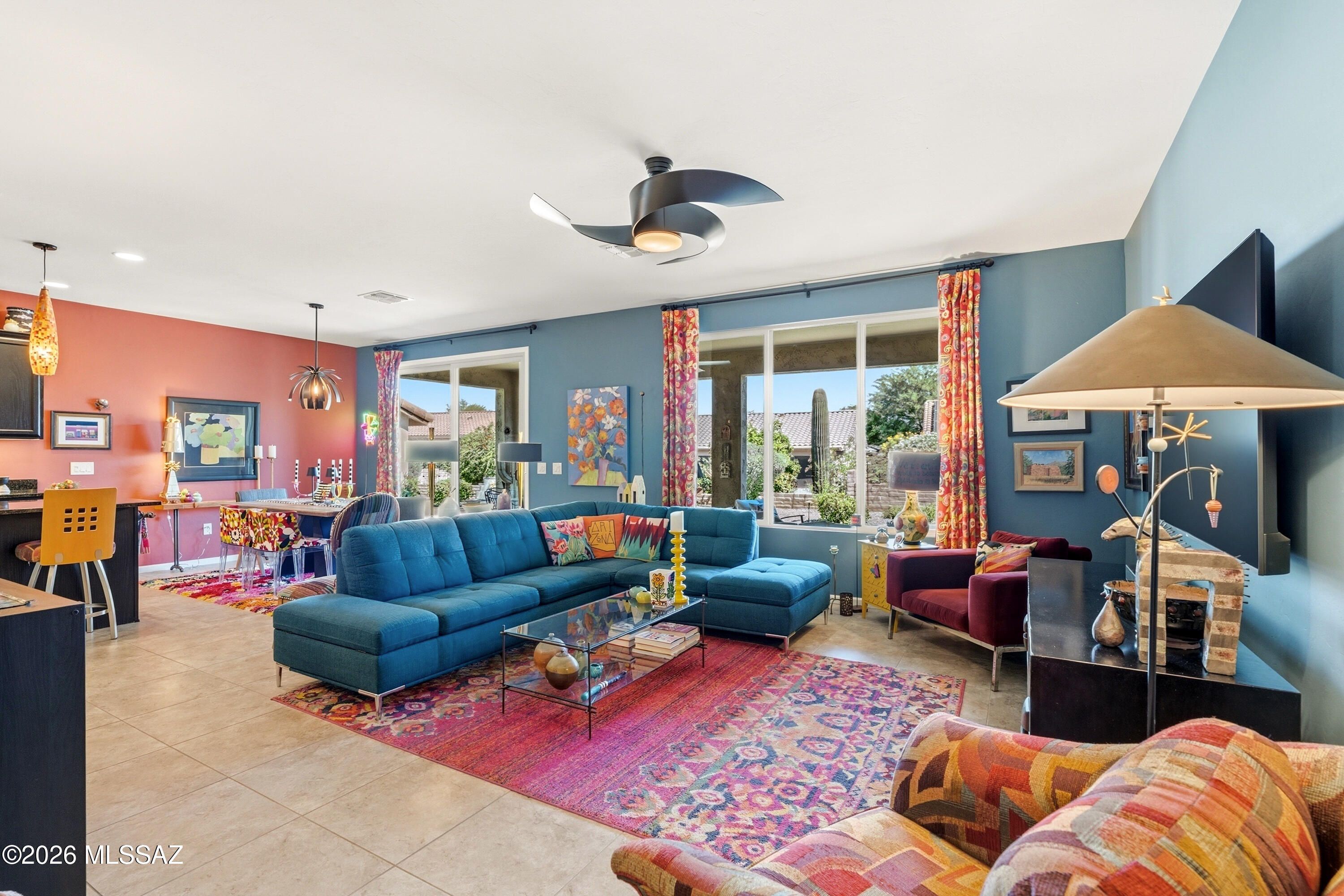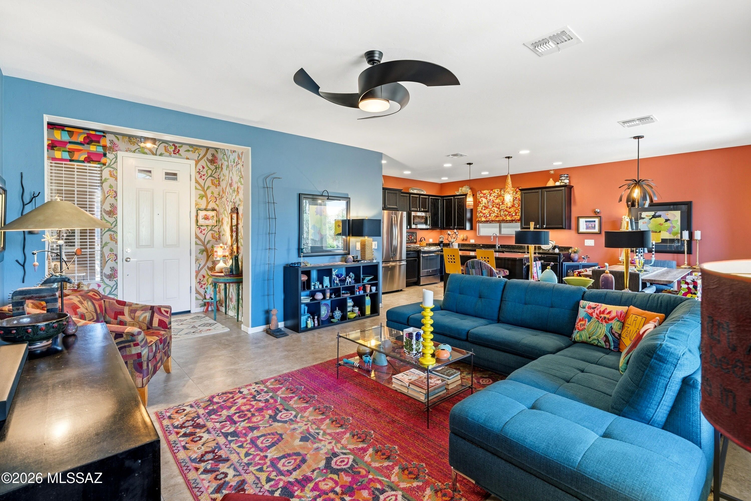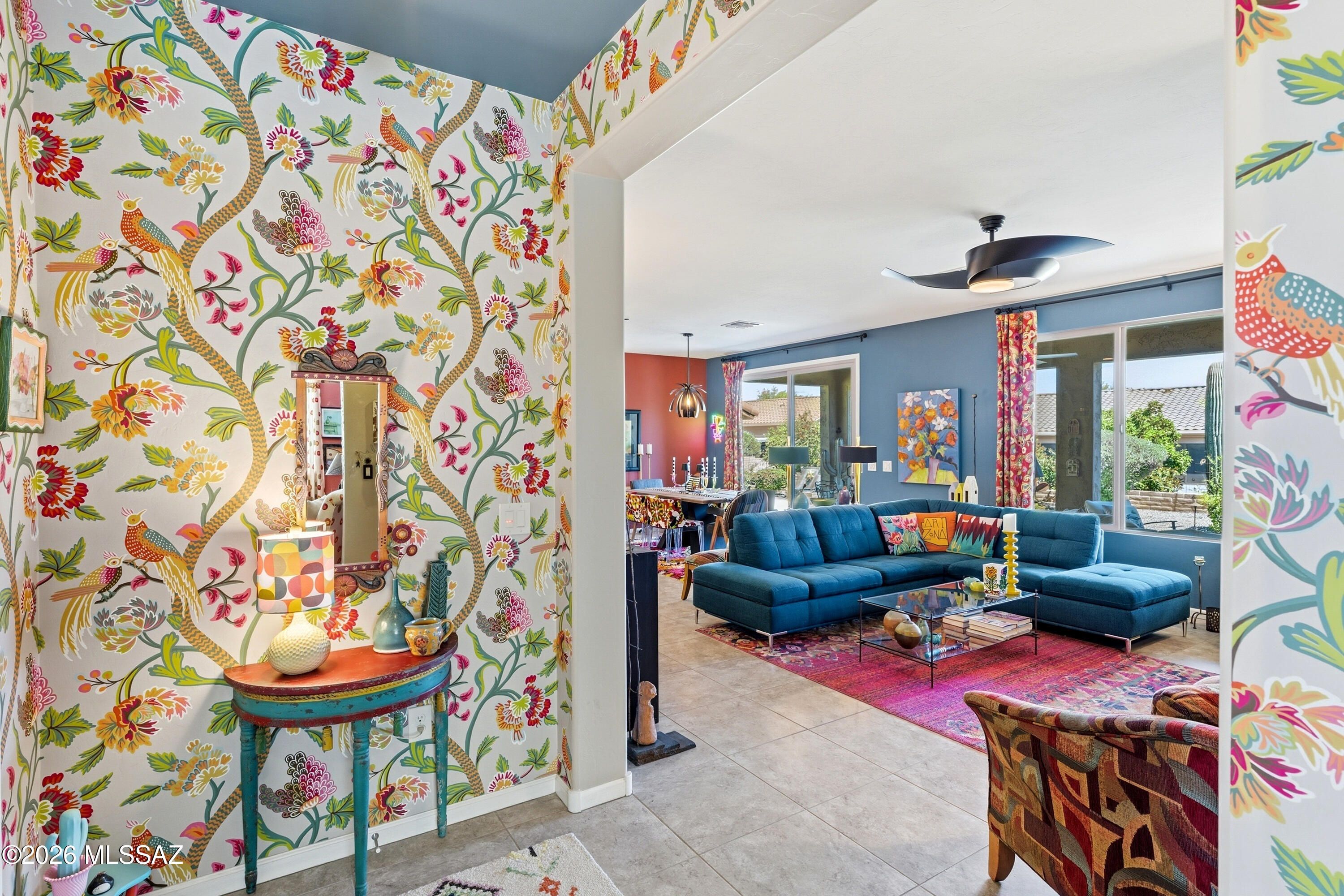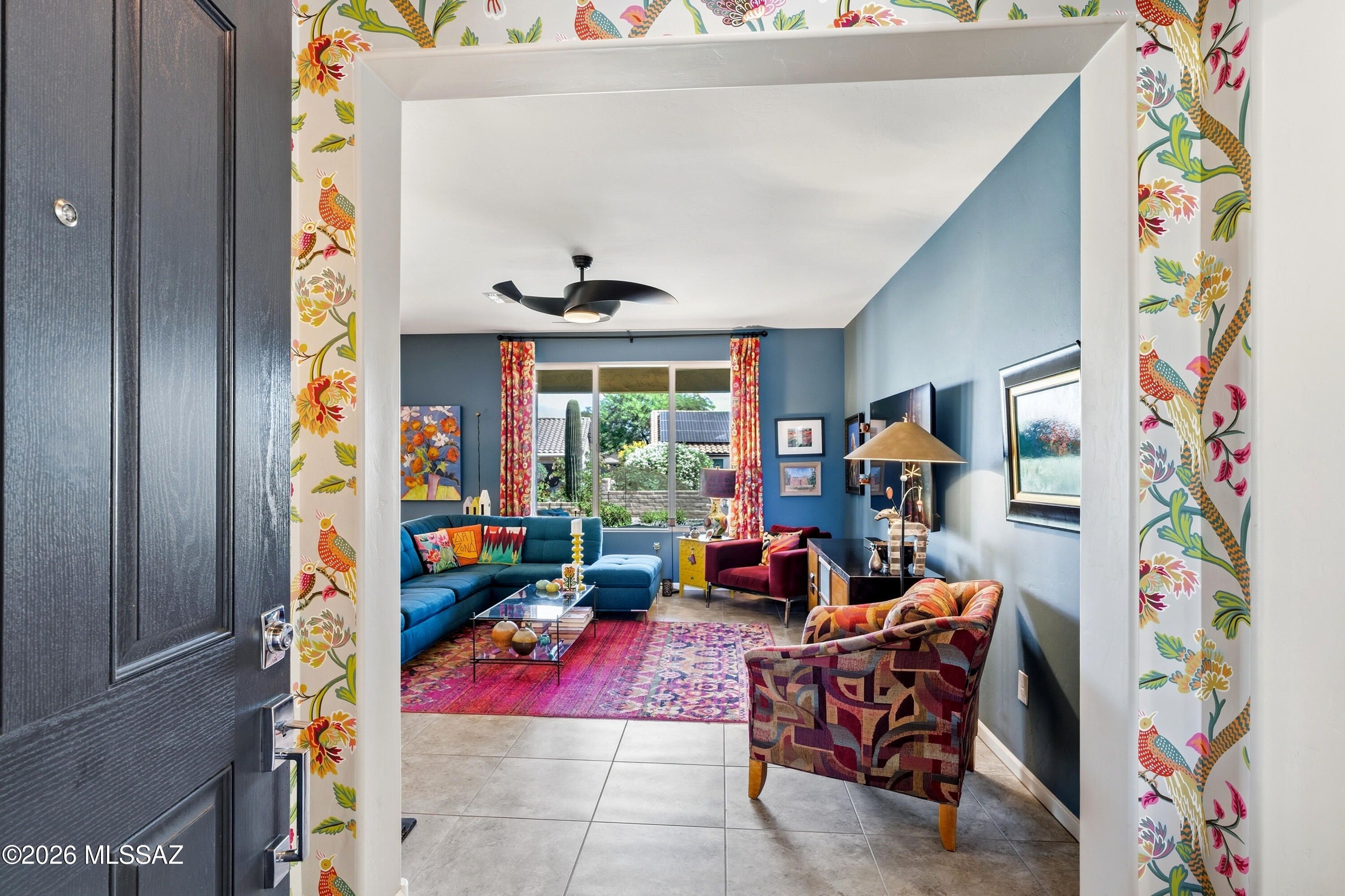 This attractive Southwest-style 1,589 sq. ft. Baja model in Quail Creek offers 2 BR, 2 BA + Den and showcases a warm stucco exterior and inviting curb appeal. Enter through the front wrought iron security door into a welcoming foyer that sets the tone for a bright, eclectic interior filled with color and personality. The entry features vibrant, nature-inspired wallpaper, creating a striking first impression. Beyond, the home opens to a modern great room highlighted by bold design elements, including rich blue and warm coral accent walls, a contemporary ceiling fan, and large windows that flood the space with natural light. The eye-catching kitchen is designed for both function and style, featuring warm coral-red walls, dark wood cabinetry, stainless appliances, granite counters, and is