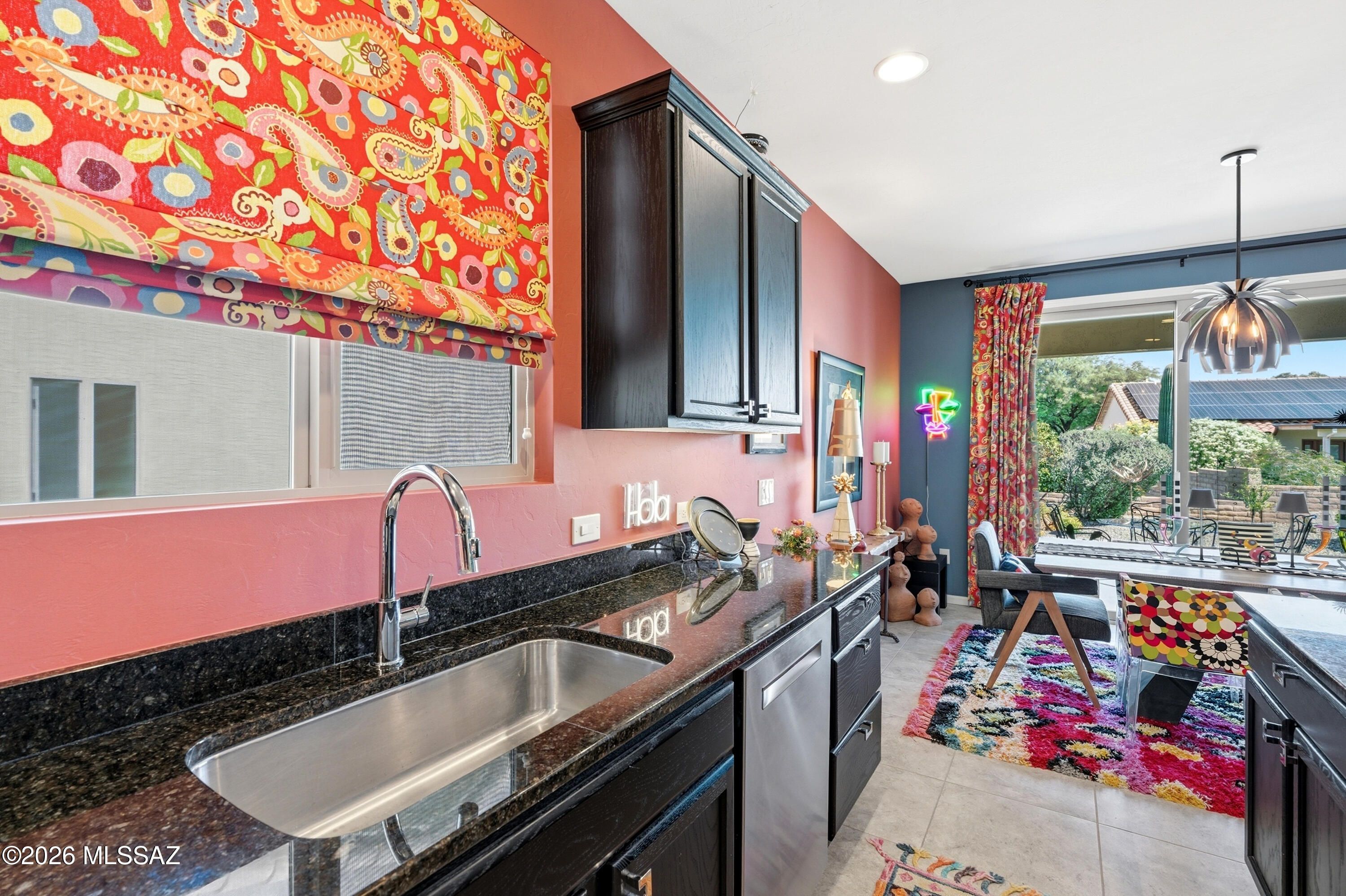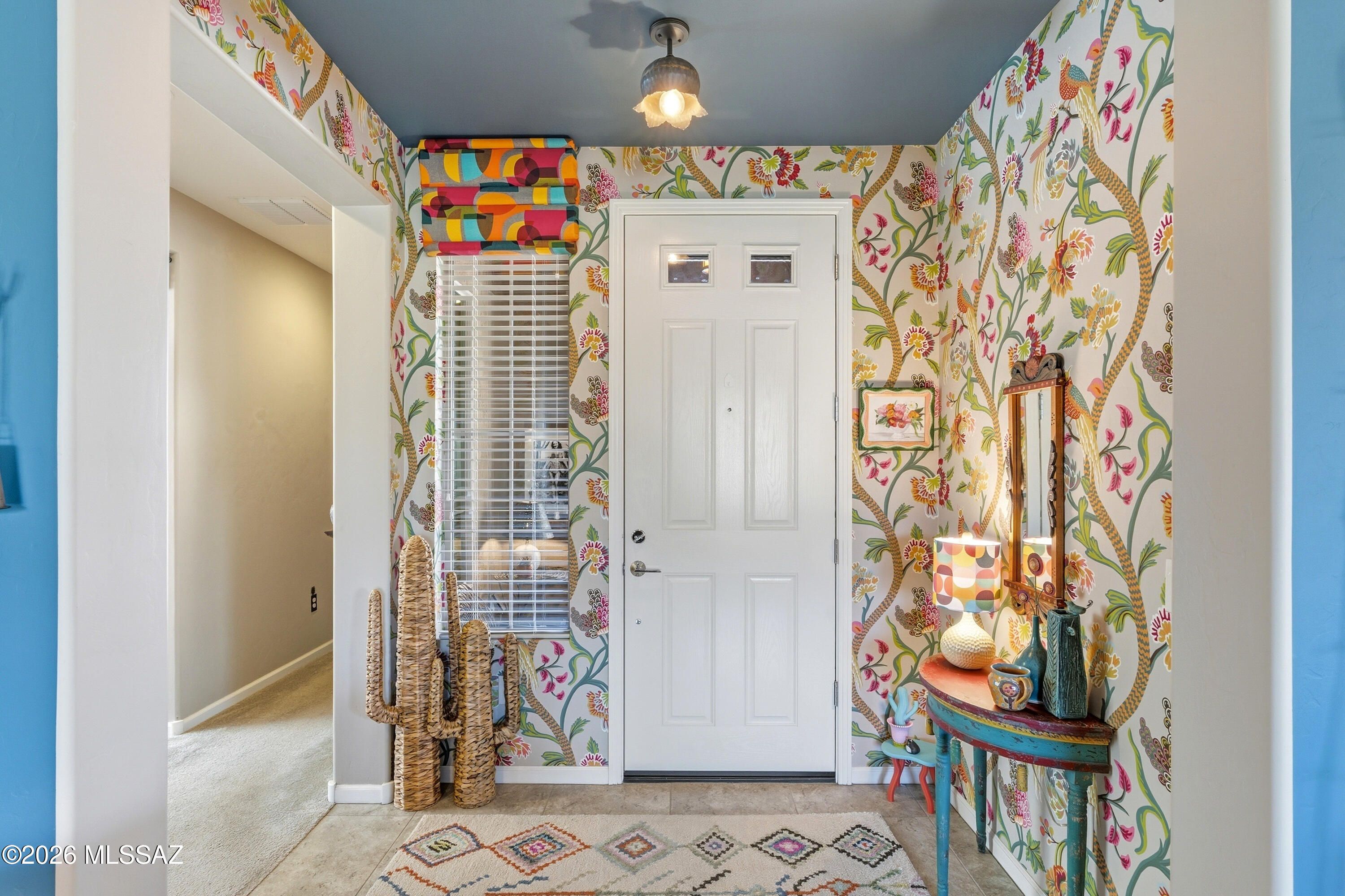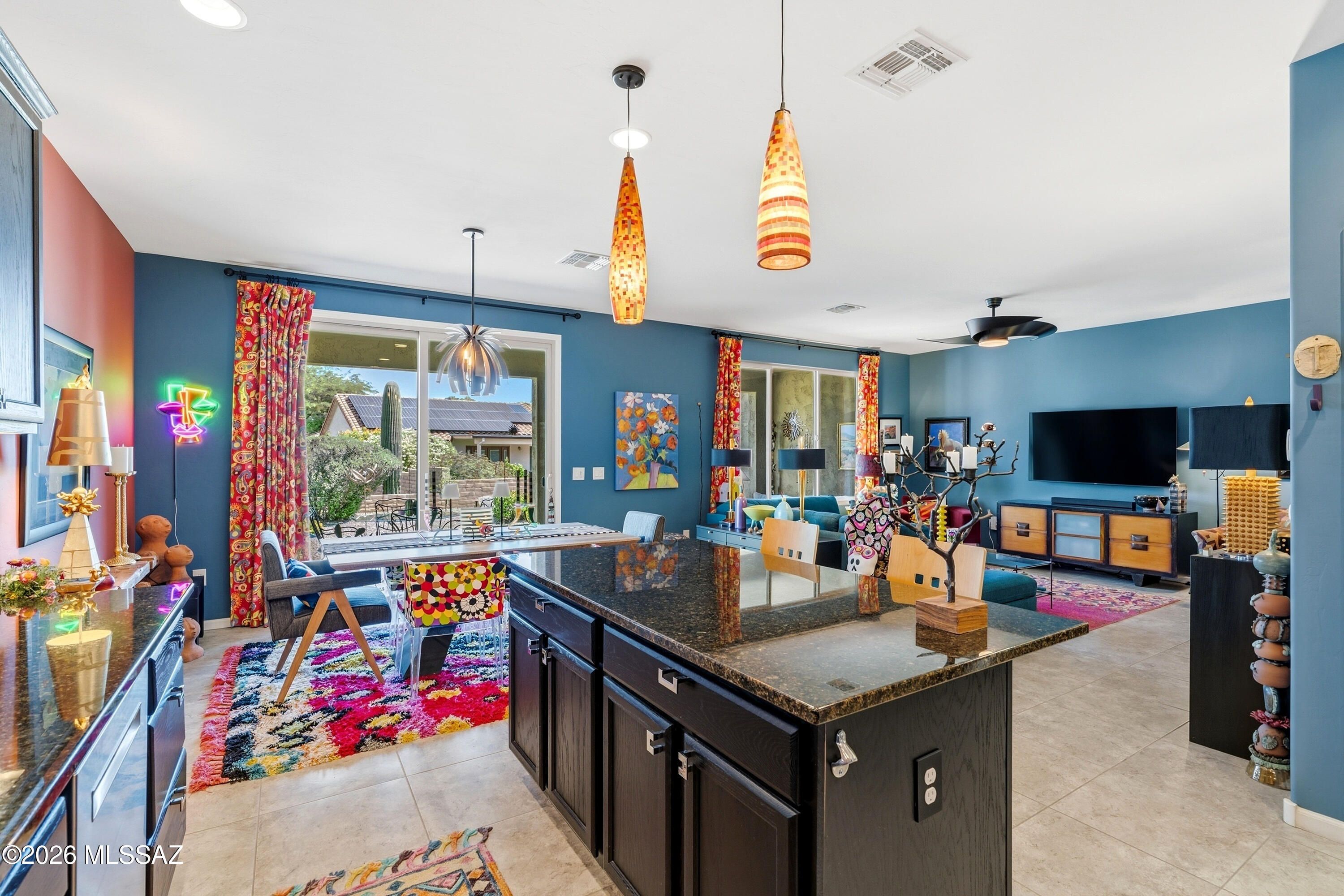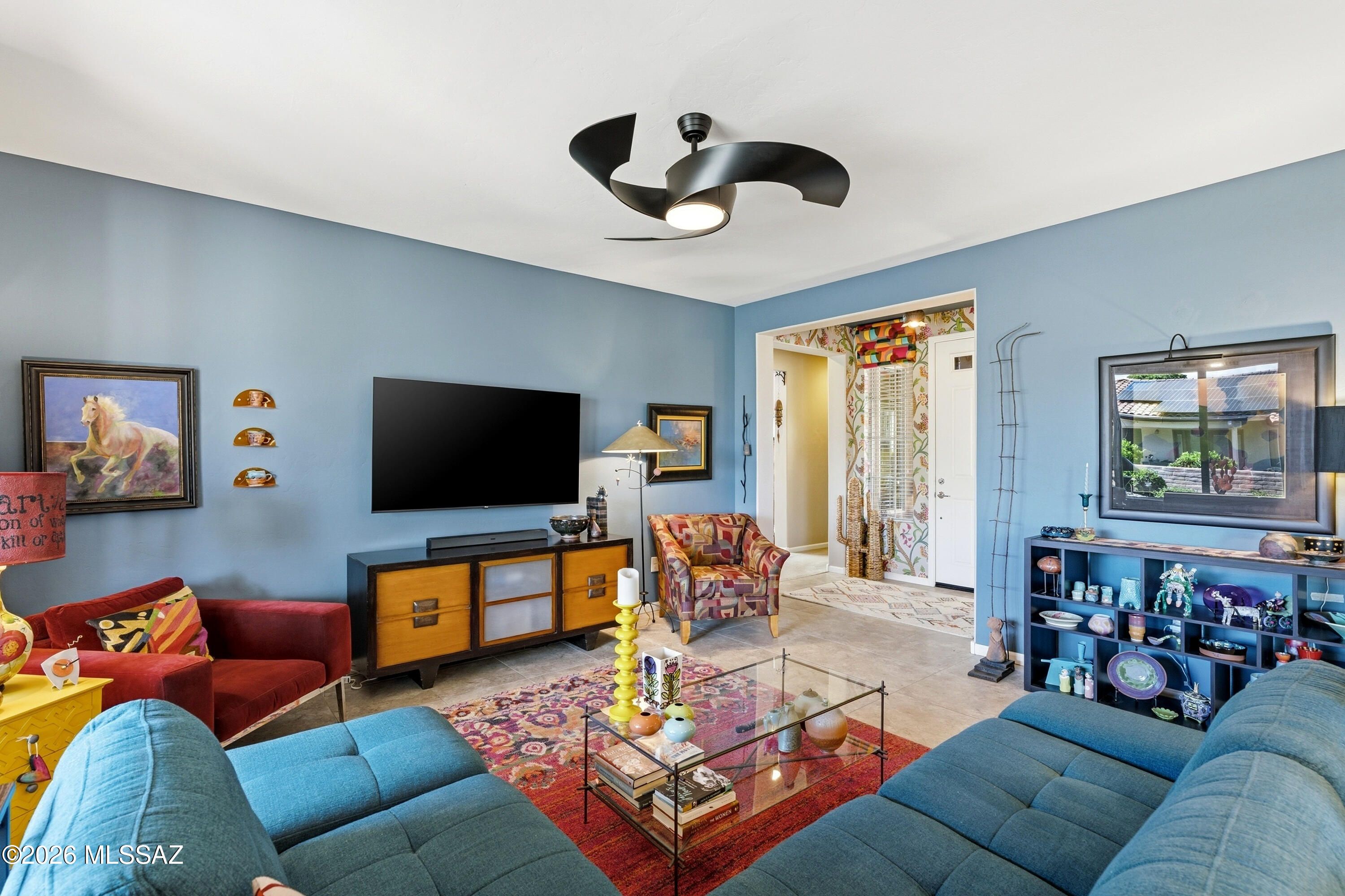 This attractive Southwest-style 1,589 sq. ft. Baja model in Quail Creek offers 2 BR, 2 BA + Den and showcases a warm stucco exterior and inviting curb appeal. Enter through the front wrought iron security door into a welcoming foyer that sets the tone for a bright, eclectic interior filled with color and personality. The entry features vibrant, nature-inspired wallpaper, creating a striking first impression. Beyond, the home opens to a modern great room highlighted by bold design elements, including rich blue and warm coral accent walls, a contemporary ceiling fan, and large windows that flood the space with natural light. The eye-catching kitchen is designed for both function and style, featuring warm coral-red walls, dark wood cabinetry, stainless appliances, granite counters, and is