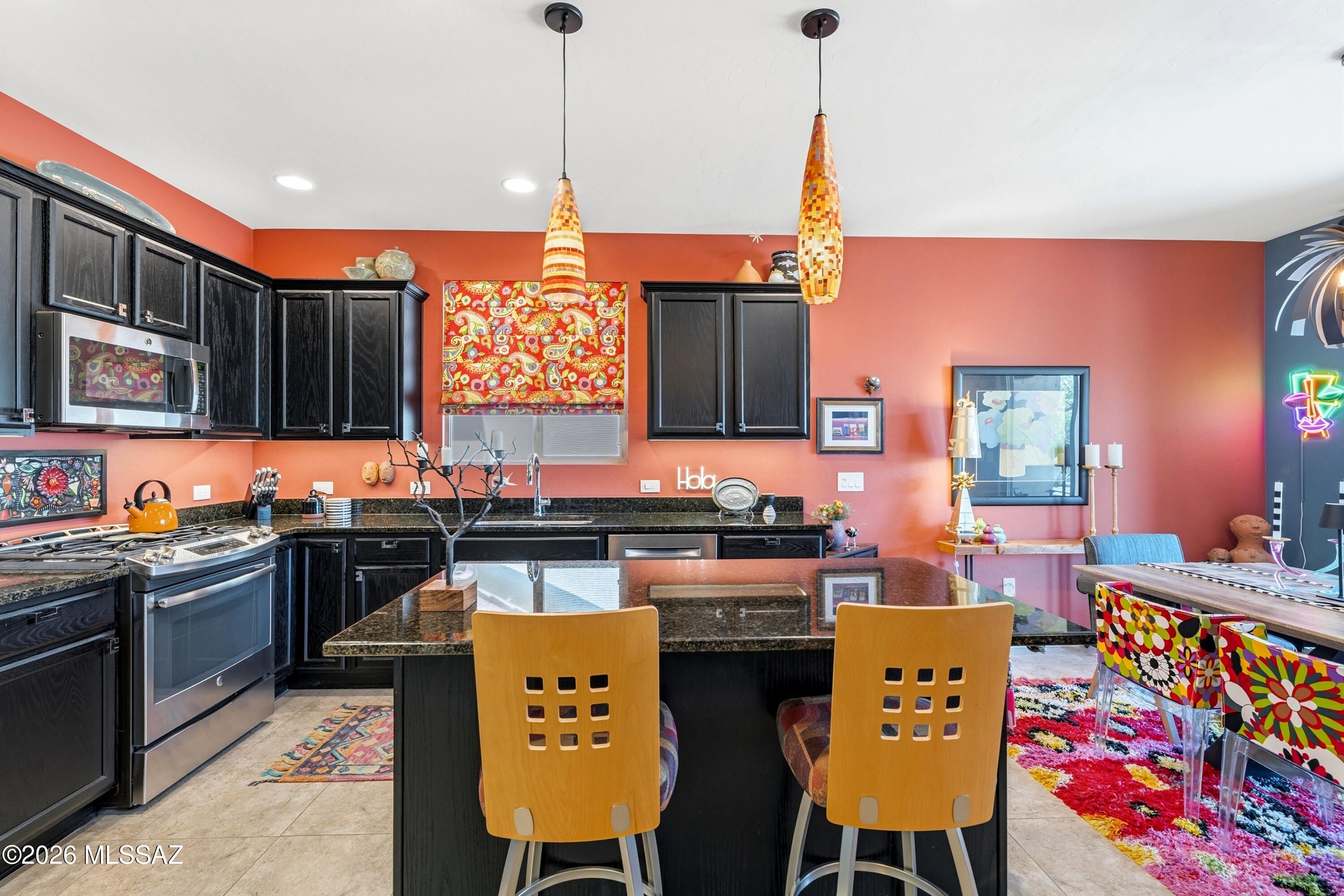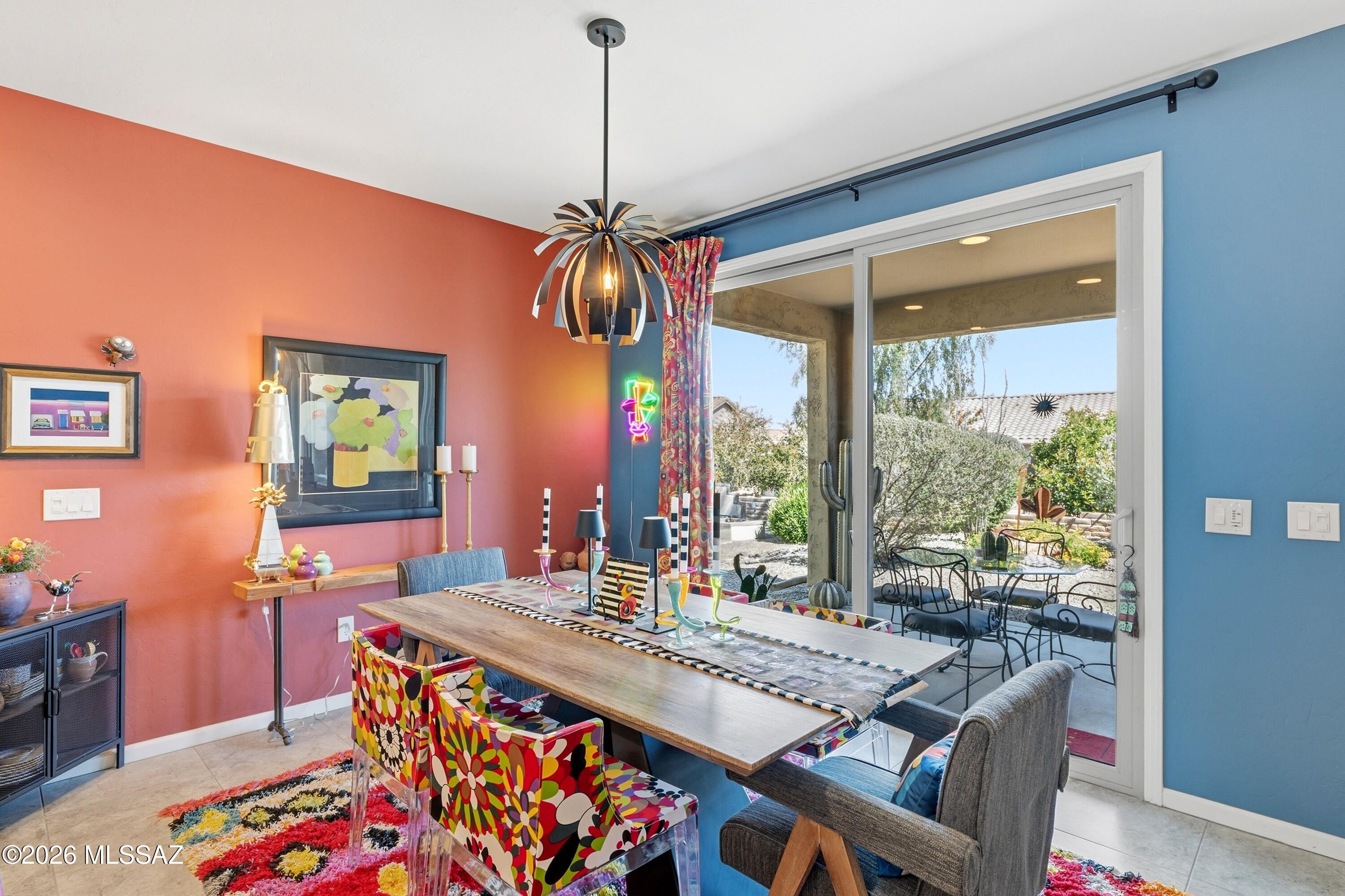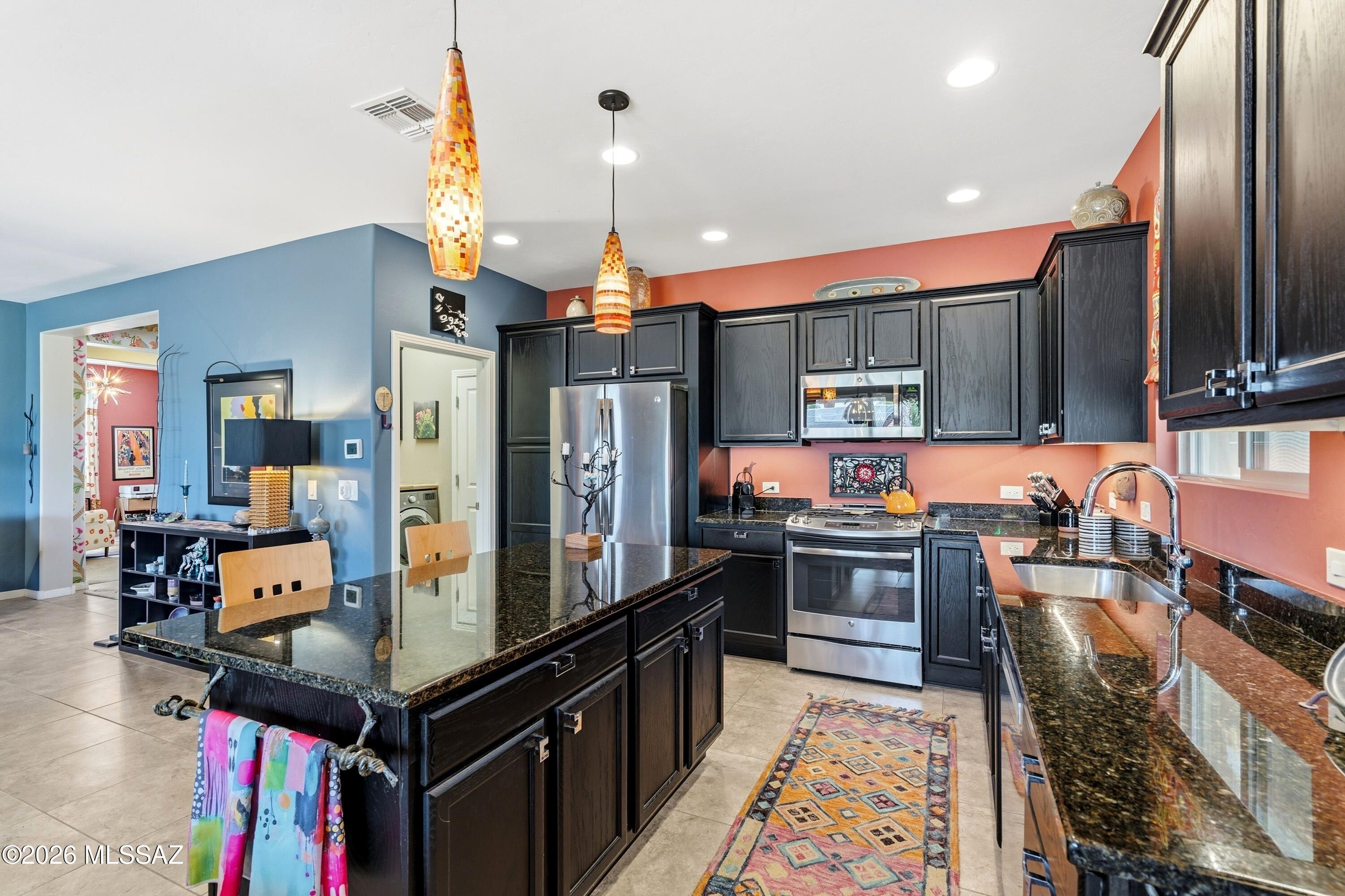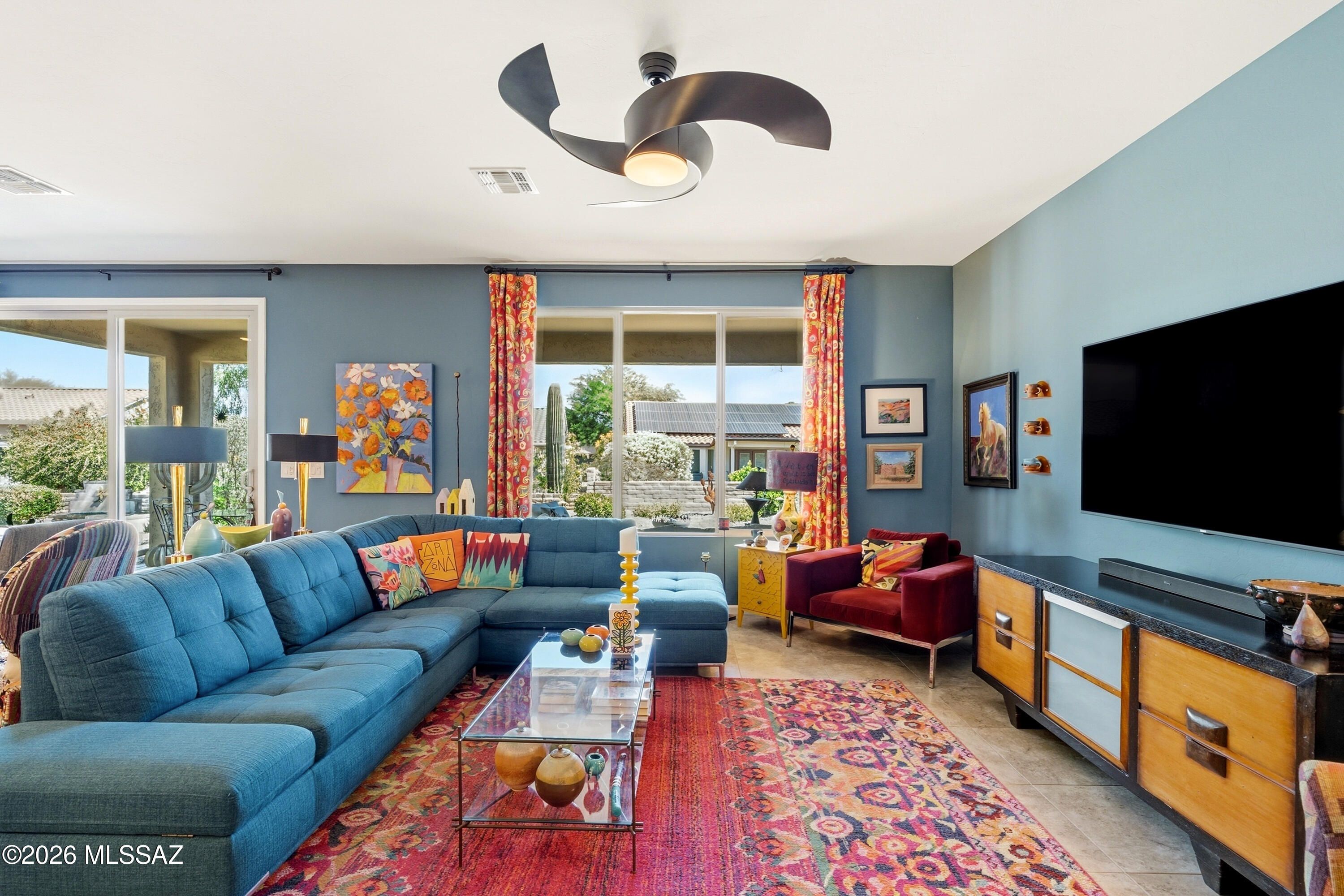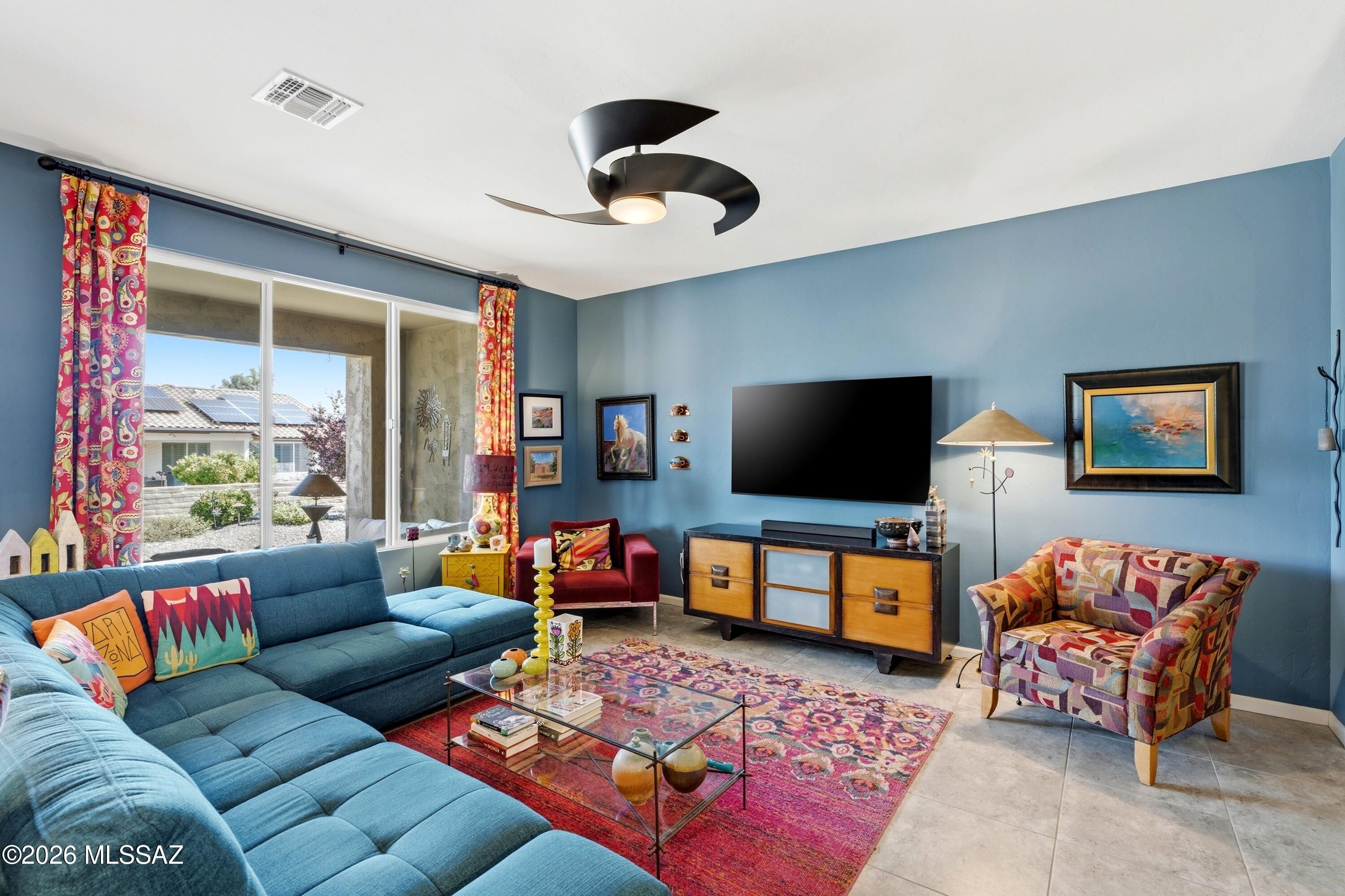 This attractive Southwest-style 1,589 sq. ft. Baja model in Quail Creek offers 2 BR, 2 BA + Den and showcases a warm stucco exterior and inviting curb appeal. Enter through the front wrought iron security door into a welcoming foyer that sets the tone for a bright, eclectic interior filled with color and personality. The entry features vibrant, nature-inspired wallpaper, creating a striking first impression. Beyond, the home opens to a modern great room highlighted by bold design elements, including rich blue and warm coral accent walls, a contemporary ceiling fan, and large windows that flood the space with natural light. The eye-catching kitchen is designed for both function and style, featuring warm coral-red walls, dark wood cabinetry, stainless appliances, granite counters, and is