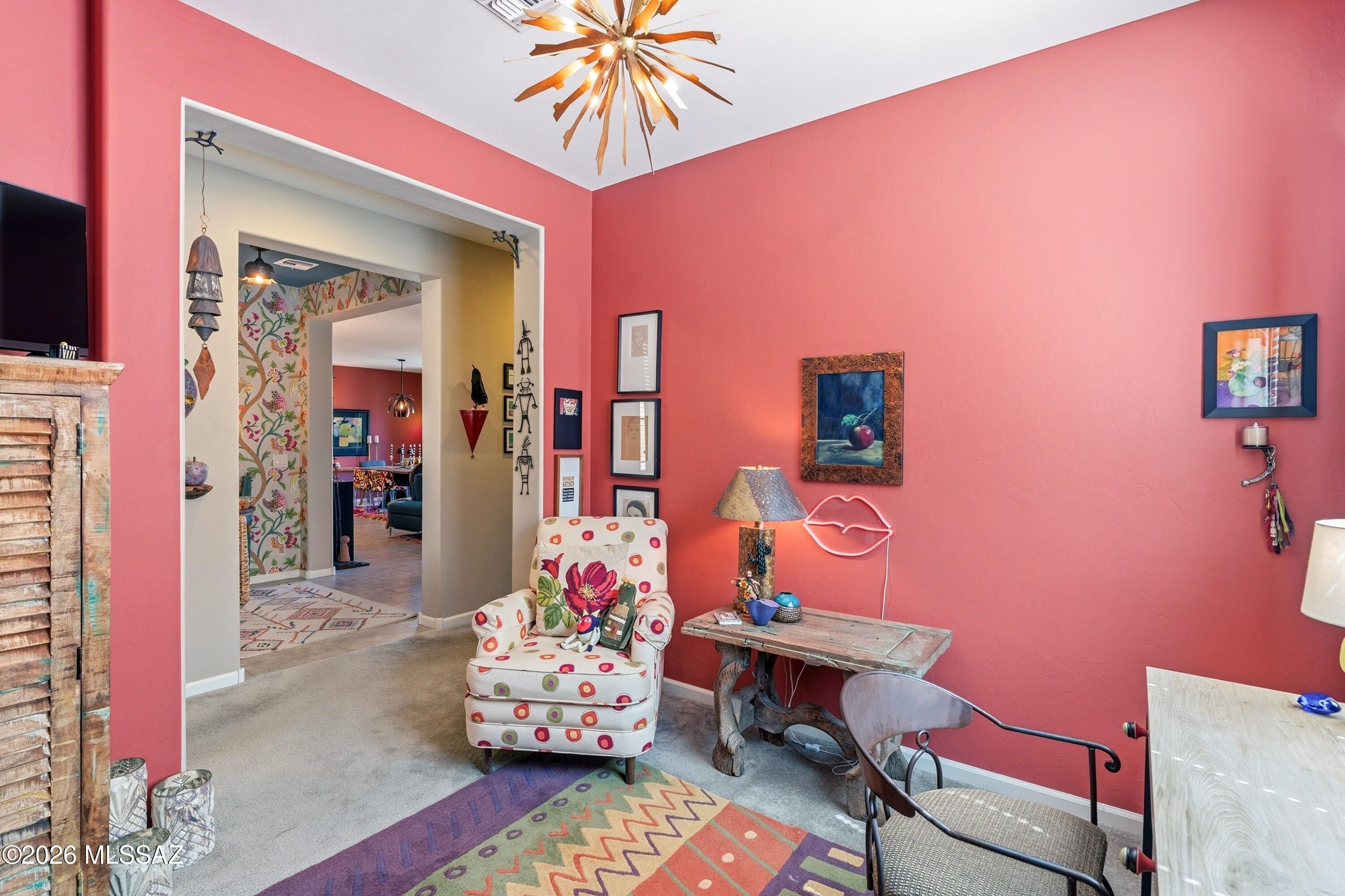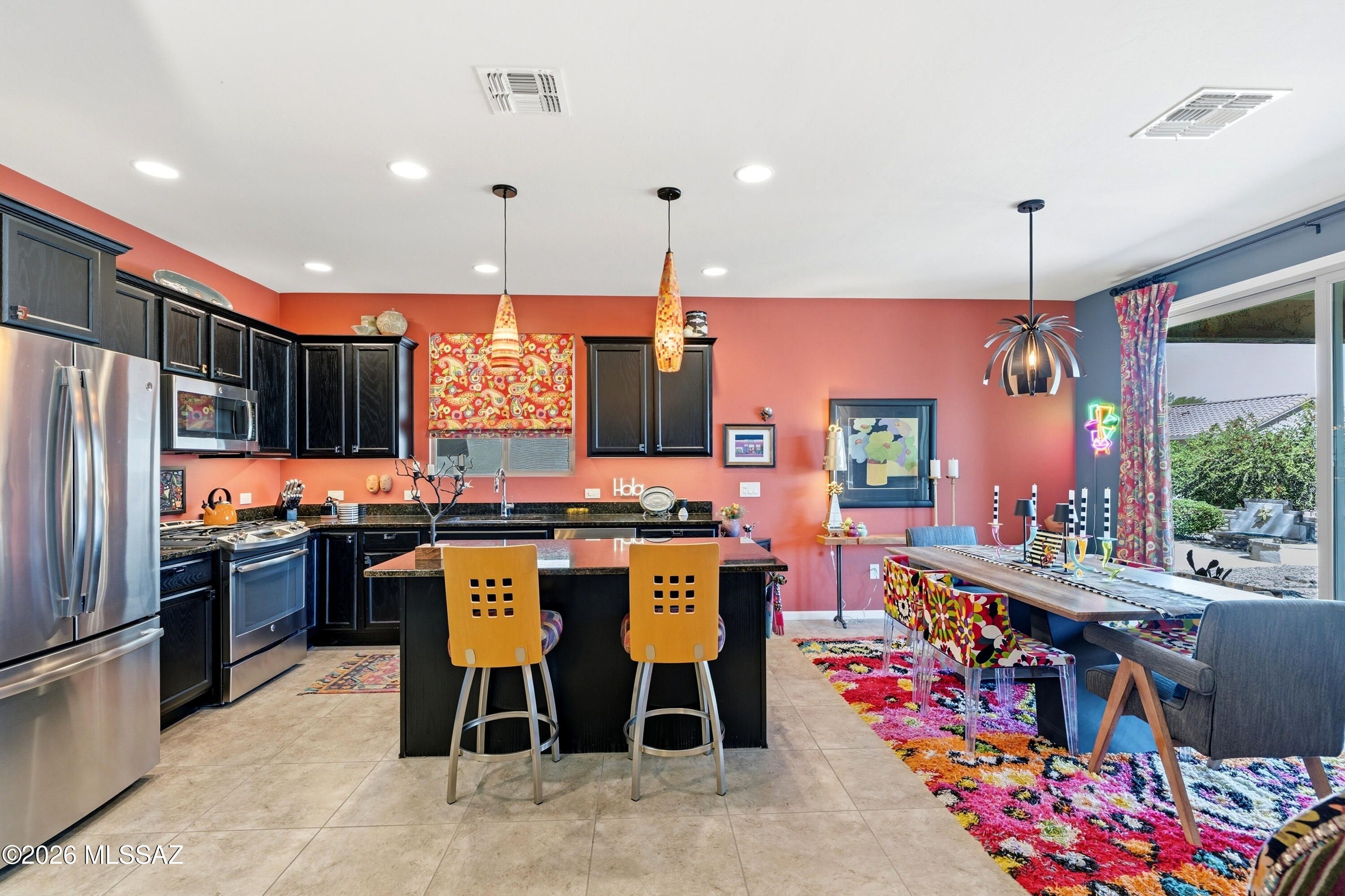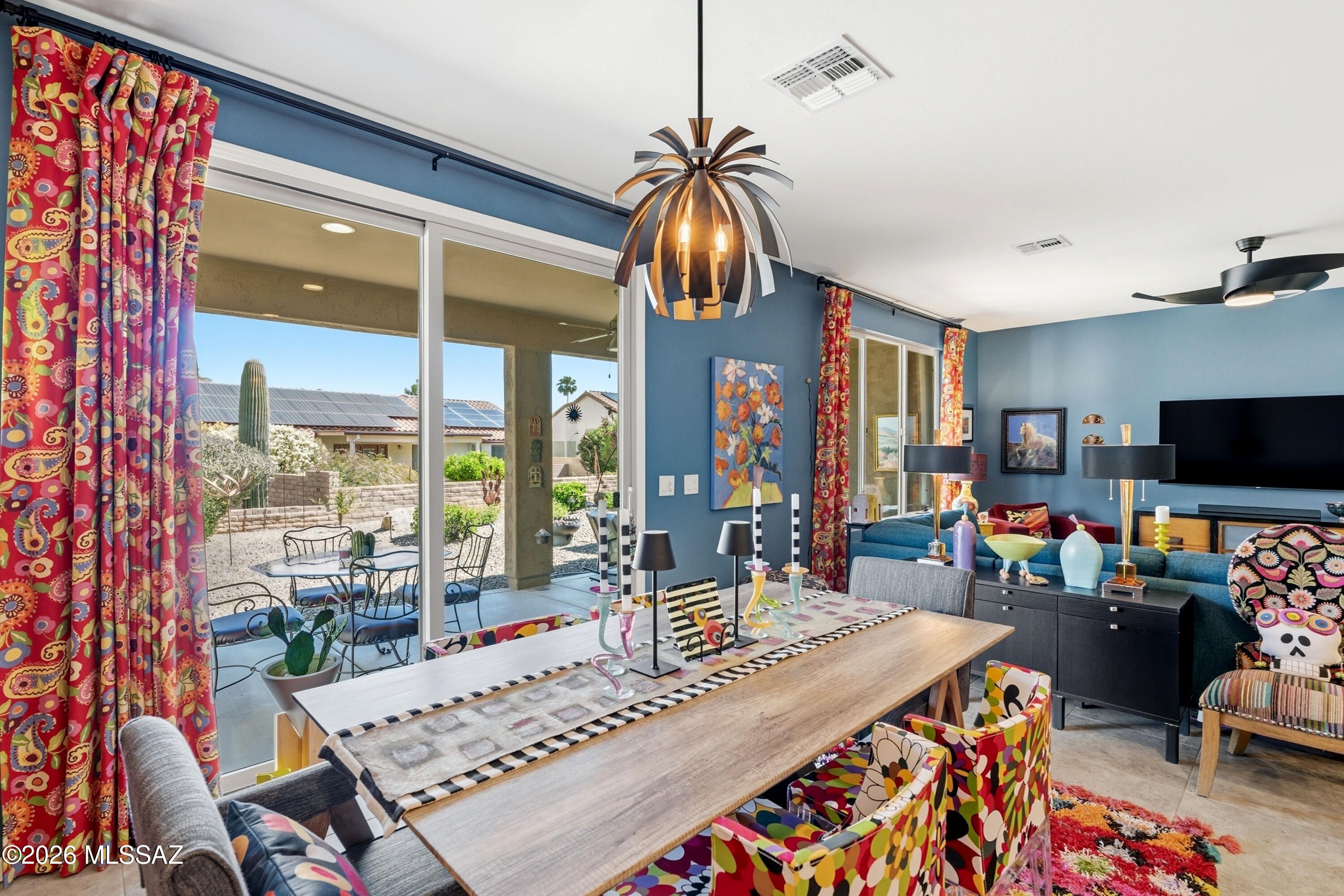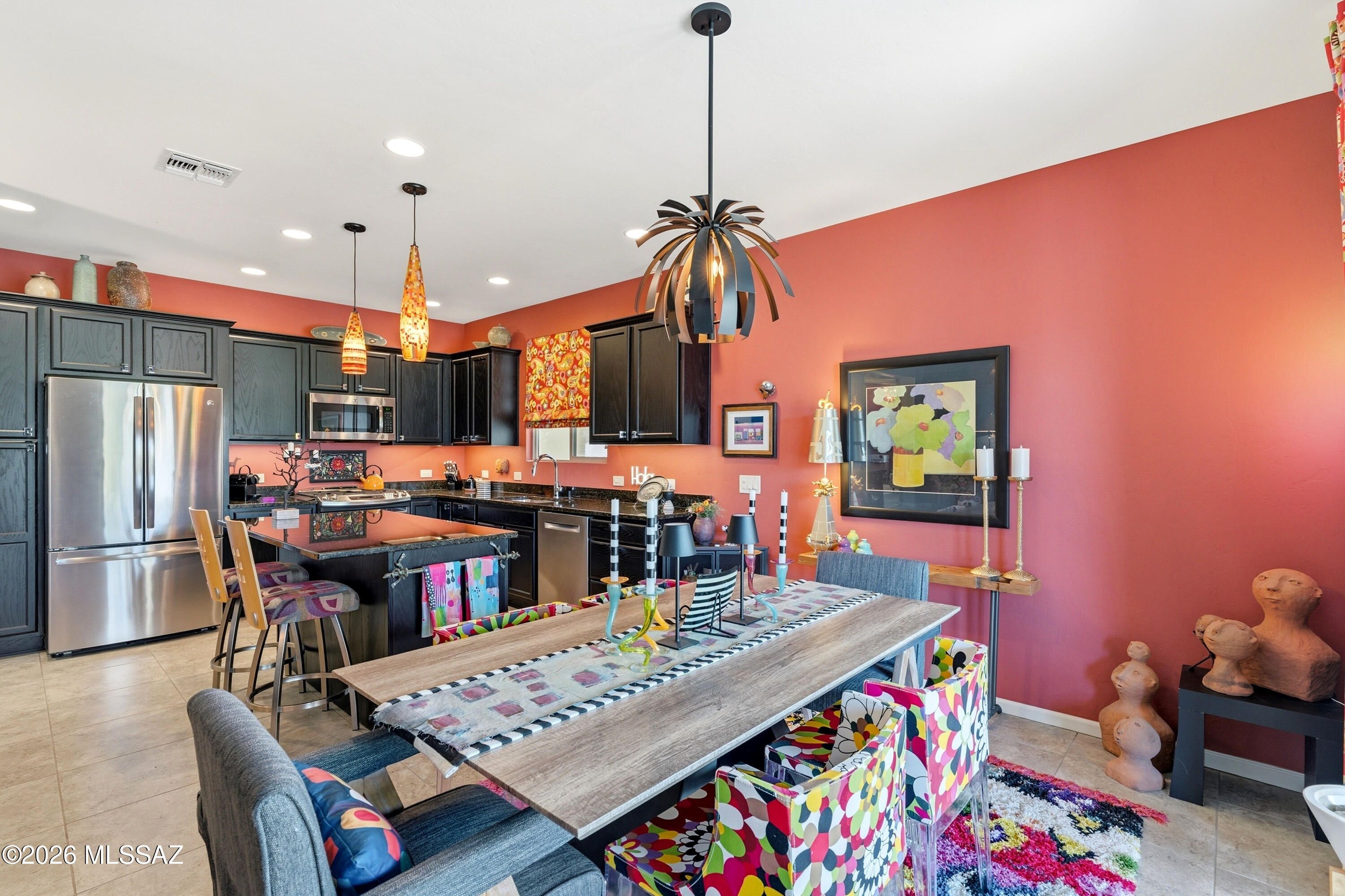 This attractive Southwest-style 1,589 sq. ft. Baja model in Quail Creek offers 2 BR, 2 BA + Den and showcases a warm stucco exterior and inviting curb appeal. Enter through the front wrought iron security door into a welcoming foyer that sets the tone for a bright, eclectic interior filled with color and personality. The entry features vibrant, nature-inspired wallpaper, creating a striking first impression. Beyond, the home opens to a modern great room highlighted by bold design elements, including rich blue and warm coral accent walls, a contemporary ceiling fan, and large windows that flood the space with natural light. The eye-catching kitchen is designed for both function and style, featuring warm coral-red walls, dark wood cabinetry, stainless appliances, granite counters, and is