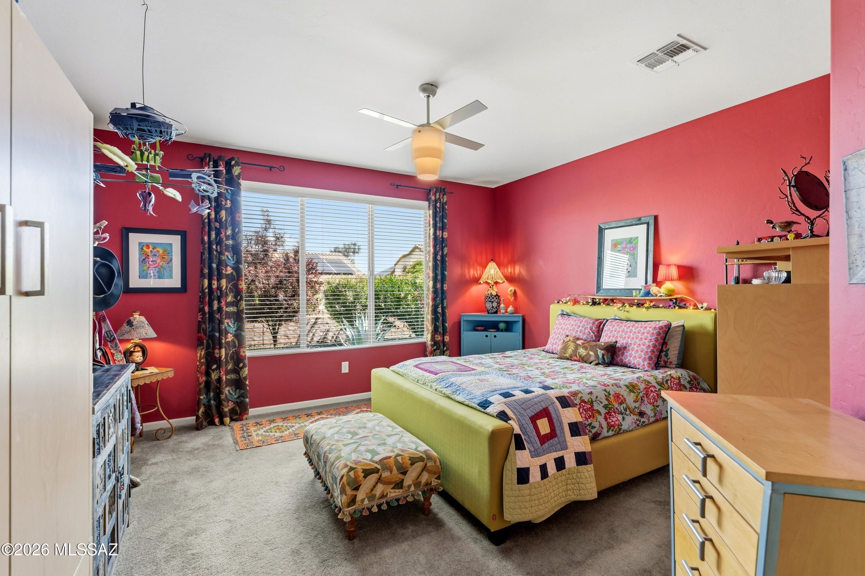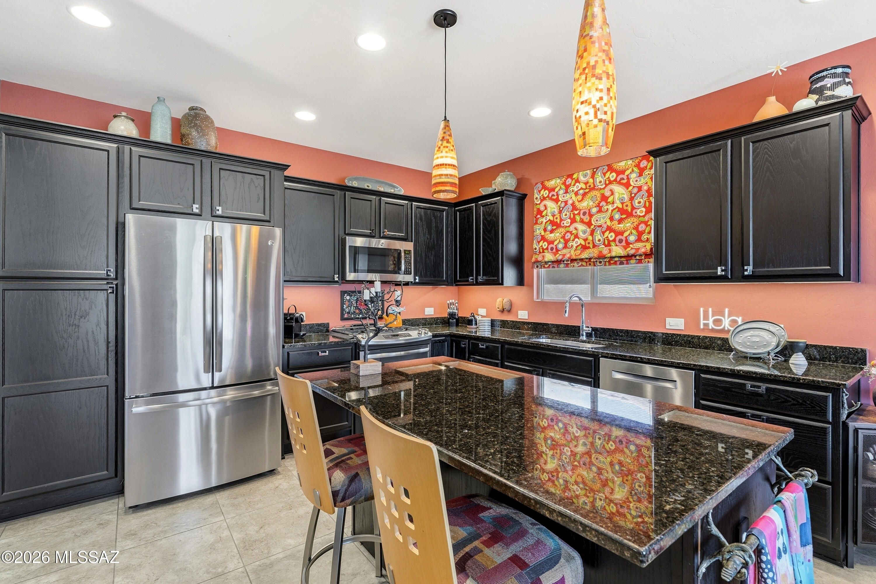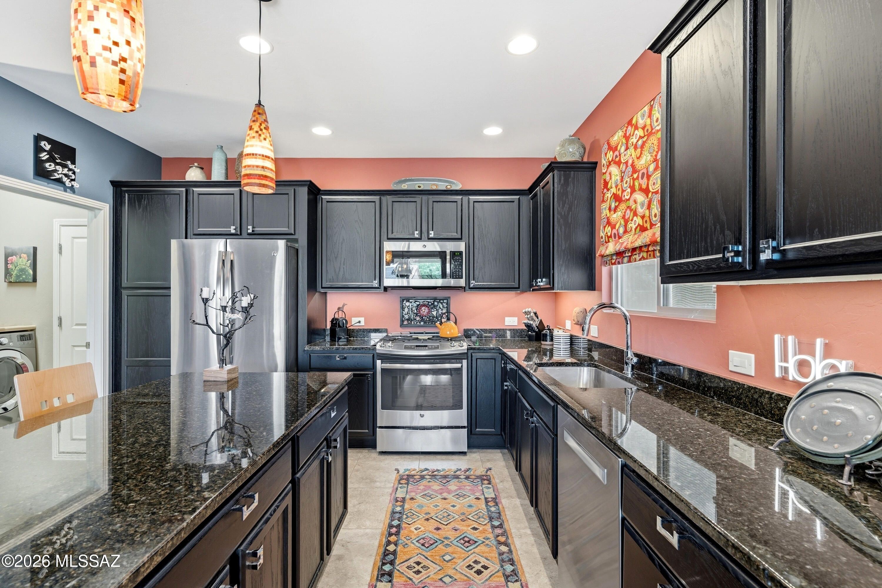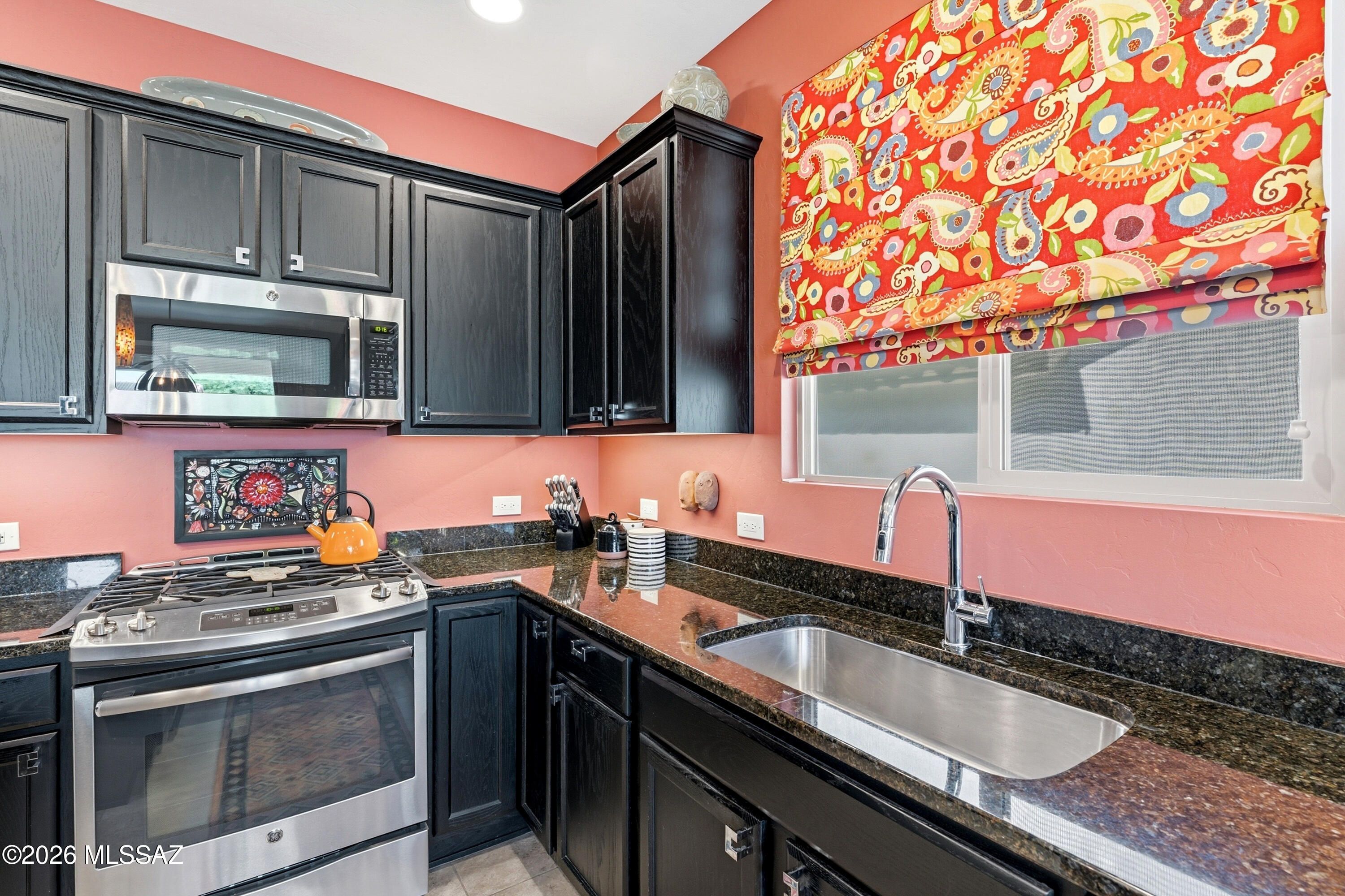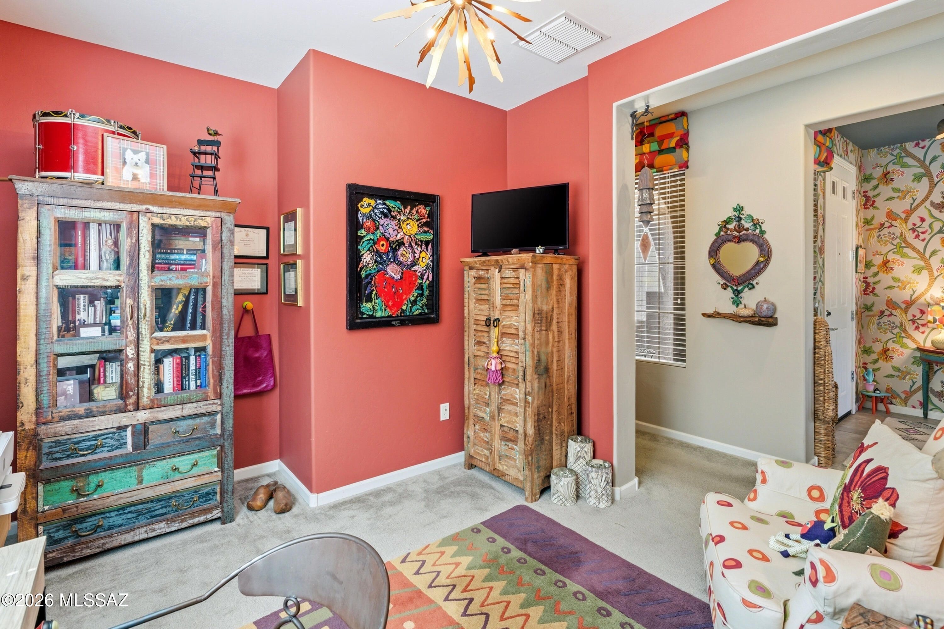 This attractive Southwest-style 1,589 sq. ft. Baja model in Quail Creek offers 2 BR, 2 BA + Den and showcases a warm stucco exterior and inviting curb appeal. Enter through the front wrought iron security door into a welcoming foyer that sets the tone for a bright, eclectic interior filled with color and personality. The entry features vibrant, nature-inspired wallpaper, creating a striking first impression. Beyond, the home opens to a modern great room highlighted by bold design elements, including rich blue and warm coral accent walls, a contemporary ceiling fan, and large windows that flood the space with natural light. The eye-catching kitchen is designed for both function and style, featuring warm coral-red walls, dark wood cabinetry, stainless appliances, granite counters, and is