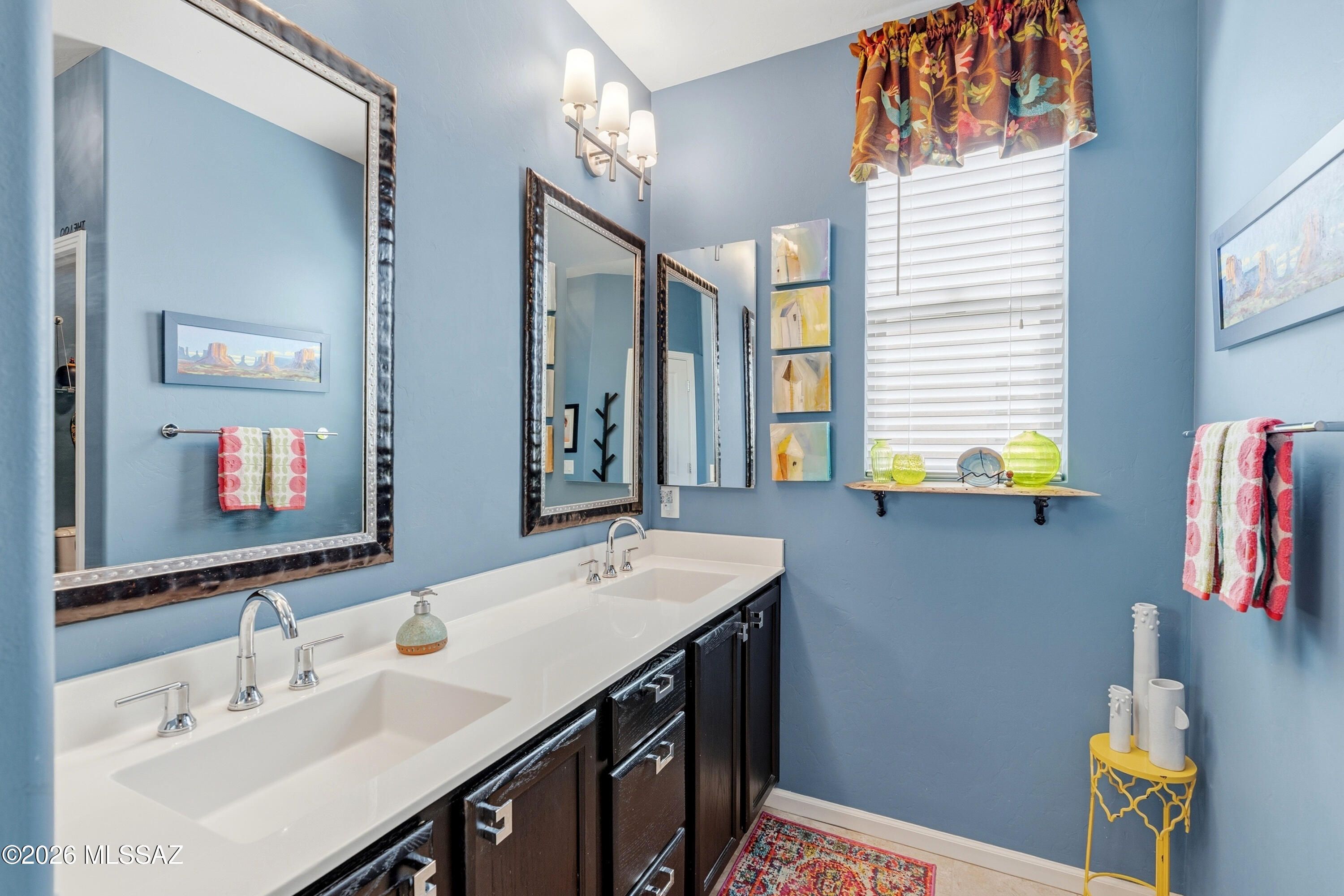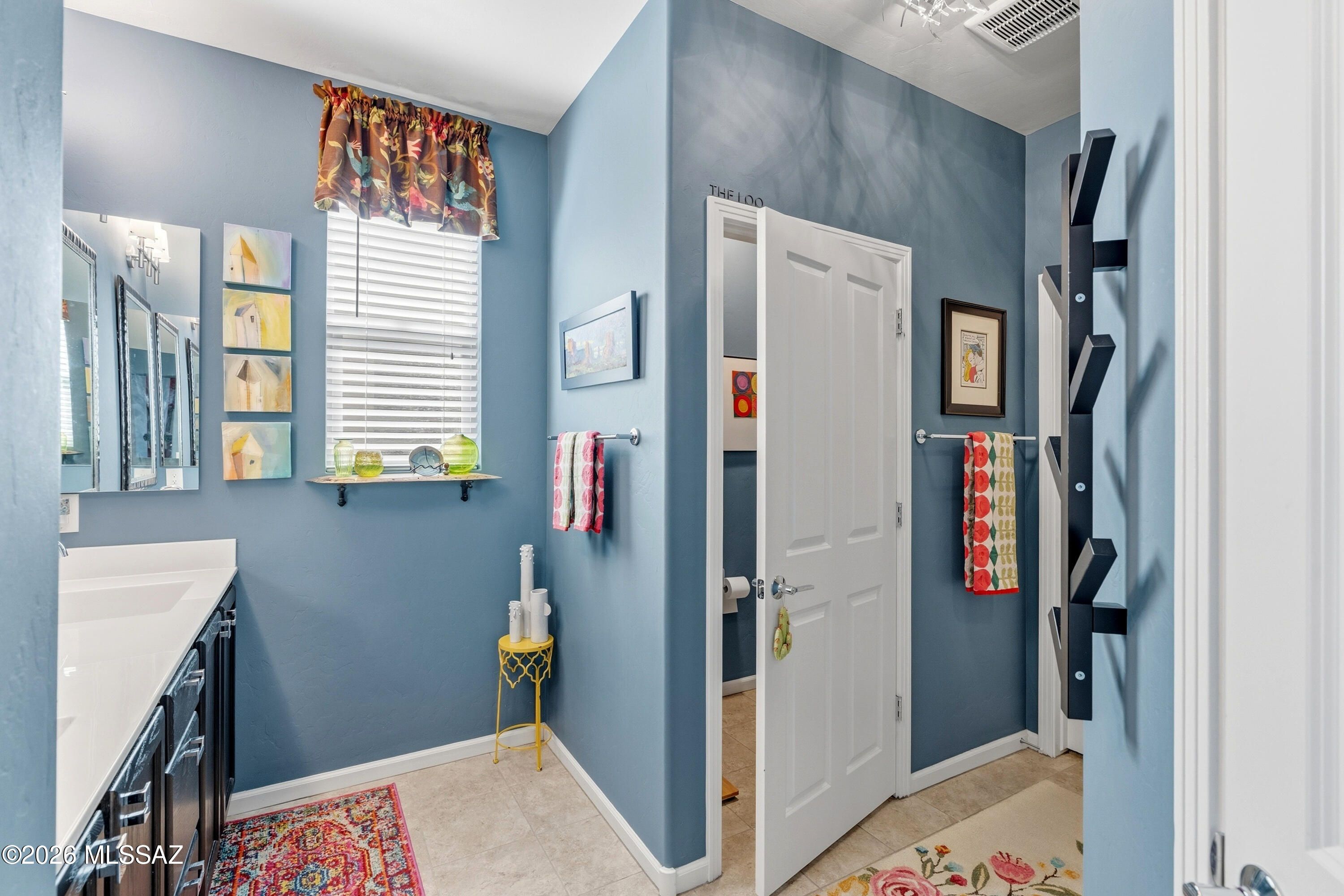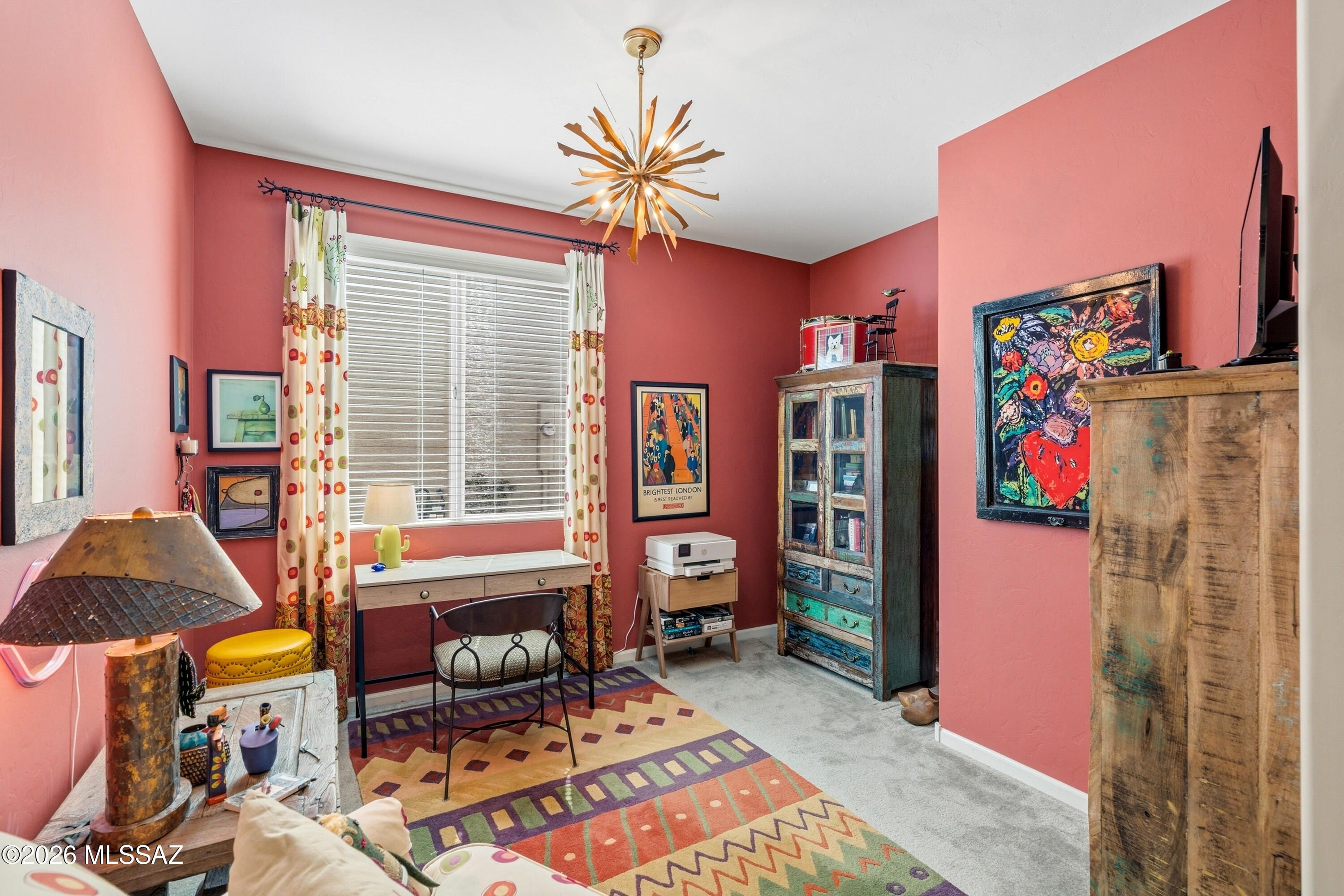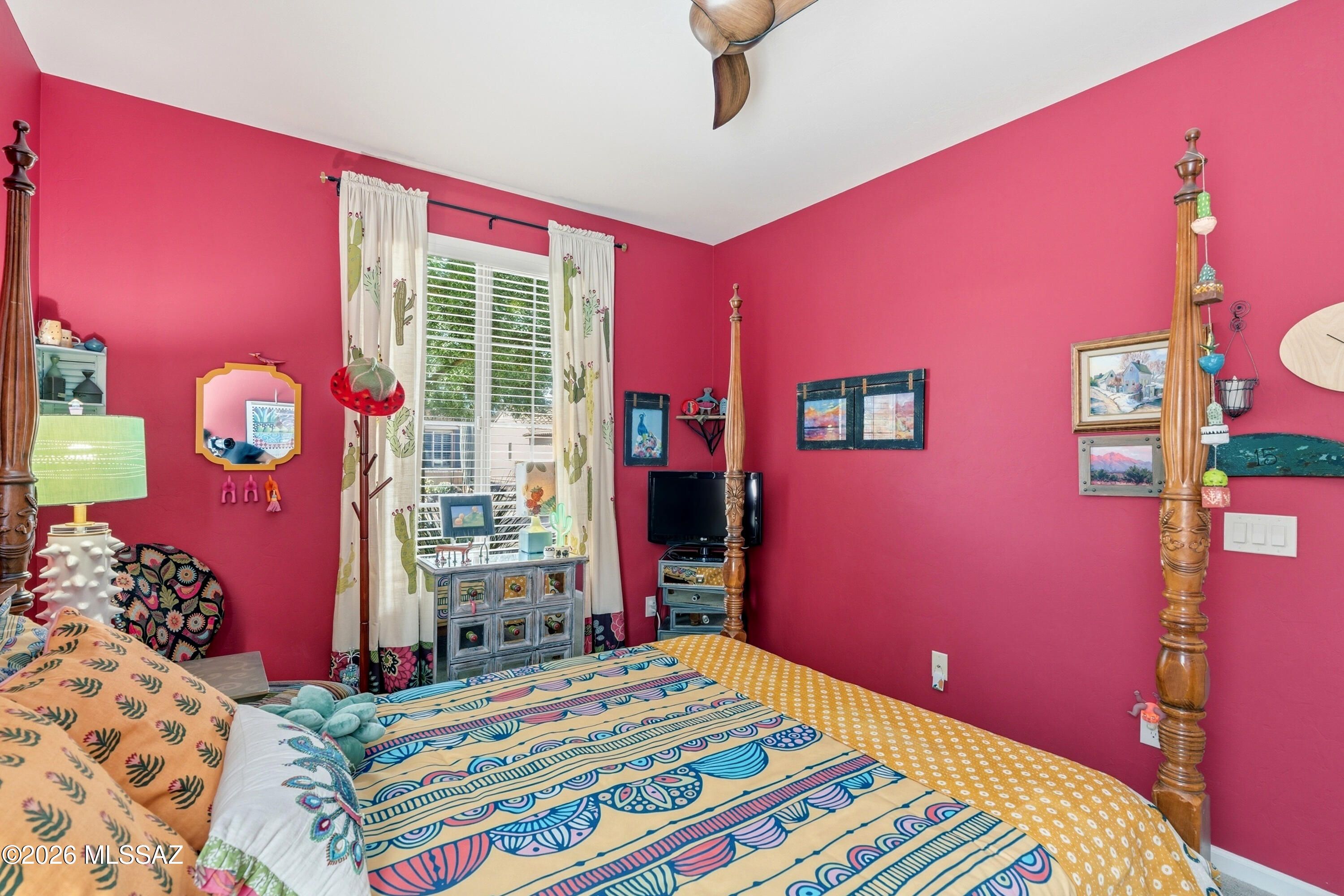 This attractive Southwest-style 1,589 sq. ft. Baja model in Quail Creek offers 2 BR, 2 BA + Den and showcases a warm stucco exterior and inviting curb appeal. Enter through the front wrought iron security door into a welcoming foyer that sets the tone for a bright, eclectic interior filled with color and personality. The entry features vibrant, nature-inspired wallpaper, creating a striking first impression. Beyond, the home opens to a modern great room highlighted by bold design elements, including rich blue and warm coral accent walls, a contemporary ceiling fan, and large windows that flood the space with natural light. The eye-catching kitchen is designed for both function and style, featuring warm coral-red walls, dark wood cabinetry, stainless appliances, granite counters, and is