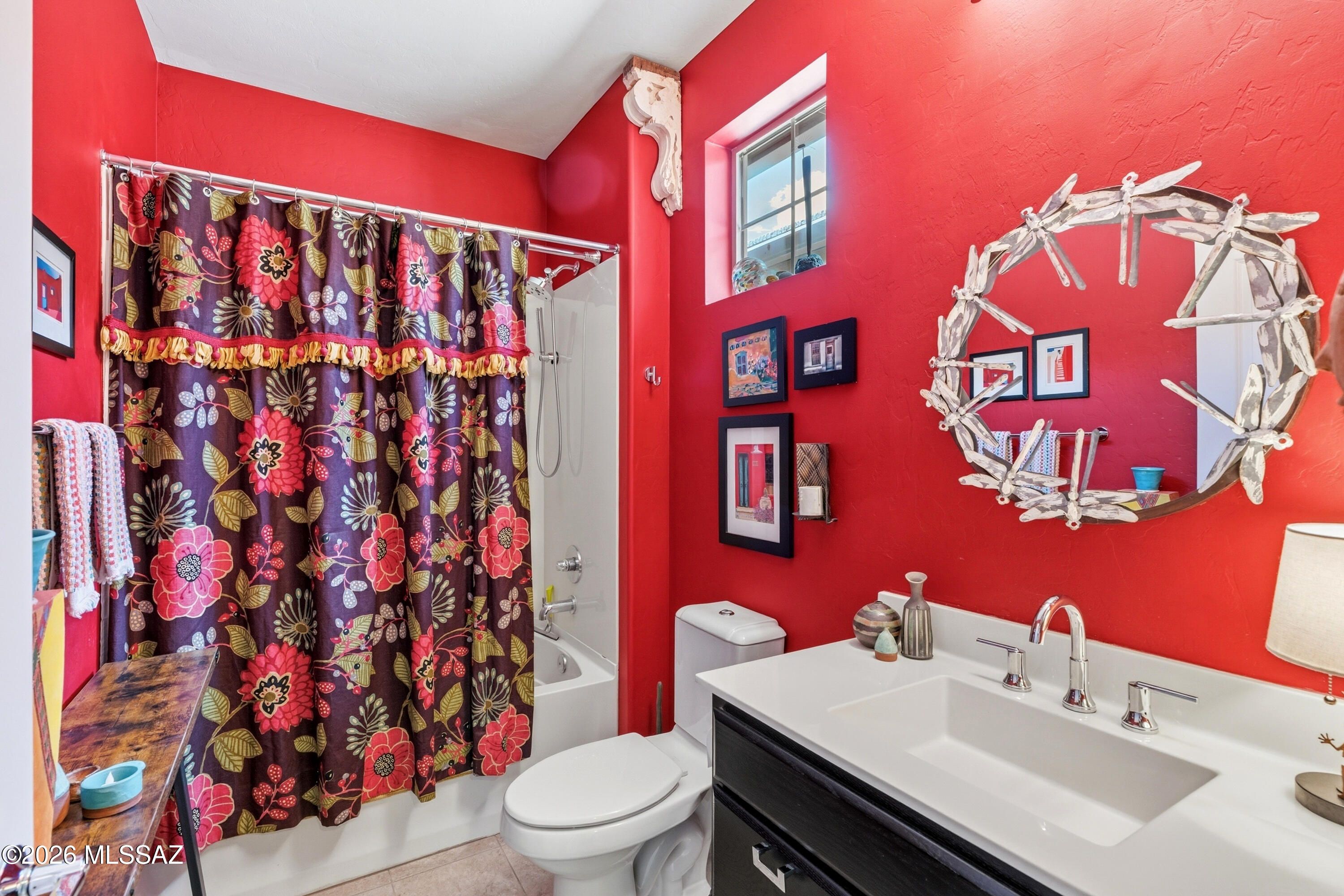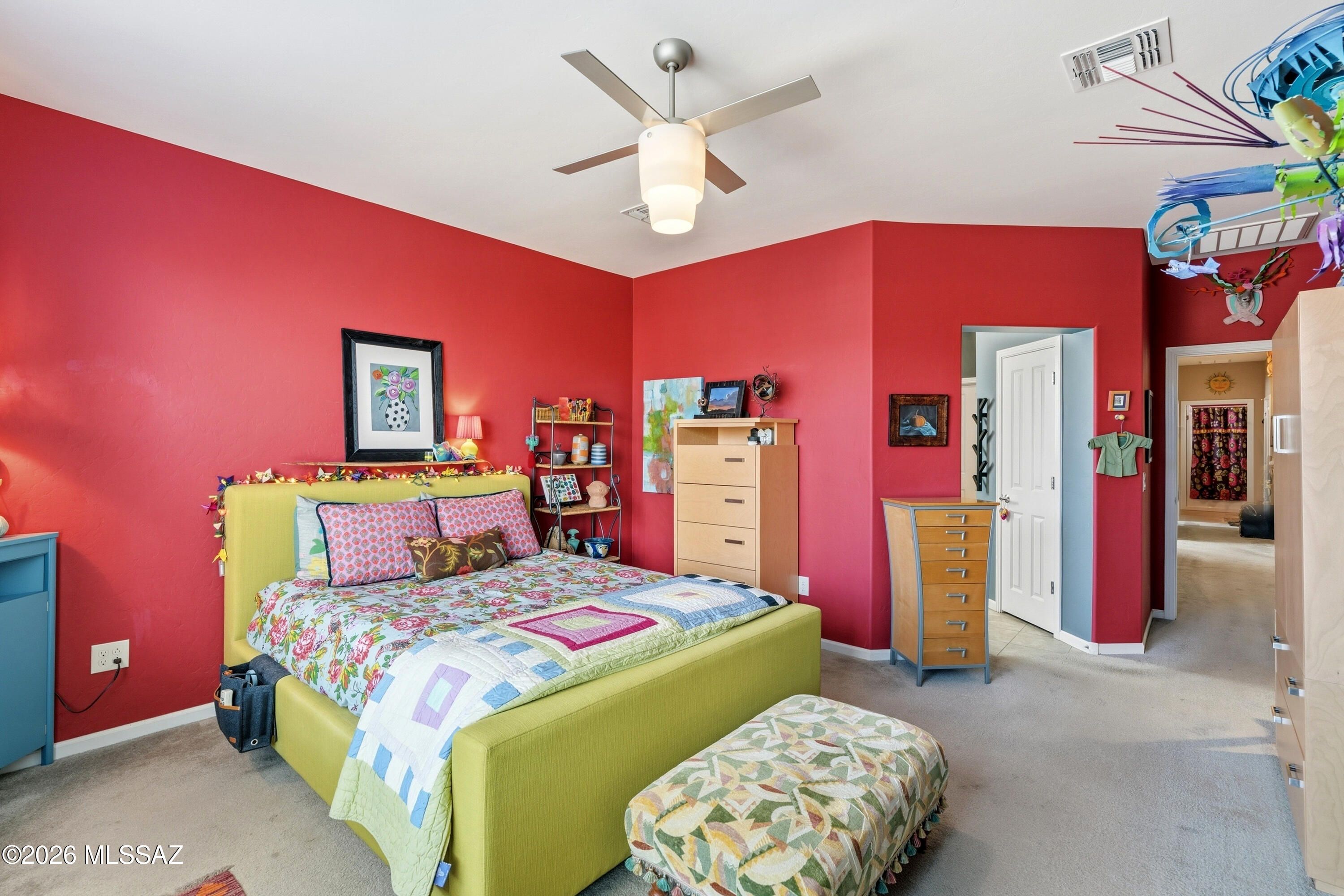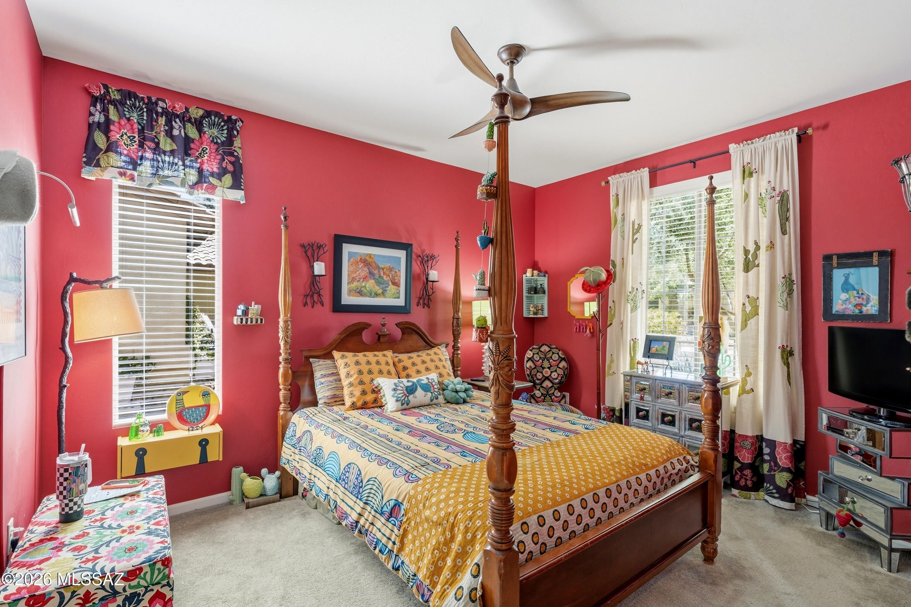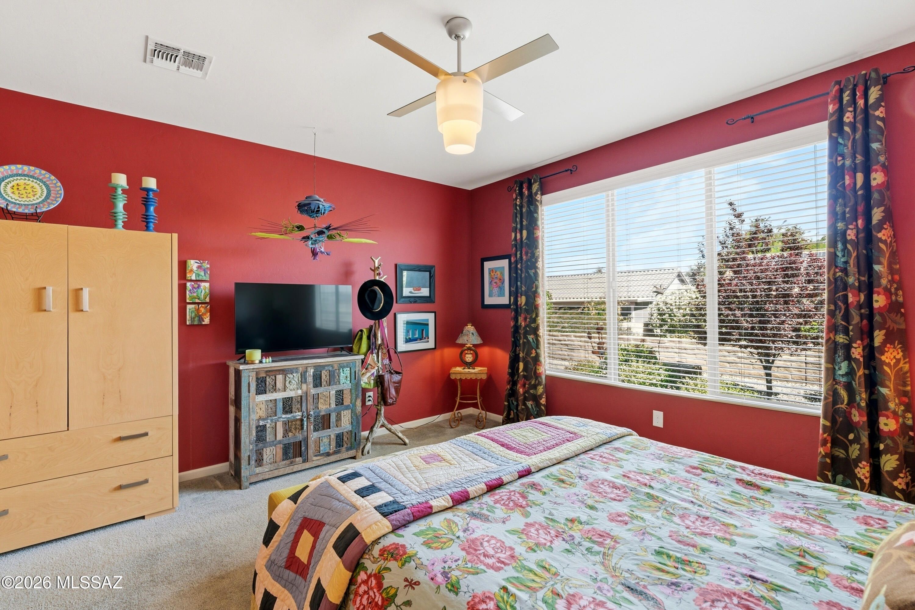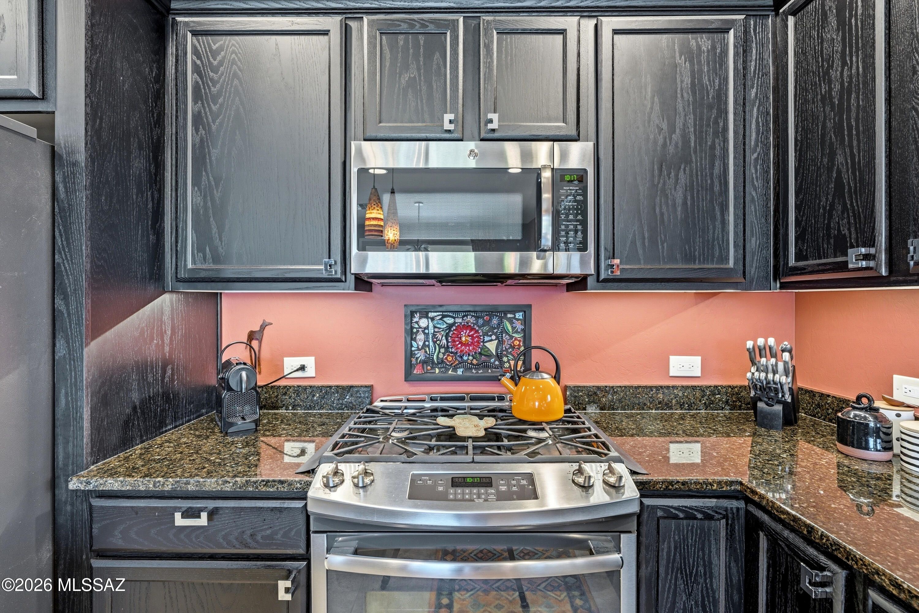 This attractive Southwest-style 1,589 sq. ft. Baja model in Quail Creek offers 2 BR, 2 BA + Den and showcases a warm stucco exterior and inviting curb appeal. Enter through the front wrought iron security door into a welcoming foyer that sets the tone for a bright, eclectic interior filled with color and personality. The entry features vibrant, nature-inspired wallpaper, creating a striking first impression. Beyond, the home opens to a modern great room highlighted by bold design elements, including rich blue and warm coral accent walls, a contemporary ceiling fan, and large windows that flood the space with natural light. The eye-catching kitchen is designed for both function and style, featuring warm coral-red walls, dark wood cabinetry, stainless appliances, granite counters, and is