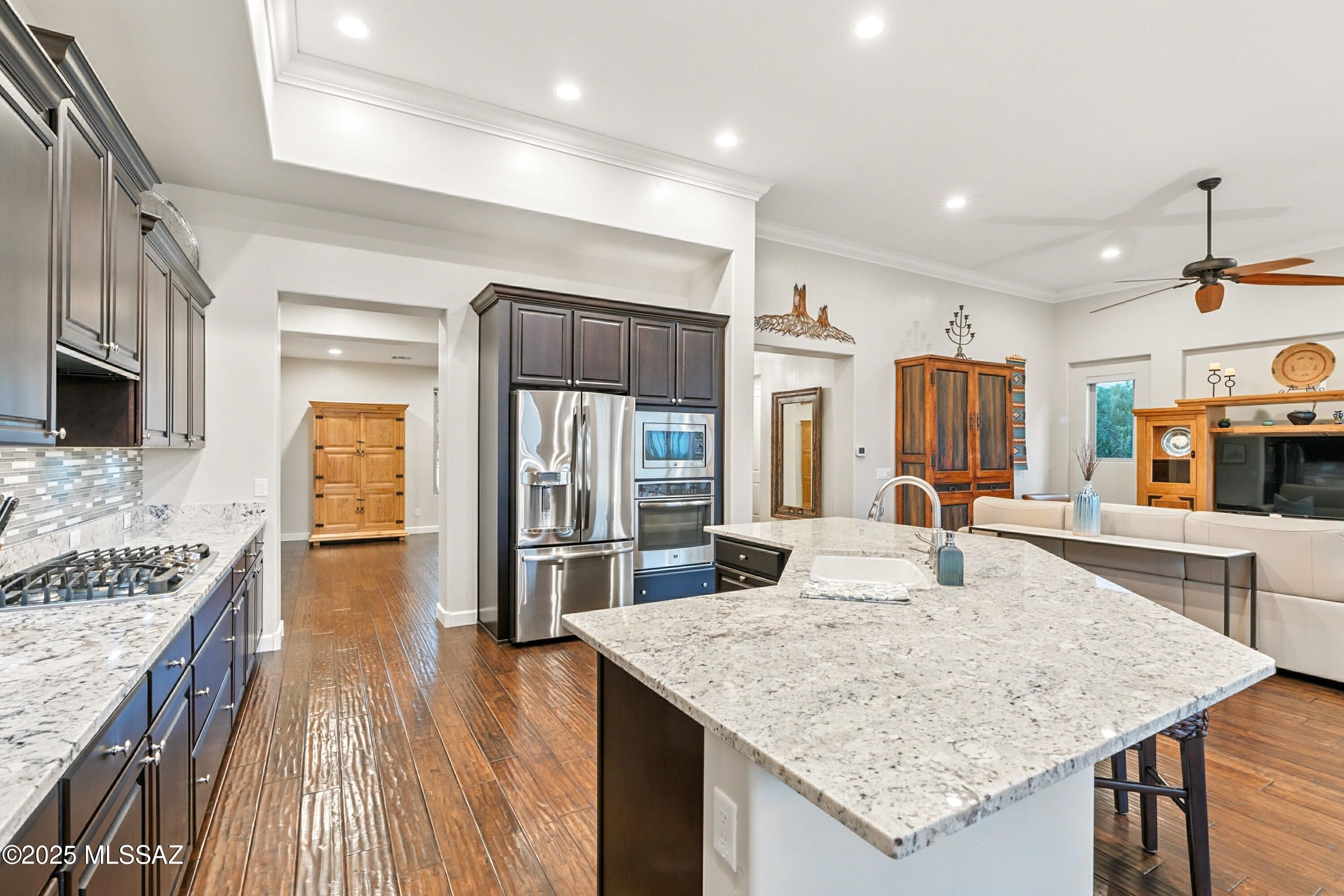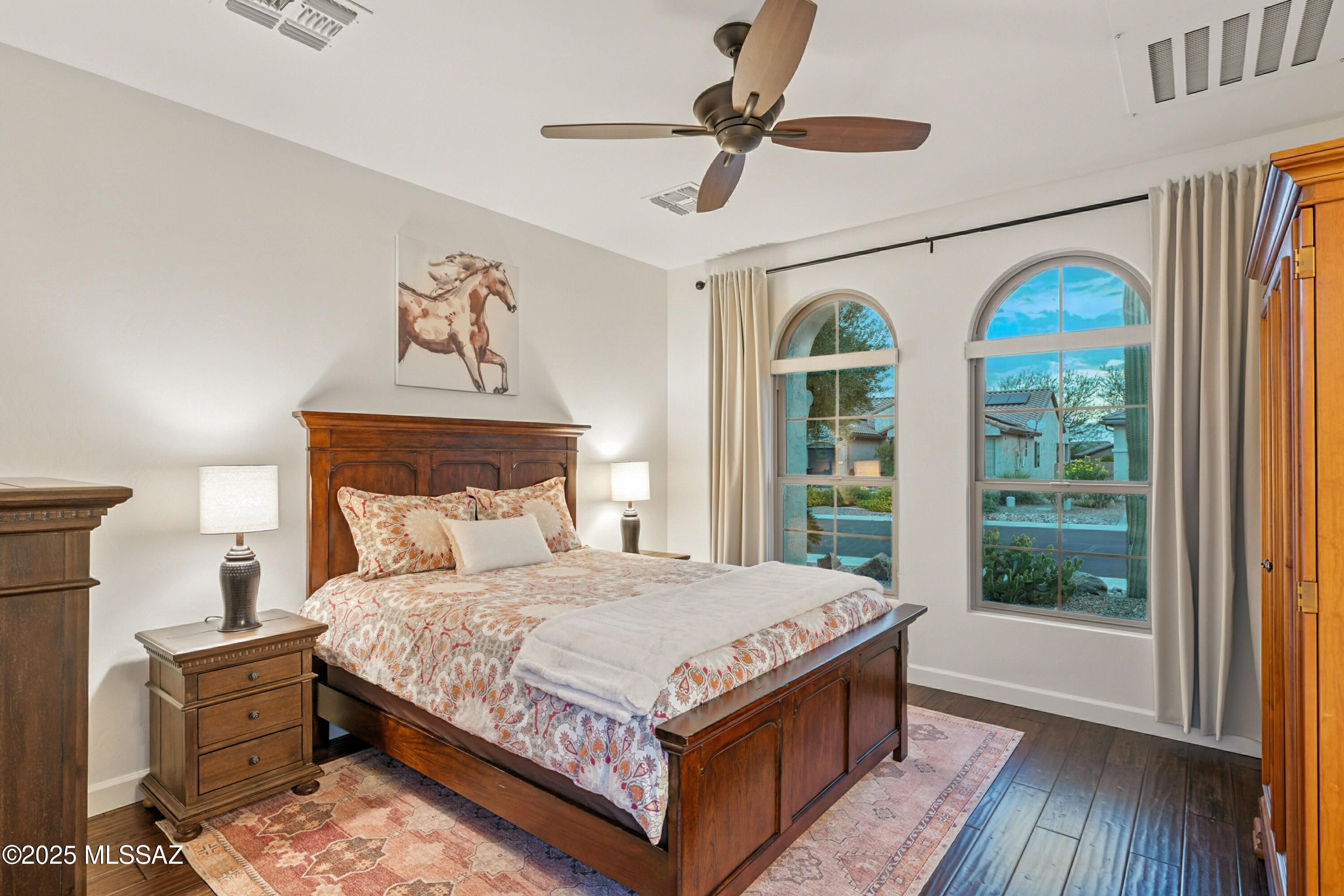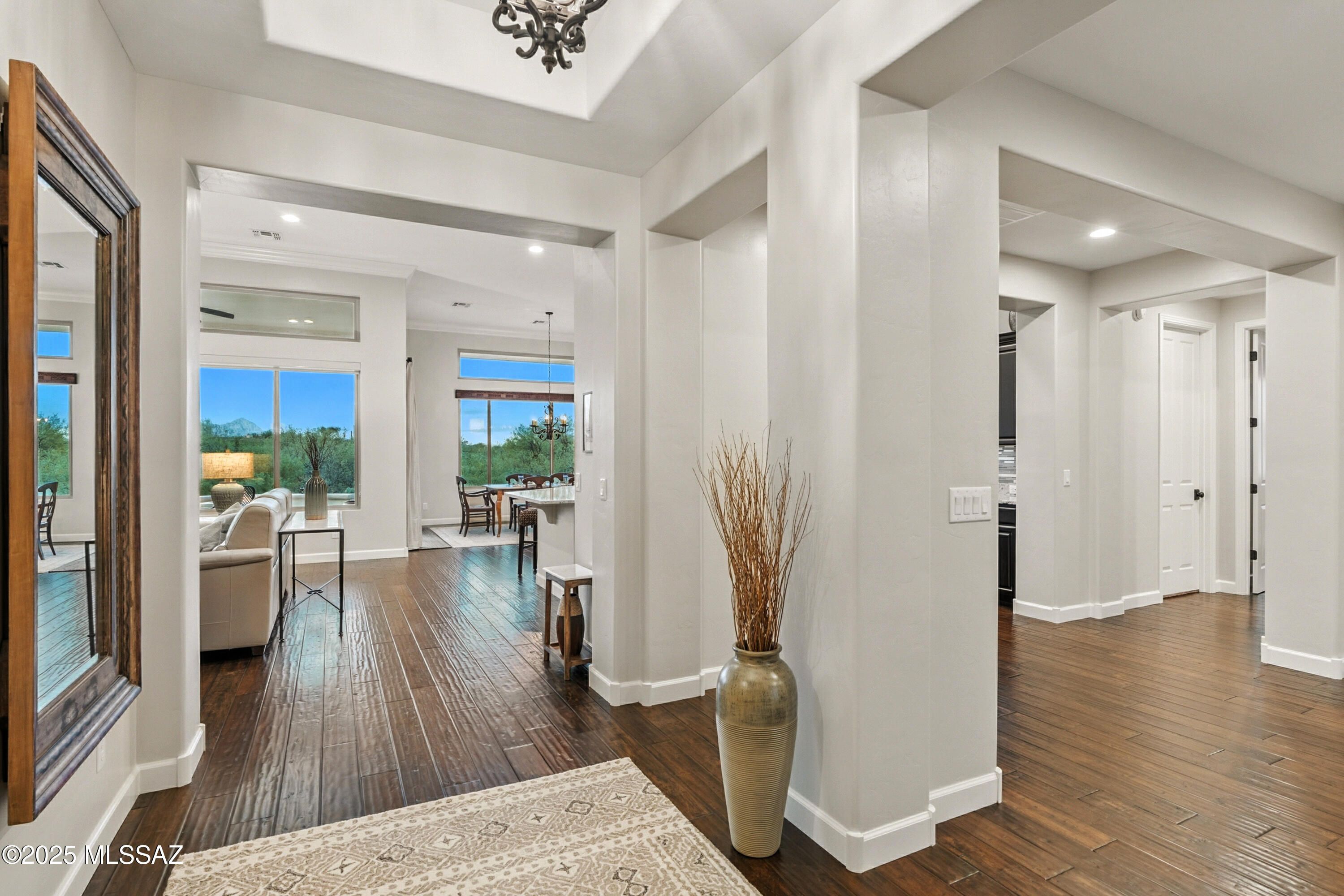Breathtaking views! Located on a sought-after street in Quail Creek, this Spanish Colonial Sonata model w/ private entry Casita offers 2,821 total sq.ft., incl. 3 BR, 3.5 BA, Den and multi-purpose room, and backs to pristine natural desert with spectacular views of Mounts Wrightson, Hopkins and Elephant Head. Wonderful curb appeal w/ gated front courtyard, stunning wood entry door. Inside are soaring 12' ceilings in the kitchen, great room and dining area, crown moulding, hand scraped hardwood flooring, and plenty of windows to take in the stunning views. Kitchen has a grand island w/ granite counters, upgraded cabinets, SS appliances, 36'' gas cooktop, new Bosch dishwasher. Wake up to sunrise over the Santa Rita's, the expanded Owner's Suite has box bay window and exit to rear patio.