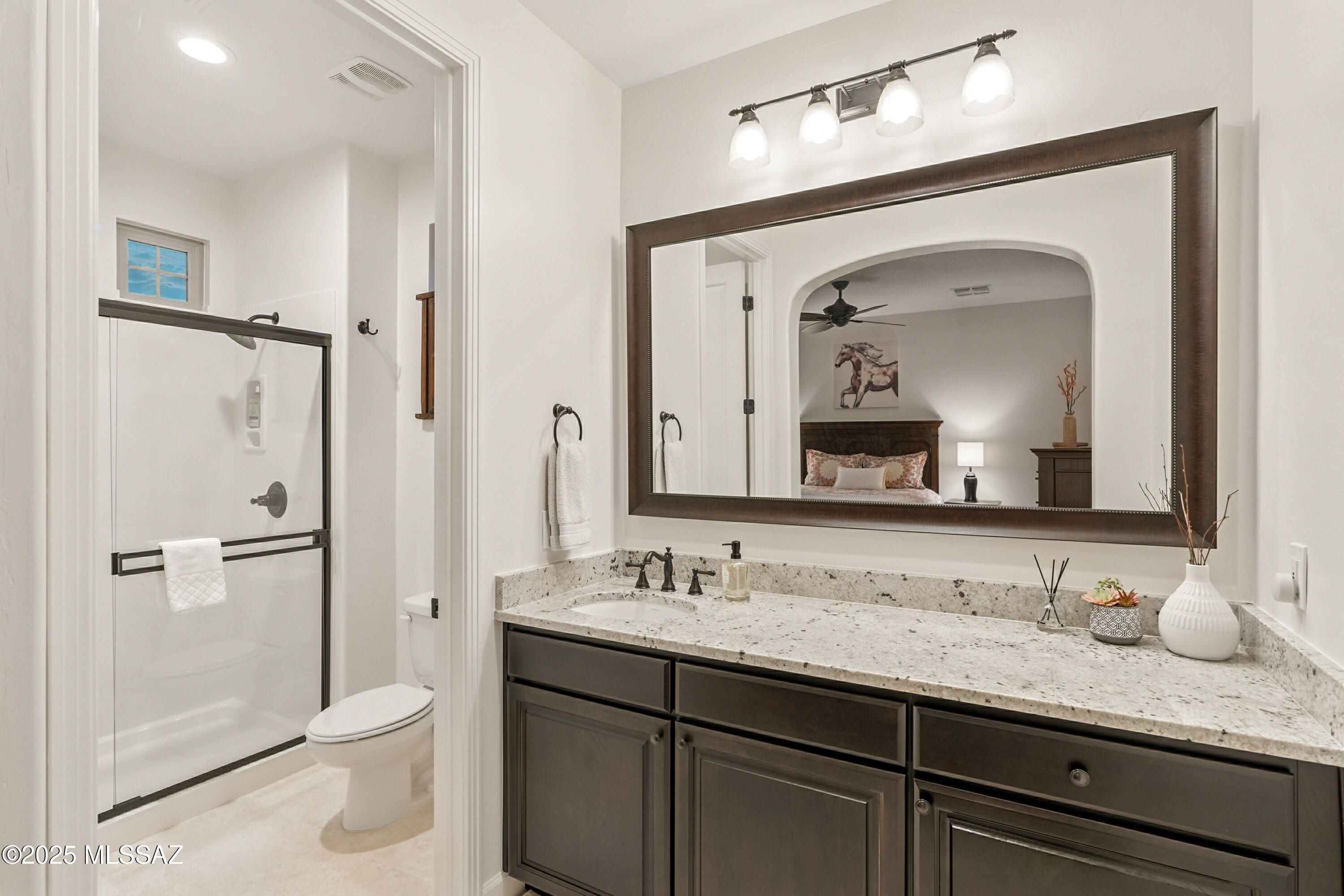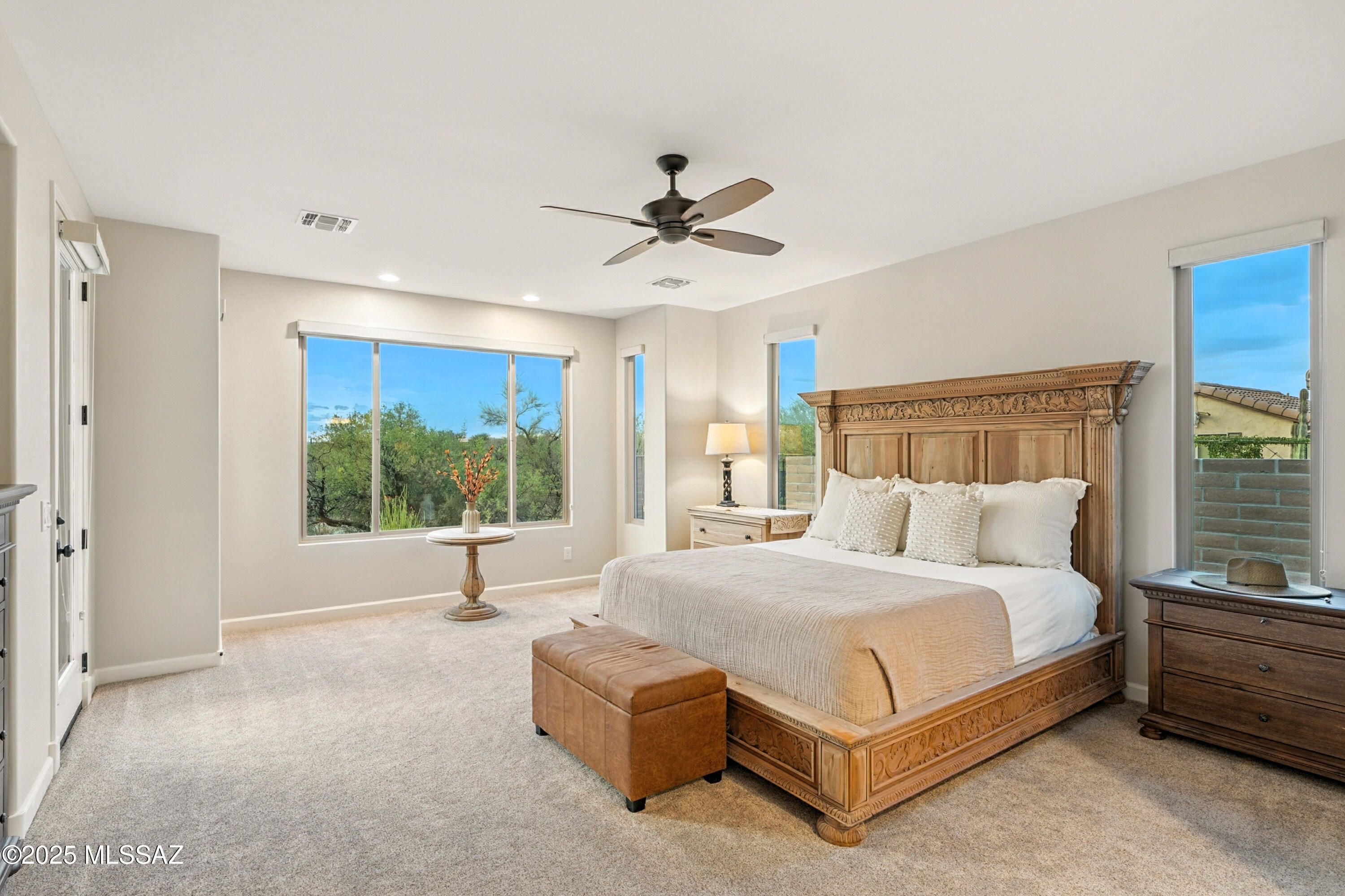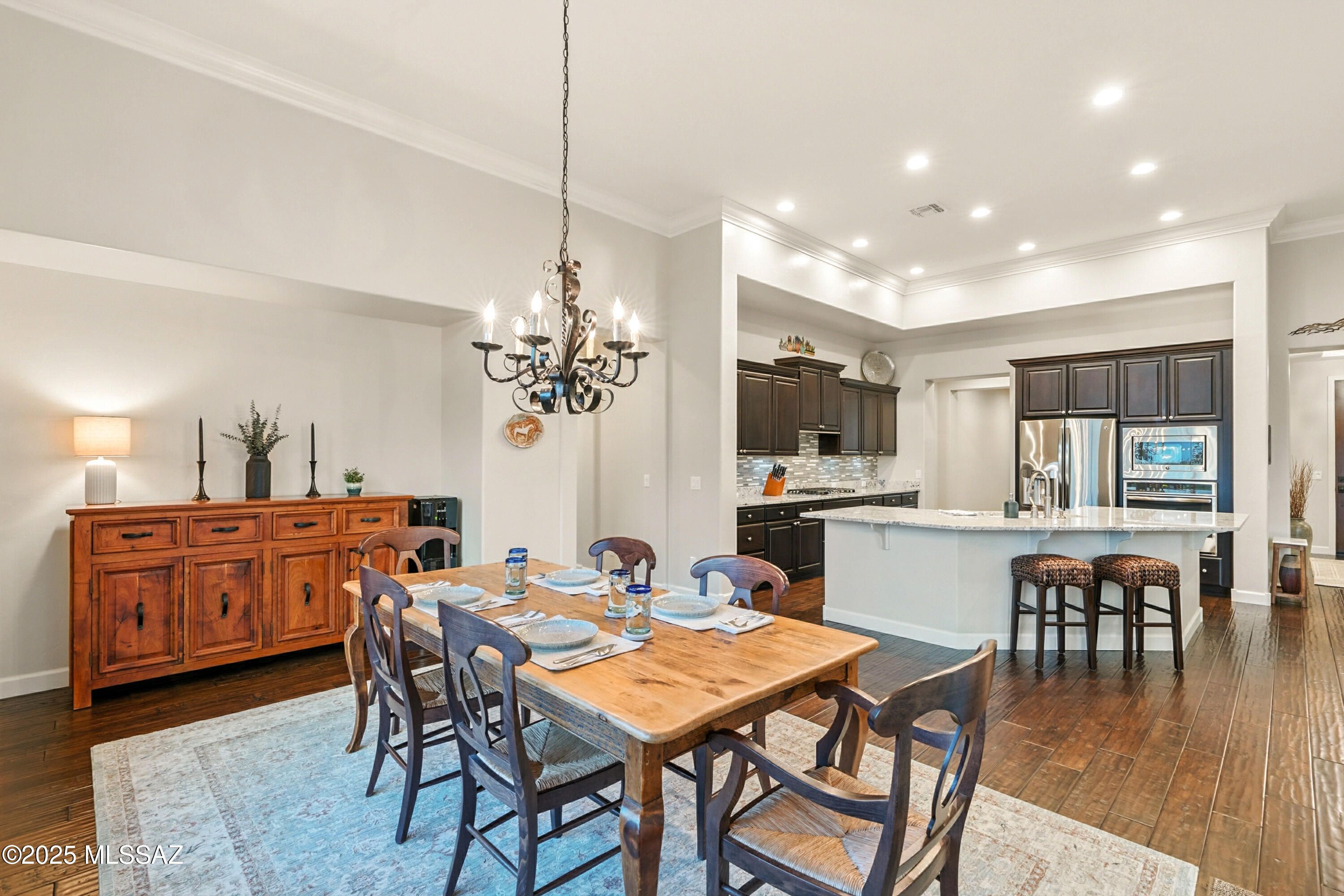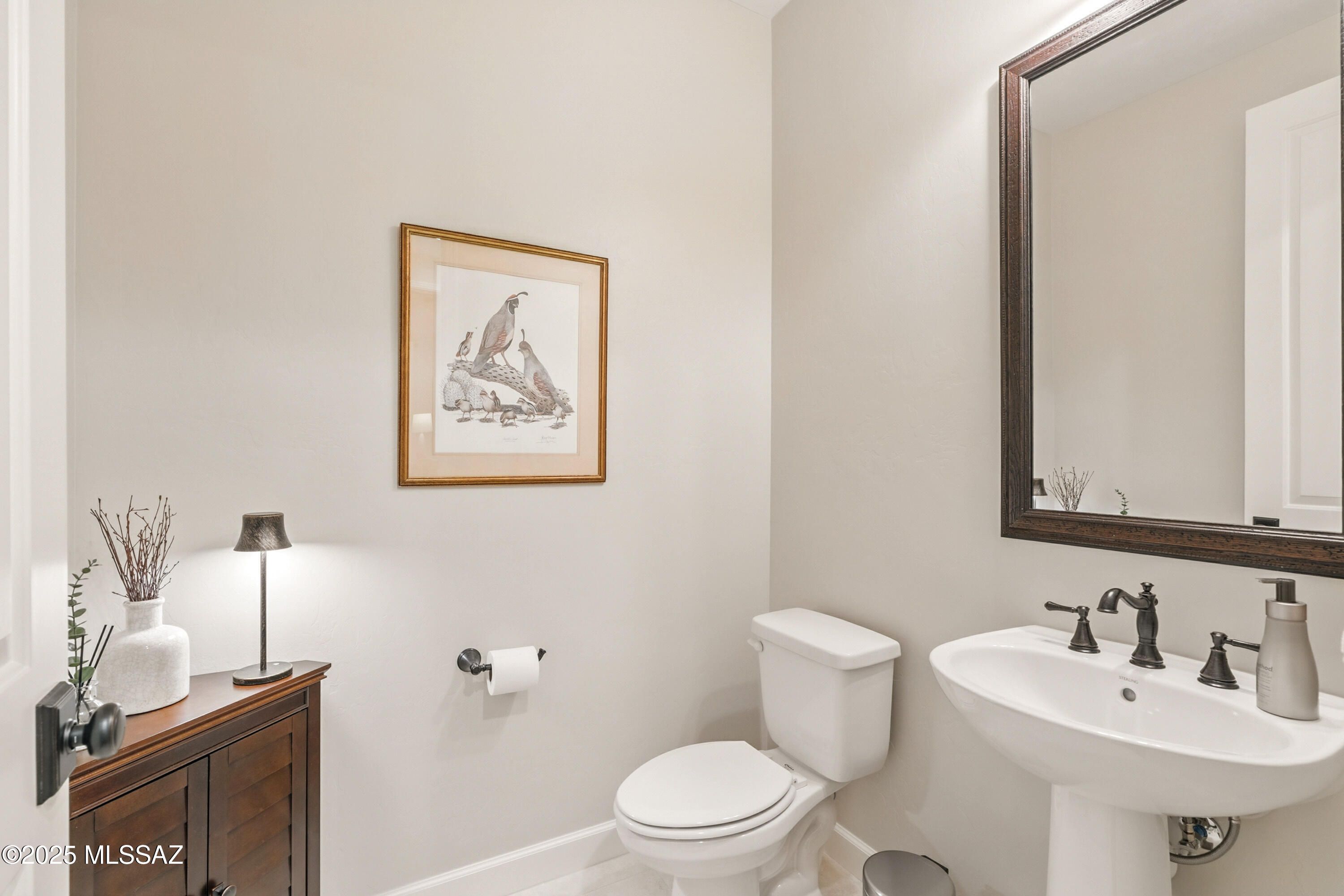 Breathtaking views! Located on a sought-after street in Quail Creek, this Spanish Colonial Sonata model w/ private entry Casita offers 2,821 total sq.ft., incl. 3 BR, 3.5 BA, Den and multi-purpose room, and backs to pristine natural desert with spectacular views of Mounts Wrightson, Hopkins and Elephant Head. Wonderful curb appeal w/ gated front courtyard, stunning wood entry door. Inside are soaring 12' ceilings in the kitchen, great room and dining area, crown moulding, hand scraped hardwood flooring, and plenty of windows to take in the stunning views. Kitchen has a grand island w/ granite counters, upgraded cabinets, SS appliances, 36'' gas cooktop, new Bosch dishwasher. Wake up to sunrise over the Santa Rita's, the expanded Owner's Suite has box bay window and exit to rear patio.