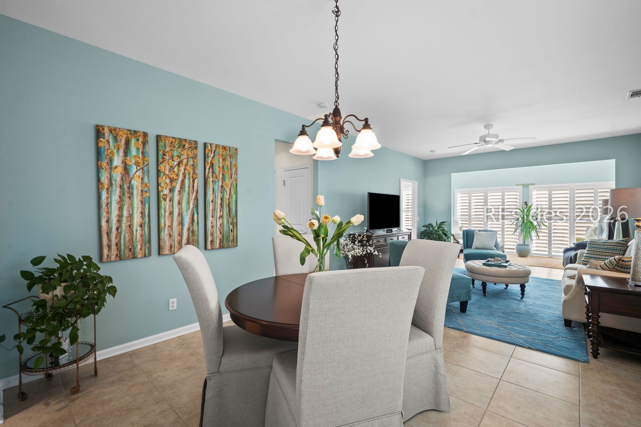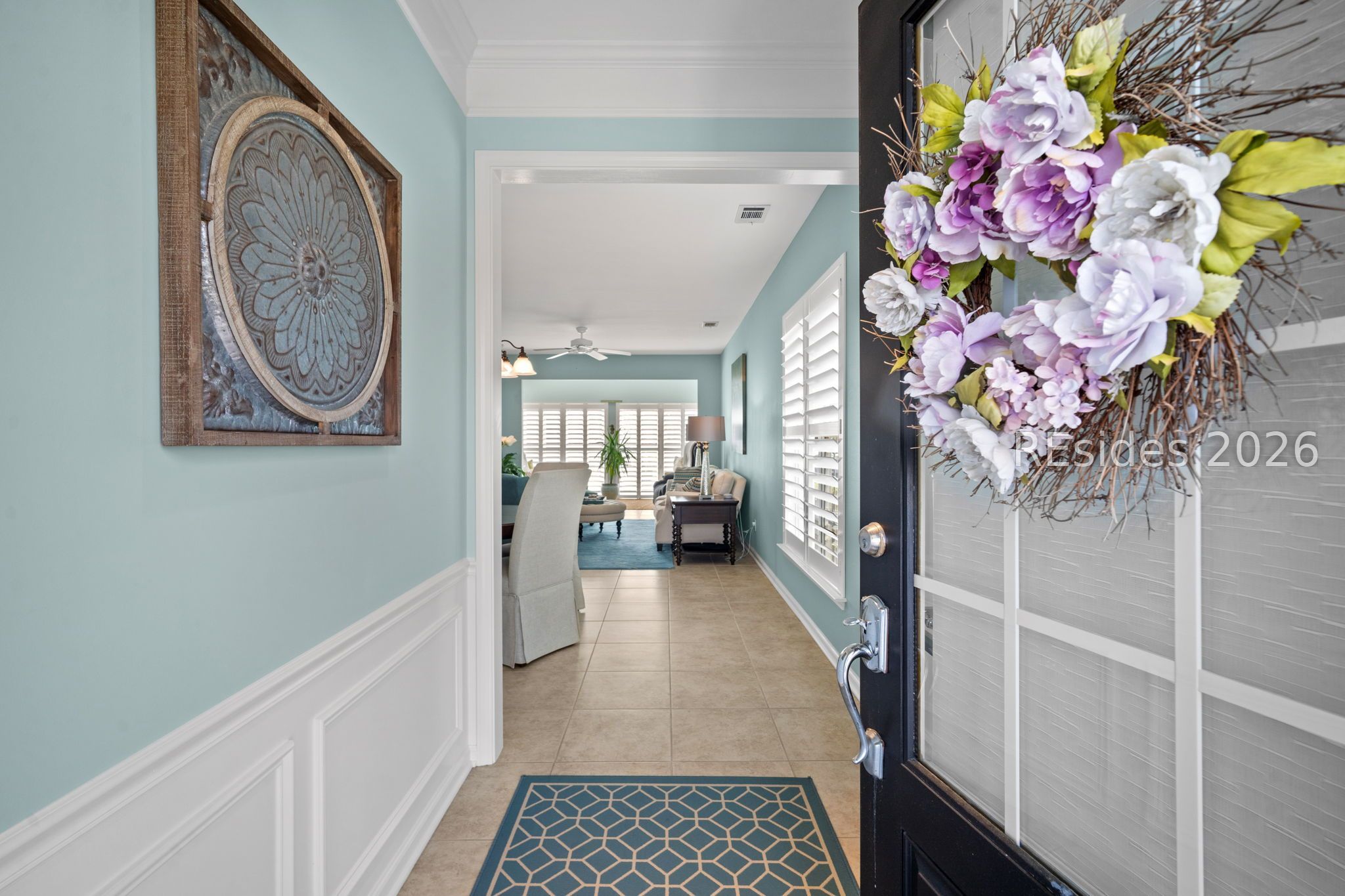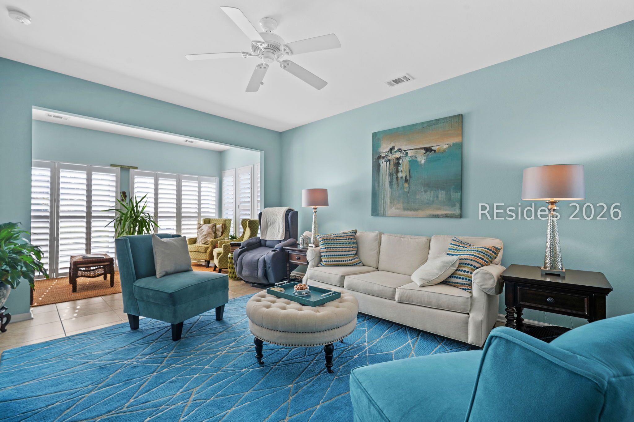 Move-in ready, meticulously maintained 2-bedroom, 2-bath highly sought-after Fox Run model on a corner lot in the Garden Walk neighborhood of Sun City Hilton Head, a 55+ community. This 1,356 sq ft home shines with recent updates: new roof (2020), new vinyl siding (2021), new refrigerator (2023), new water heater (2021), new washer (2019), and new HVAC (2019). Kitchen features Corian countertops, an island, and flows into a cozy living area with a sun-filled Carolina room. Tile floors in main living spaces and plantation shutters throughout add easy-care style and elegant light control, while bedrooms offer plush carpet. Low-maintenance exterior and all the Sun City perks: pools, trails, clubs, optional access to three golf courses (memberships available), and that classic Lowcountry charm. Buy with confidence, 1 year home warranty included!