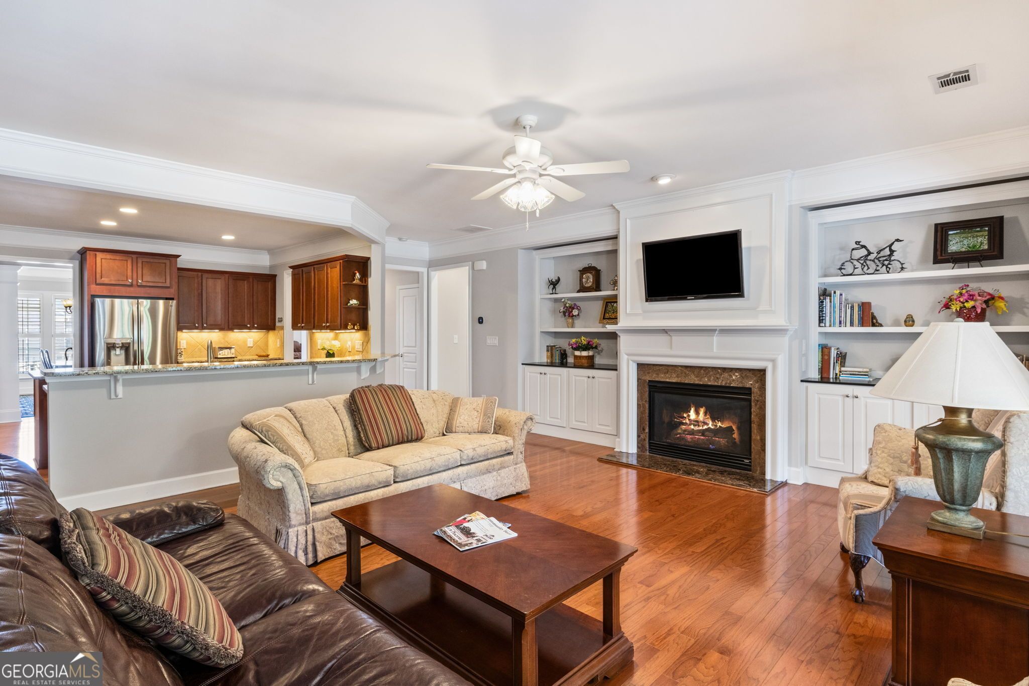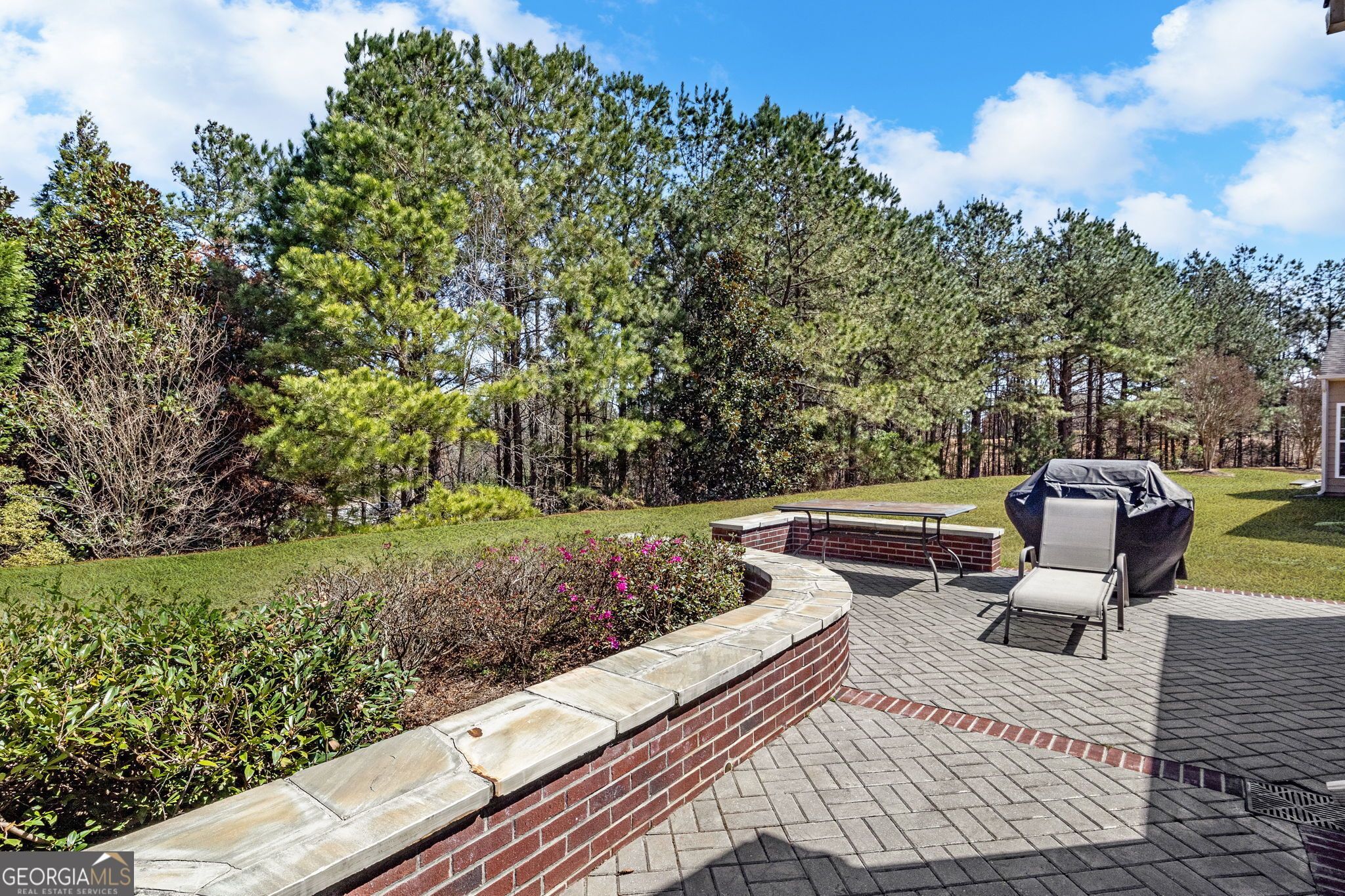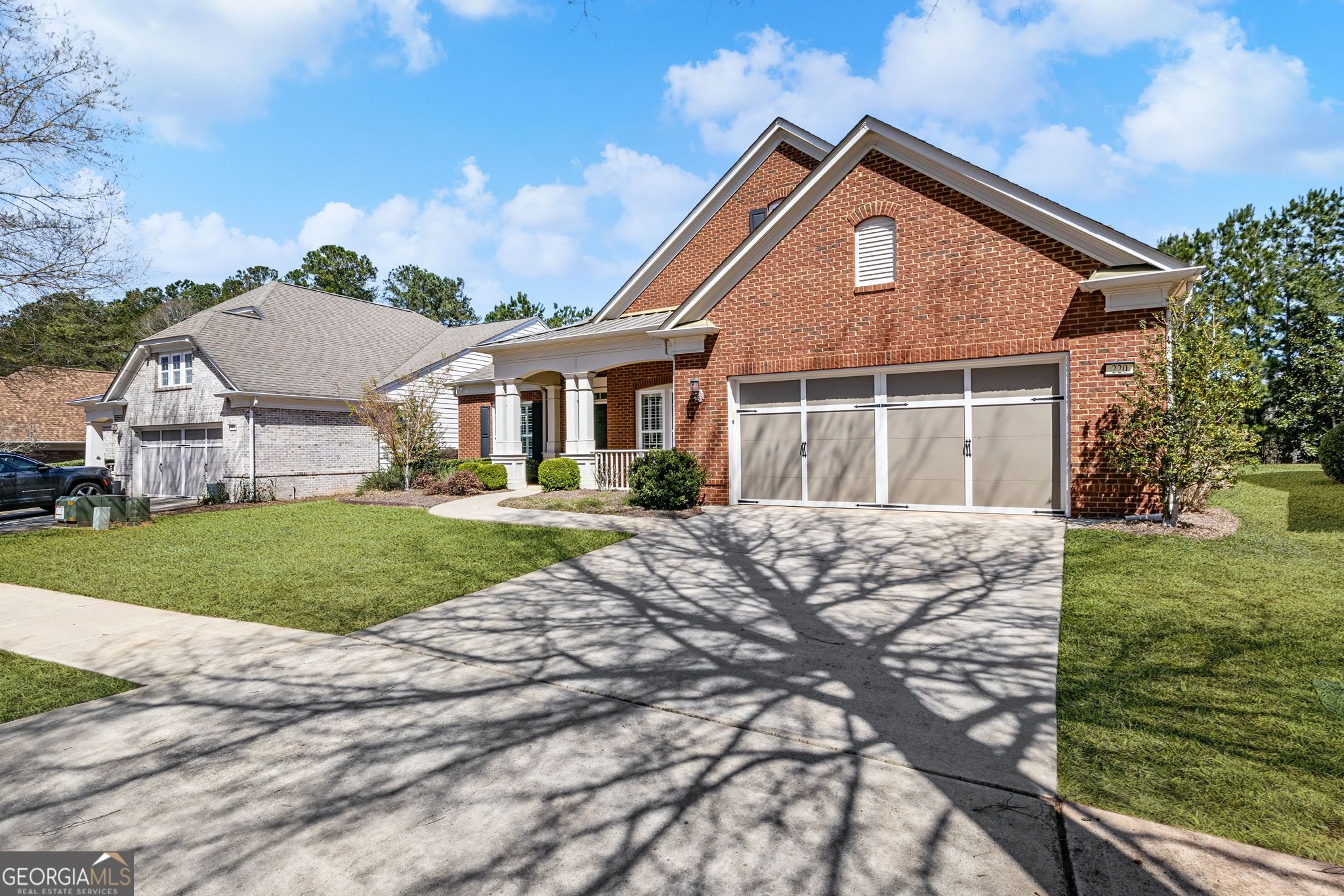 NEW LISTING! Beautifully maintained ranch-style home in sought-after Sun City Peachtree offering 2985 sq ft of thoughtfully designed, single-level living. This spacious 3-bedroom, 3.5 bath home features desirable split-bedroom floor plan, providing privacy and comfort for both owners and guests. A welcoming foyer opens to large formal dining room with an elegant trey ceiling, comfortably seating 12+ perfect for entertaining. Just off the entry is a private officestudy complete with custom built-in desk and cabinetry, ideal for working from home. The heart of the home showcases an open- concept kitchen, family room, and sunroom. The kitchen is appointed with granite countertops, stainless steel appliances, prep island, breakfast bar and an oversized walk-in pantry- larger than most. The adjoining family room features a gas-starter fireplace, custom built-in bookshelves, and plantation shutters throughout. The tiled sunroom offers serene views of the wooded backyard, bringing in abundant natural light. the spacious owner's suite includes a well-appointed bath with cultured marble double vanities, soaking tub, large walk-in shower, and a generous walk-in closet. Both the primary and guest rooms have their own dedicated full baths, ideal for hosting visitors. The laundry room includes a utility sink, cabinetry, and a window for added light. Outdoor living continues with an extended stone patio featuring stone knee wall, offering privacy and wooded views- perfect for relaxing or entertaining. Additional highlights include a 4 ft extended garage with epoxy flooring and a walk-up stairway to storage above the garage providing ample space. This is the Morningside Lane plan.
