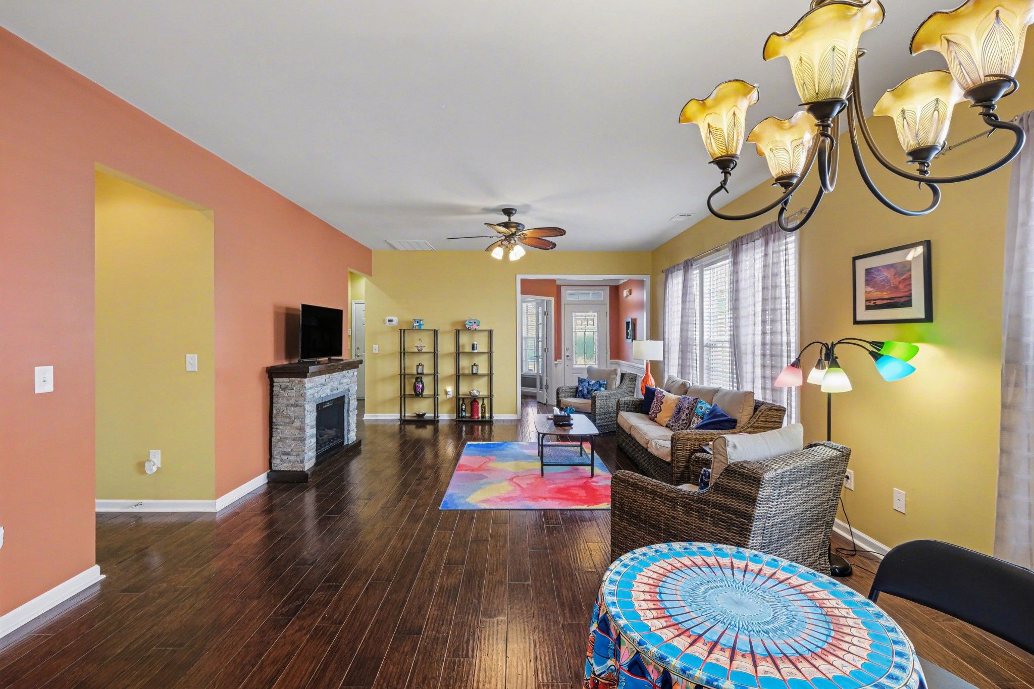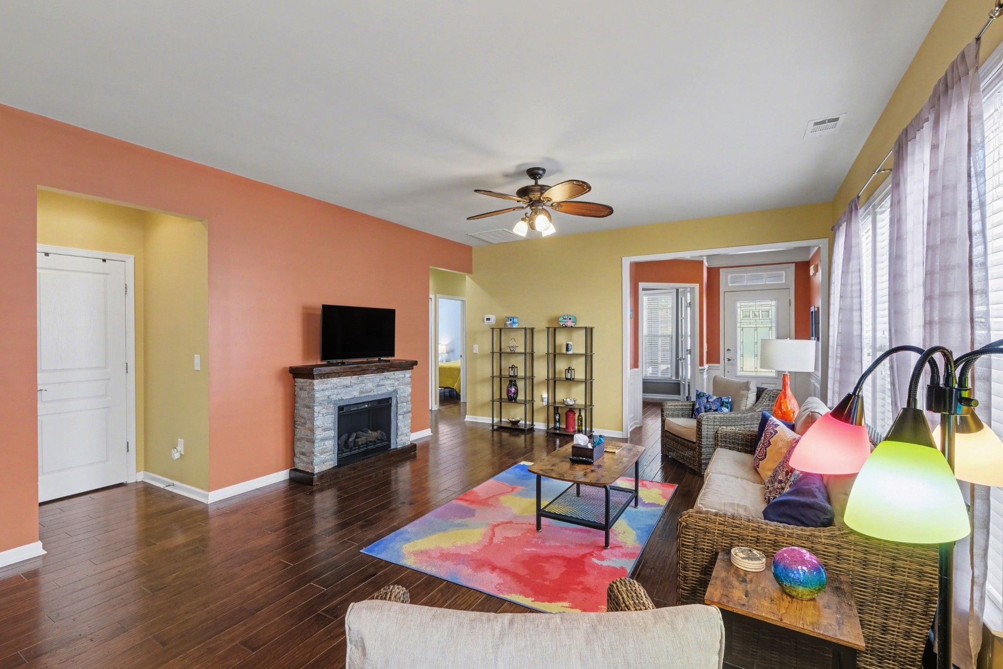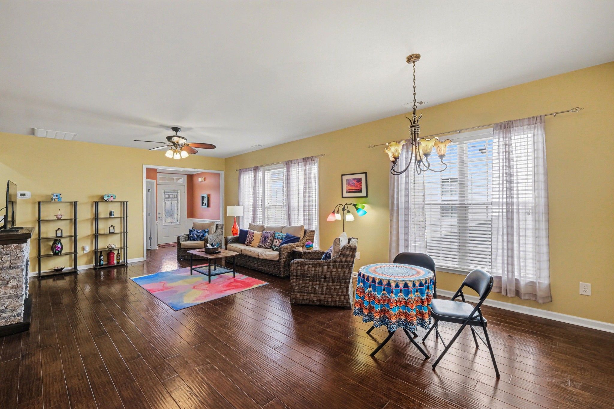 Well-kept Pine Springs plan in gated 55+ Del Webb at Lake Providence offering an active, amenity-rich lifestyle. Thoughtfully designed single-level, step-free home with 2 bedrooms, 2 full baths, and a flexible third bedroom ideal for office or guest use. Hardwood floors throughout with no carpet. Open layout with generous living and dining spaces and abundant natural light. Kitchen flows into living area and features granite countertops, gas range, tile backsplash, under-cabinet lighting, two pantries, and dining nook. Spacious primary suite includes double vanities, oversized walk-in closet, and plenty of natural light. Screened-in patio backs to a private, tree-lined berm, creating a peaceful outdoor setting. 2-car garage with attic storage, whole house surge protector, and irrigation system. Community offers clubhouse, indoor and outdoor pools, fitness center, indoor walking track, pickleball, tennis, walking trails, paddle boats, and stocked lake.