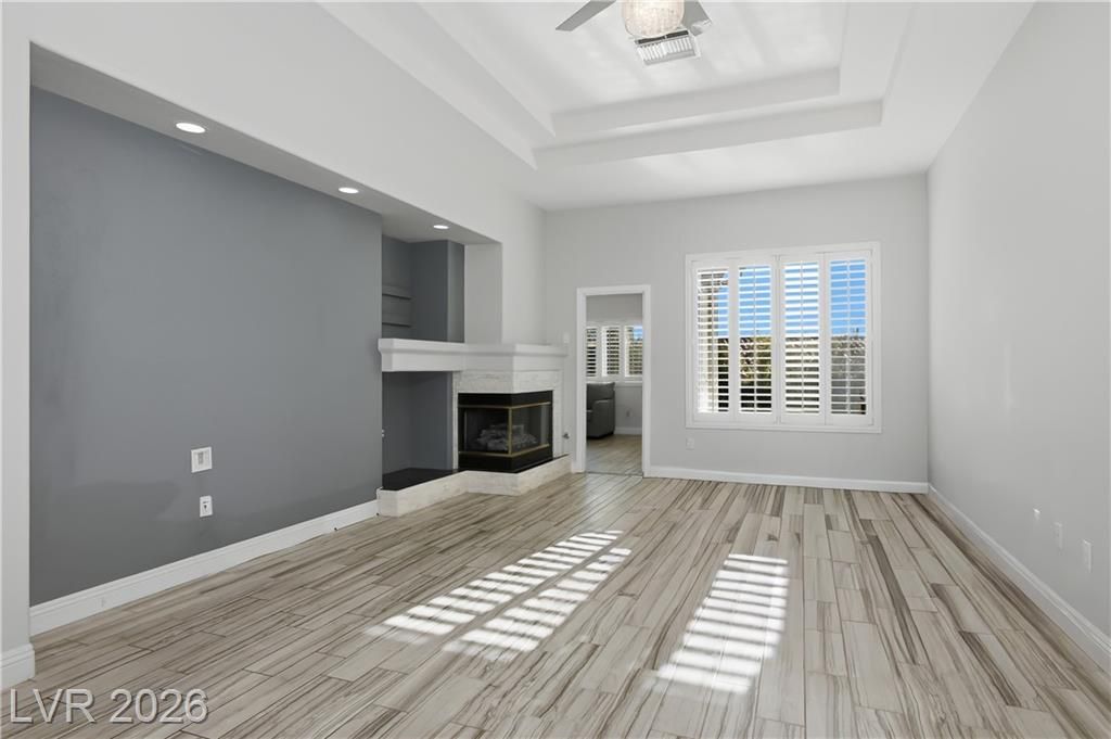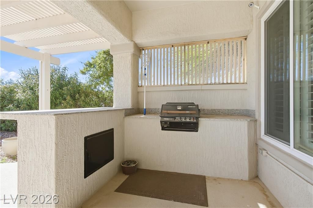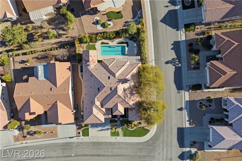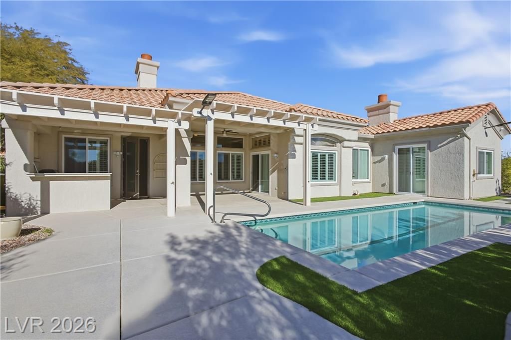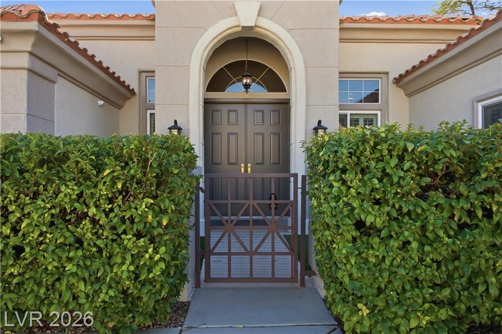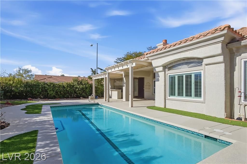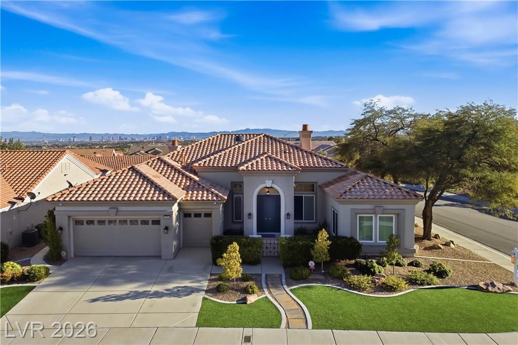 A refined retreat in Sun City Summerlin, this expanded Aristocrat model offers 3,008 sq. ft. of updated living space with 3 bedrooms (dual primary en-suites), 2.5 baths, and a private heated pool. Perched on an elevated lot, the resort-style backyard is designed for effortless entertaining, featuring privacy & shade trees, extended patio covers, Kool Deck–style finished decking, a built-in outdoor kitchen, low-maintenance turf, and curated garden spaces. Inside, soaring double tray ceilings, five skylights, and recessed LED lighting fill the home with natural light, while high-end luxury vinyl plank flooring and coordinating tile create a modern, cohesive aesthetic. A gated courtyard with sweeping mountain views and security-enhanced entry sets an impressive arrival. The primary en-suite includes an expanded flex room ideal for a home office, gym, or private retreat. Finished with a closed-circuit security system, this home delivers comfort, style, and elevated desert living.