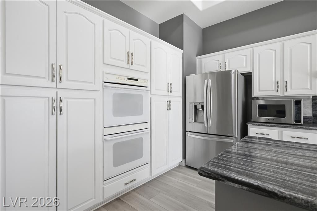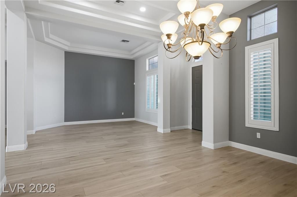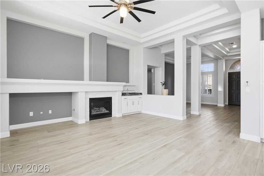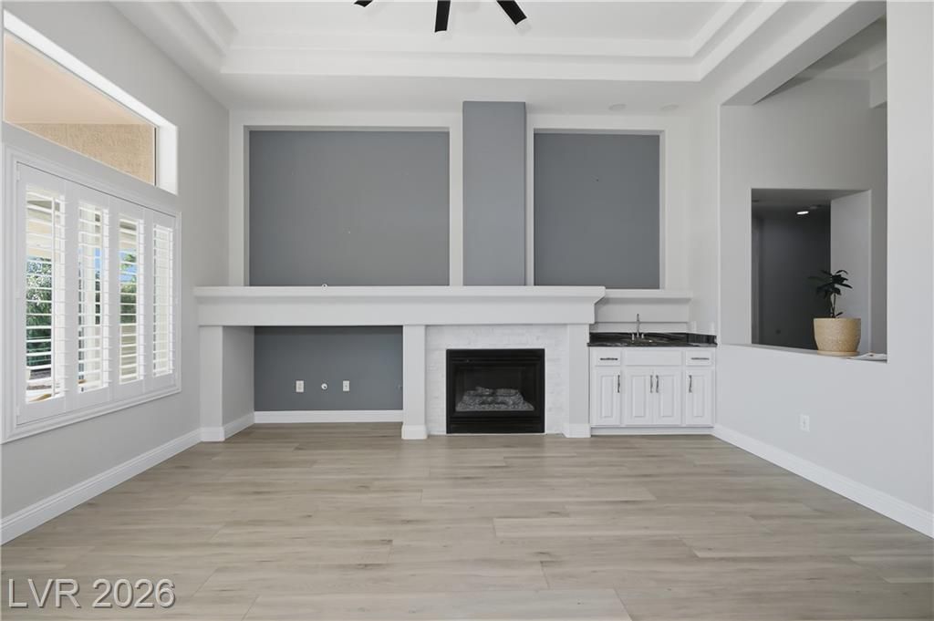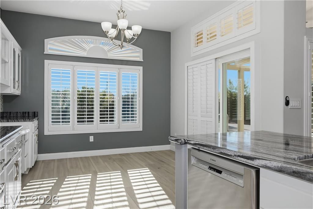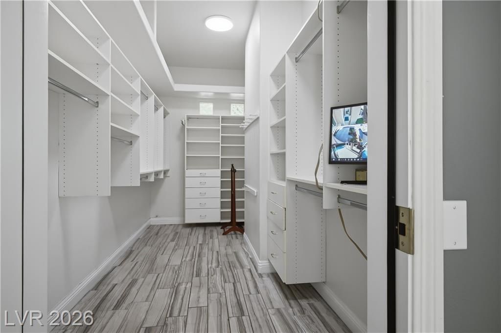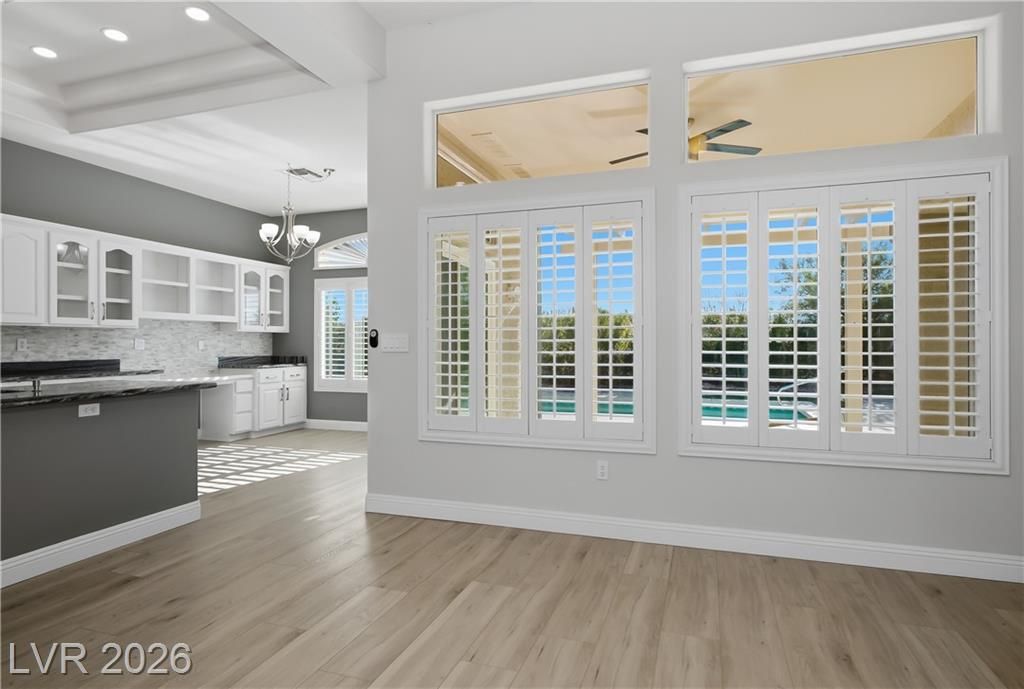 A refined retreat in Sun City Summerlin, this expanded Aristocrat model offers 3,008 sq. ft. of updated living space with 3 bedrooms (dual primary en-suites), 2.5 baths, and a private heated pool. Perched on an elevated lot, the resort-style backyard is designed for effortless entertaining, featuring privacy & shade trees, extended patio covers, Kool Deck–style finished decking, a built-in outdoor kitchen, low-maintenance turf, and curated garden spaces. Inside, soaring double tray ceilings, five skylights, and recessed LED lighting fill the home with natural light, while high-end luxury vinyl plank flooring and coordinating tile create a modern, cohesive aesthetic. A gated courtyard with sweeping mountain views and security-enhanced entry sets an impressive arrival. The primary en-suite includes an expanded flex room ideal for a home office, gym, or private retreat. Finished with a closed-circuit security system, this home delivers comfort, style, and elevated desert living.