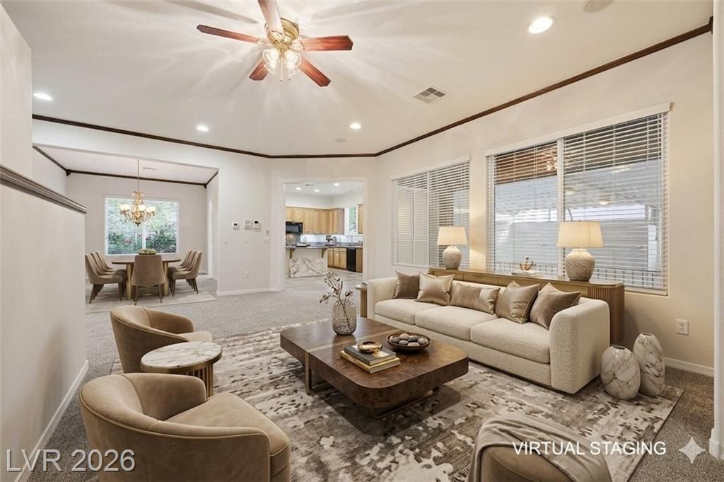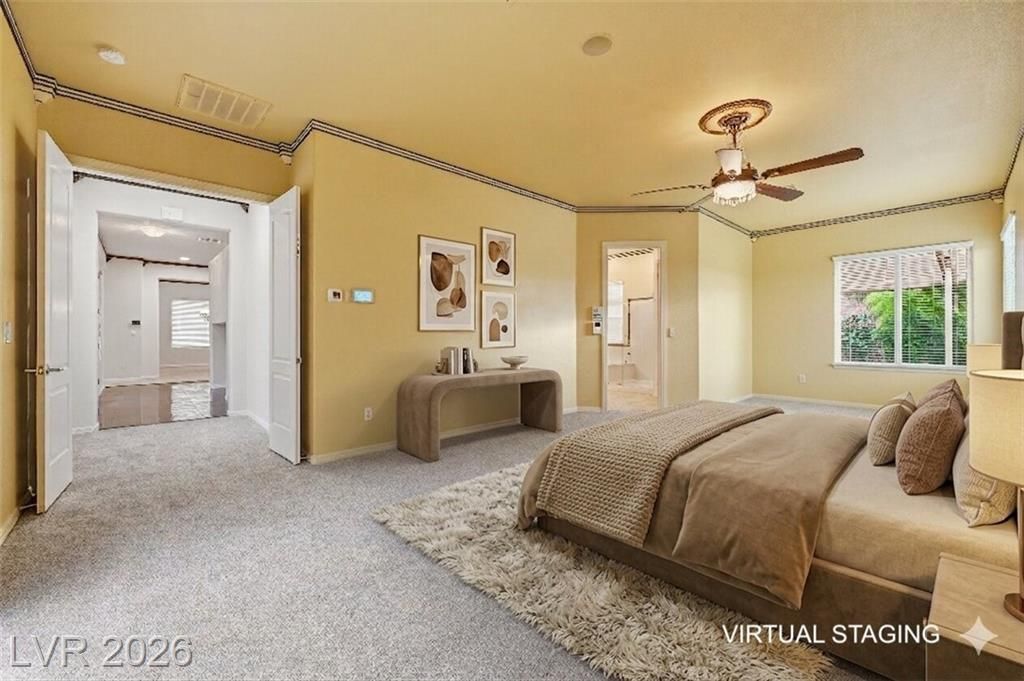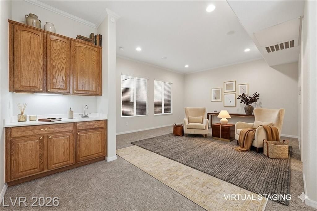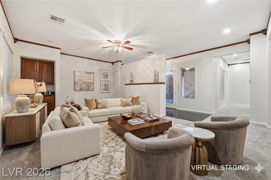Set on Sun City Anthem’s largest lot at .57 acres, this rare property offers 2827sqft of total living space, including a 459sqft casita ideal for guests, hobbies, or multigenerational living. The expansive backyard, ideal for outdoor gatherings, offers a huge covered patio, rose garden, fruit orchard, and exceptional space to design your outdoor retreat—ample room for a pool and pickleball court. Inside, new carpet and fresh paint create a move in ready feel. Designed for both comfort and style, the generous kitchen has granite counters, stainless appliances, pantry and plenty of cabinet space. The adjacent family room features a wet bar and is perfect for entertaining family & friends. The spacious primary suite, with plenty of natural light, is the perfect retreat, offering a walk-in closet and an ensuite bath with dual sinks and separate tub & shower. Conveniently located near shopping, dining, entertainment, plus the many recreational amenities of Henderson’s premier 55+ community.