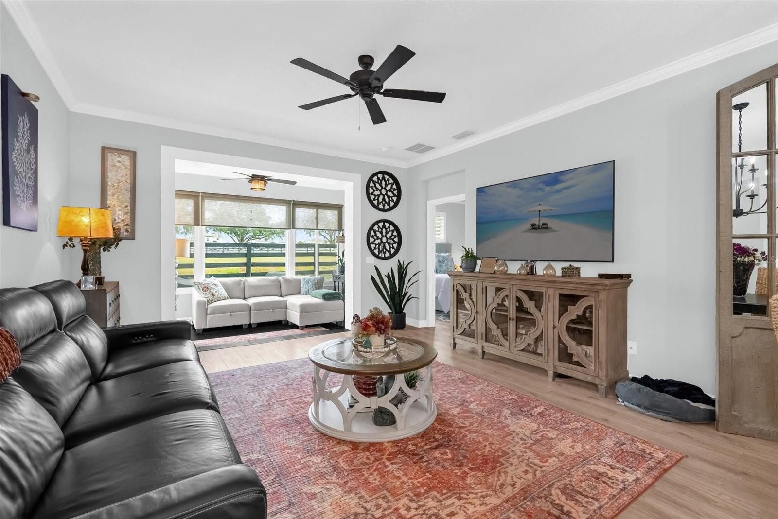 Totally Updated 55+ Garden Home in Gated Sullivan Ranch – Mount Dora. Welcome to Sullivan Ranch, a sought-after 55+ gated community in Mount Dora, just minutes from historic downtown with easy access to SR-429. This beautifully maintained Garden Home built in 2013 is loaded with upgrades and truly move-in ready. The freshly painted exterior, enhanced landscaping with decorative rock and borders, buried downspouts, updated exterior lighting, and a new 15’ x 30’ paver patio create incredible curb appeal. A custom solid mahogany stained-glass front doormakes a stunning first impression. Inside, you’ll find 9’4” ceilings, fresh interior paint (including ceilings), vinyl plank wood flooring throughout, plantation shutters, 5.25” baseboards, and crown molding throughout. The kitchen features 42” cabinets, granite countertops and backsplash, and new stainless appliances including refrigerator, dishwasher, and stove. A sunroom addition offers custom shades, a beautiful rock feature wall, and tile flooring—perfect for relaxing or entertaining. The spacious primary suite includes a new feature wall, and the fully updated primary bath boasts a double quartz vanity, LED mirrors, new toilet, and a custom shower. Additional highlights include: • New HVAC (2025) with ECO thermostat • Water softener (2024) • Additional blown-in attic insulation • Attic ladder & ceiling storage racks • Updated laundry room cabinetry & lighting • New ceiling fans and lighting throughout • Hot water heater inspected & element replaced (2024) • Roof inspected annually by HOA HOA: $457/month and includes lawn care, pest control, exterior painting, pressure washing, roof replacement at end of life, and access to top-notch amenities: clubhouse, junior Olympic pool, fitness center, walking trails, dog park, playground, and splash pad. Don’t miss this beautifully updated home in one of Mount Dora’s most popular communities—schedule your showing today!
