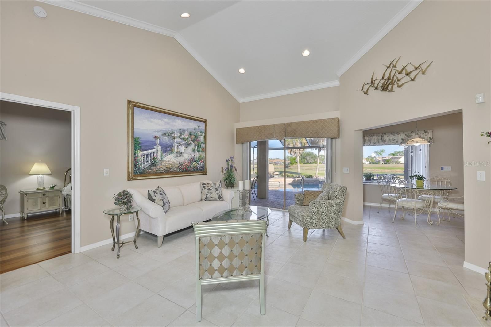 WELCOME TO YOUR BEAUTIFUL HOME THAT HAS IT ALL-POOL, RENISSANCE GOLF COURSE, & PANORAMIC VIEW FROM NEW (2025) HURRICANE RATED SCREENED LANAI CAGE, & IRRIGATION FROM THE POND. This is your chance to own your personal piece of paradise. The lovely, screened lanai, skillfully resurfaced pool with pavers & an accessible pool bath & outdoor shower is what makes this jewel a delightful place for entertaining all your family & friends. There is no mistaking the “pride of ownership” that's reflected in the home’s impeccable condition, but it's every wonderful detail that gives this home its pizzazz & attractiveness. This meticulously kept split Stonegate floor plan home is situated in the serene & highly desirable Royal Doulton Estates on the Southside of Sun City Center (SCC). Enter this home through the elegant double glass doors and you will fall in love with the phenomenal view, high ceilings, crown molding, neutral color scheme, & the formal living & dining area that open onto the extraordinary outdoor living space. In addition, the 16 x 16 tile flooring, premier light fixtures, and the abundance of windows provide tons of natural light; adding to this home’s enchanting feel. The upgraded gourmet kitchen has an abundance of attractive cream color cabinets, coordinating stone backsplash, exquisite granite countertops, and a separate island with plenty of space for creating your favorite dish & provides extra serving space when hosting a holiday gathering. Mealtime is a pleasure with your newer stainless-steel appliances which include a double wall oven, and separate cooktop. The breakfast bar & dinette area are encompassed by an aquarium glass window that provides an inspiring view to sit and plan your day. The primary ensuite bedroom has 2 walk-in closets & access your oasis where you can sip your favorite beverage & soak up the sun, take a dip in your pool, or watch the wildlife or golfers. The updated primary bath has a tall double vanity & stone counter to ceiling backsplash, and a convenient matching tower linen cabinet, large walk-in shower, grand soaking tub, & separate water closet. Continue through to your great room that leads you to your updated guest bath & also serves as your pool bath. Since the 2nd & 3rd bedrooms are located on the opposite side of the home it allows for extra privacy for you and your visitors and provides more closet & storage space. In fact, the 2nd bedroom has a sizeable walk-in closet that will aid you in keeping your home neat & organized. The oversized interior laundry room boasts a newer washer & dryer, plenty of storage cabinets, and desk/counter area-a great home office space. The 2-car garage offers even more storage & has a side door for easy access to tend to your lovely Florida friendly flowers & shrubs. UPGRADES: 2022: RE Plumbed & H2O Heater, 2020 Pool Heater, 2018: Lennox 4 Ton HVAC, 2017: ECO Water Softener, 2016: Ten New Windows, 2016: ACCORDION HURRICANE SHUTTER-ALL WINDOWS. ASK TO SEE THE HOME FEATURE SHEET. Sun City Center is an active 55+ community close to airports shopping & big city dining & entertainment. The community offers in & outdoor pools & spas, a well-equipped fitness center, a community hall, library, arts/crafts, outdoor sports, Pickle-ball, and golf. Start packing. Truly a MUST SEE. DON’T miss the opportunity to own this fantastic move in ready home & begin enjoying your own fabulous SCC Florida lifestyle! Hurry & schedule your private showing!