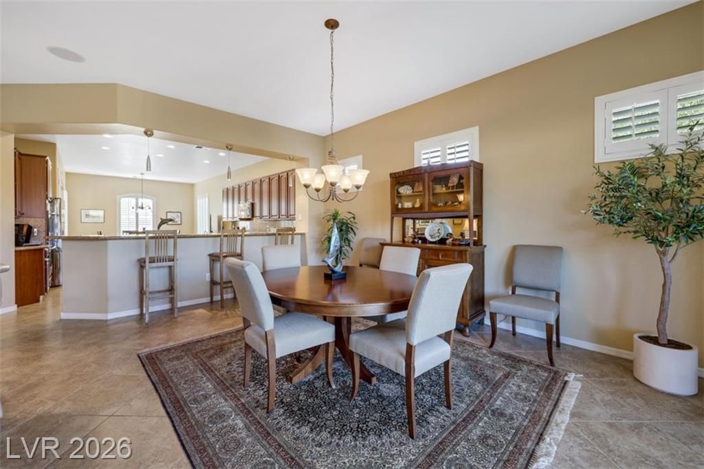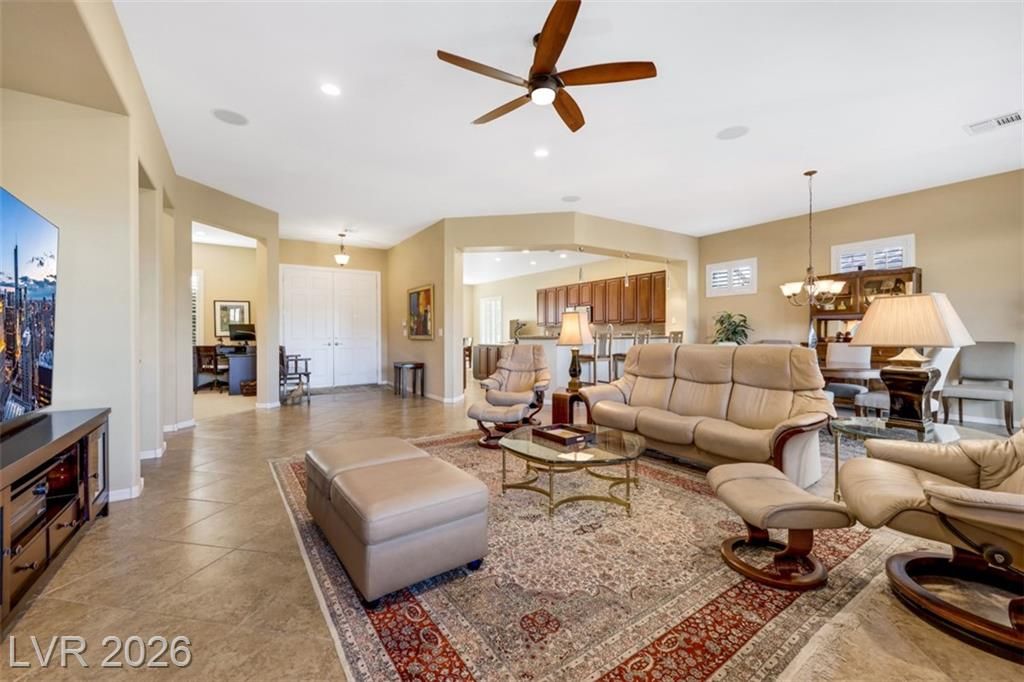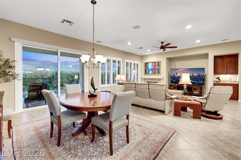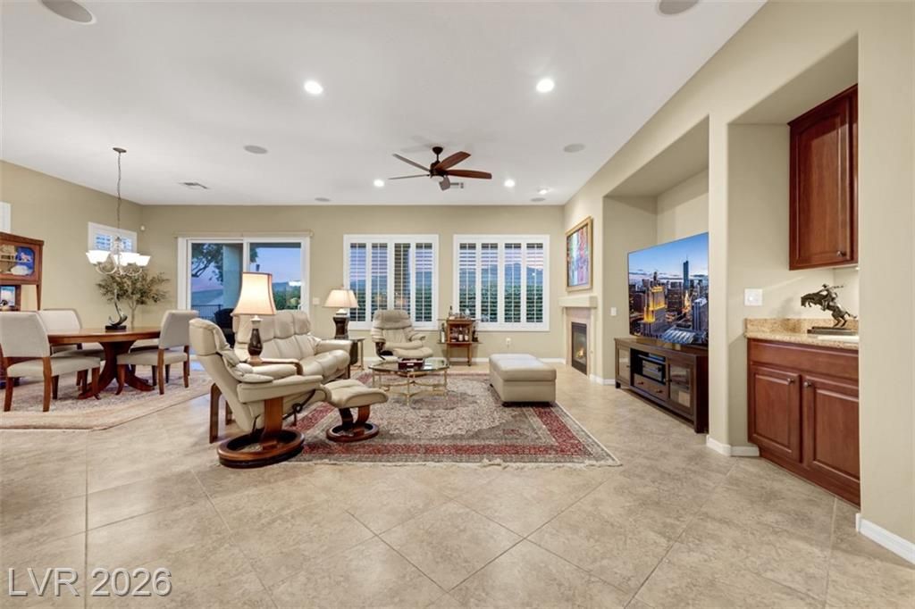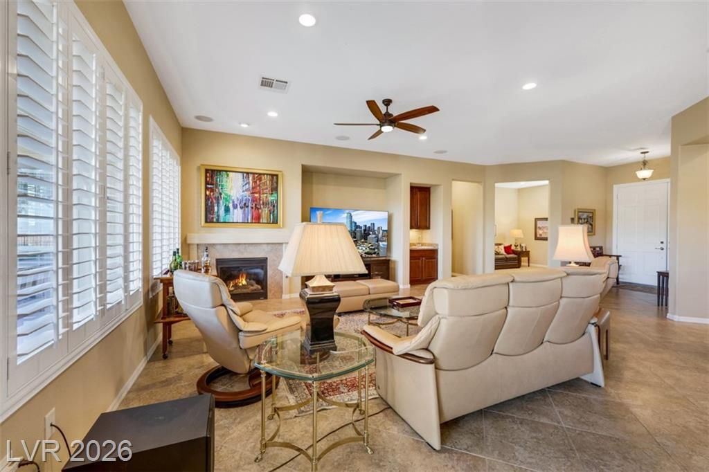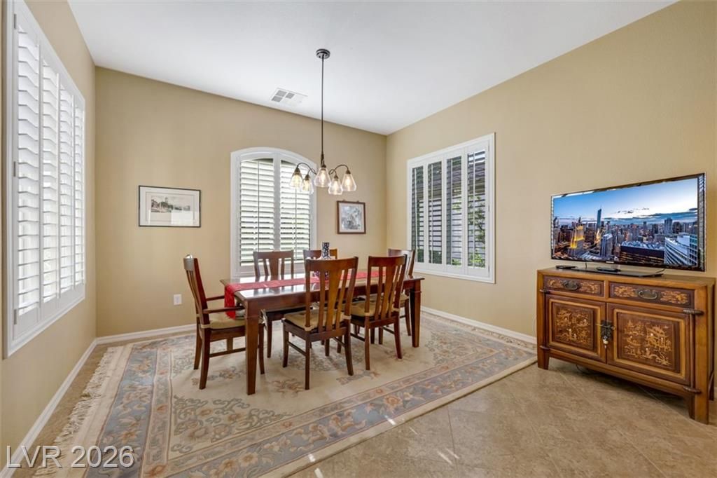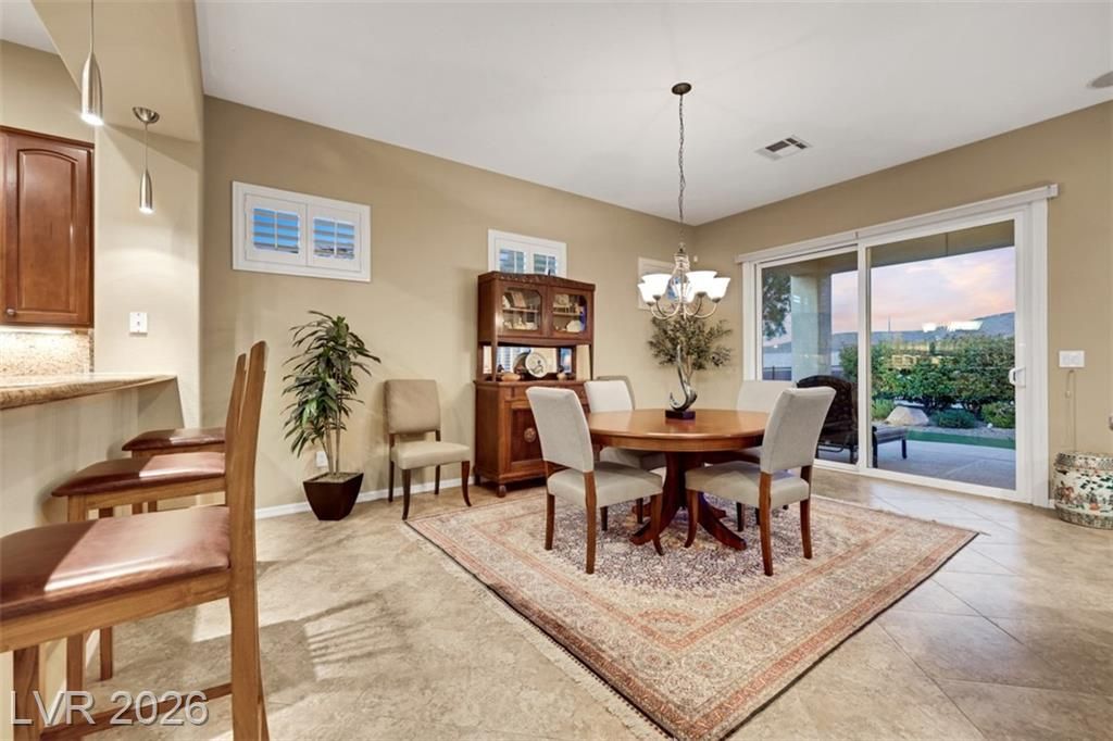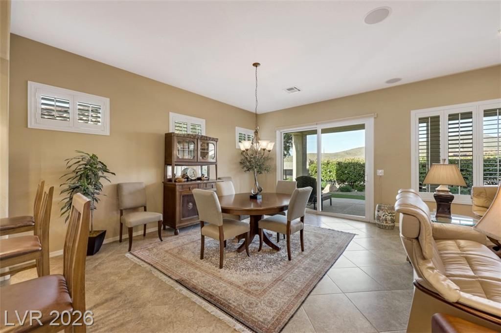 Elevated living meets refined comfort in this desirable Saratoga model in Sun City Anthem, offering partial city and mountain views, 2 bedrooms, 2.5 baths, and a den. Thoughtfully designed with tile flooring, high ceilings, and plantation shutters, the home feels bright, open, and effortlessly inviting. The oversized kitchen is a true focal point featuring granite countertops, a large island, and stainless steel appliances, ideal for both everyday living and entertaining. The spacious primary suite offers plush carpeting and direct access to the backyard, creating a seamless indoor-outdoor connection. The primary bath showcases a large soaking tub, perfect for unwinding, along with a well-designed, functional layout. Step outside to a covered patio where you can relax or entertain while enjoying the peaceful elevated setting with views. Located near Sun City Anthem’s premier amenities, this home offers the perfect blend of lifestyle, comfort, and convenience.