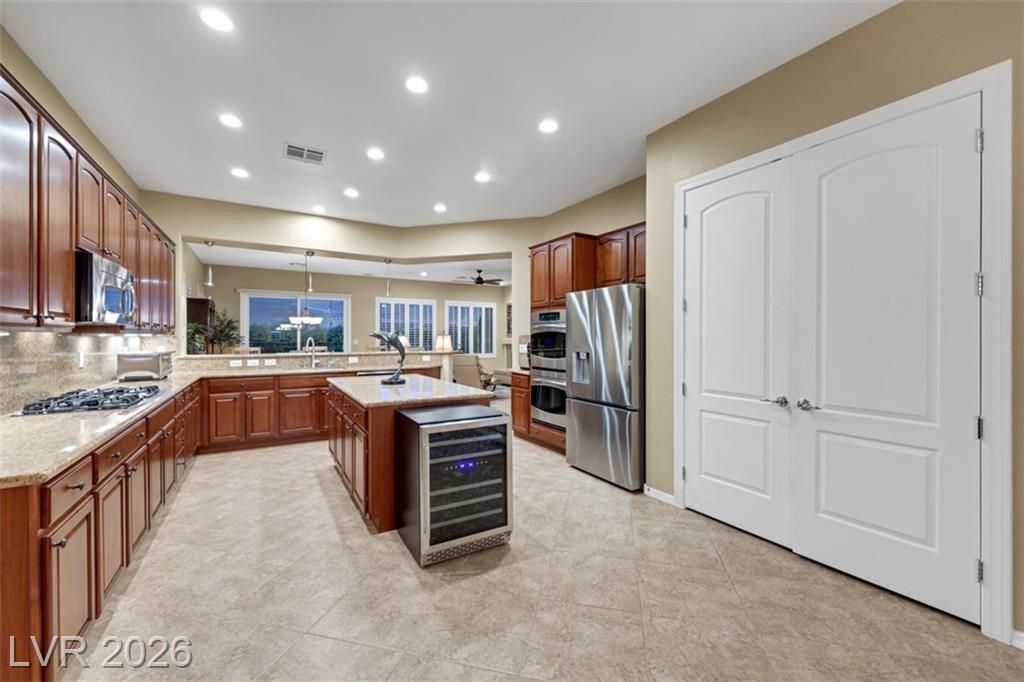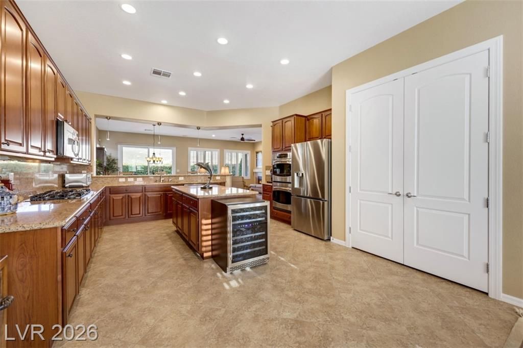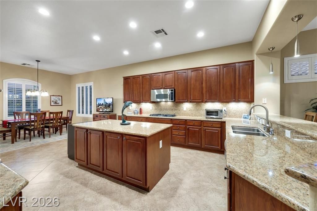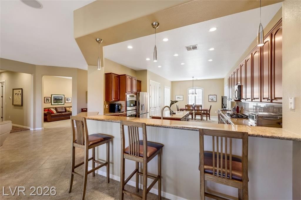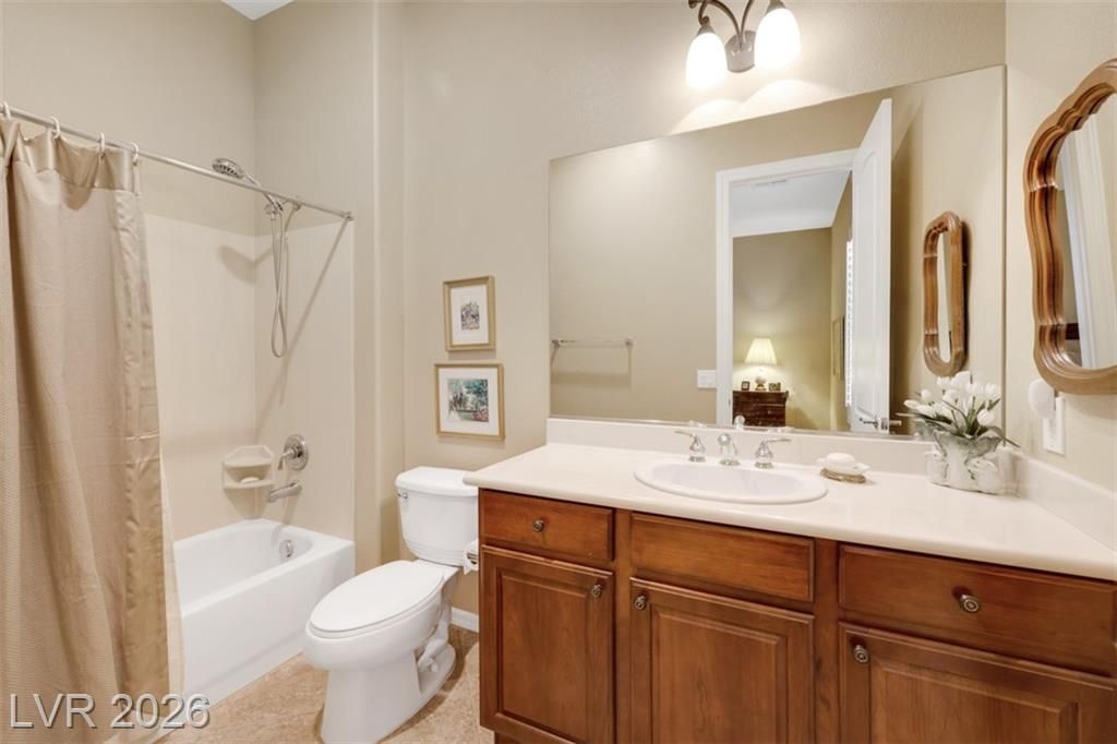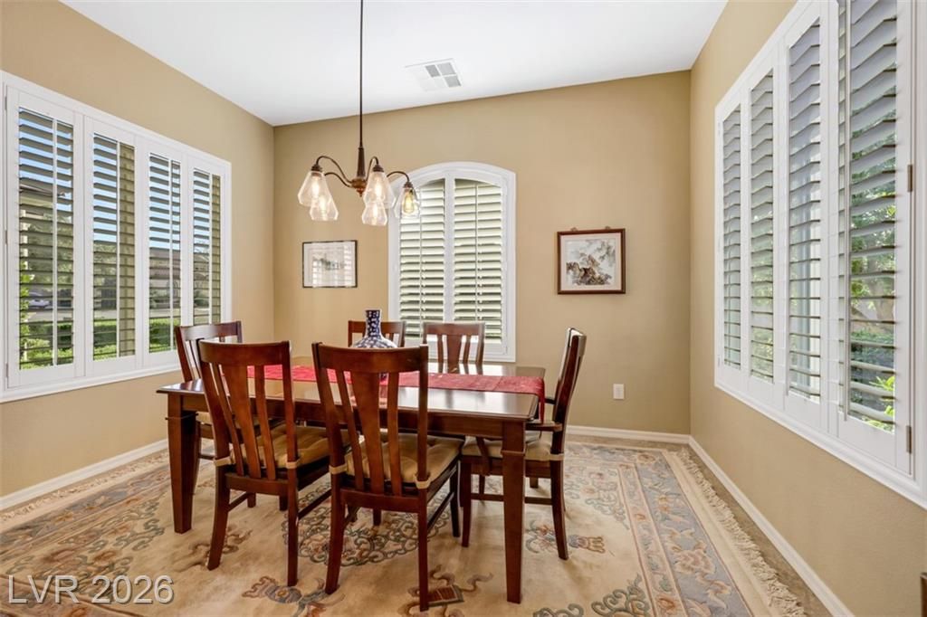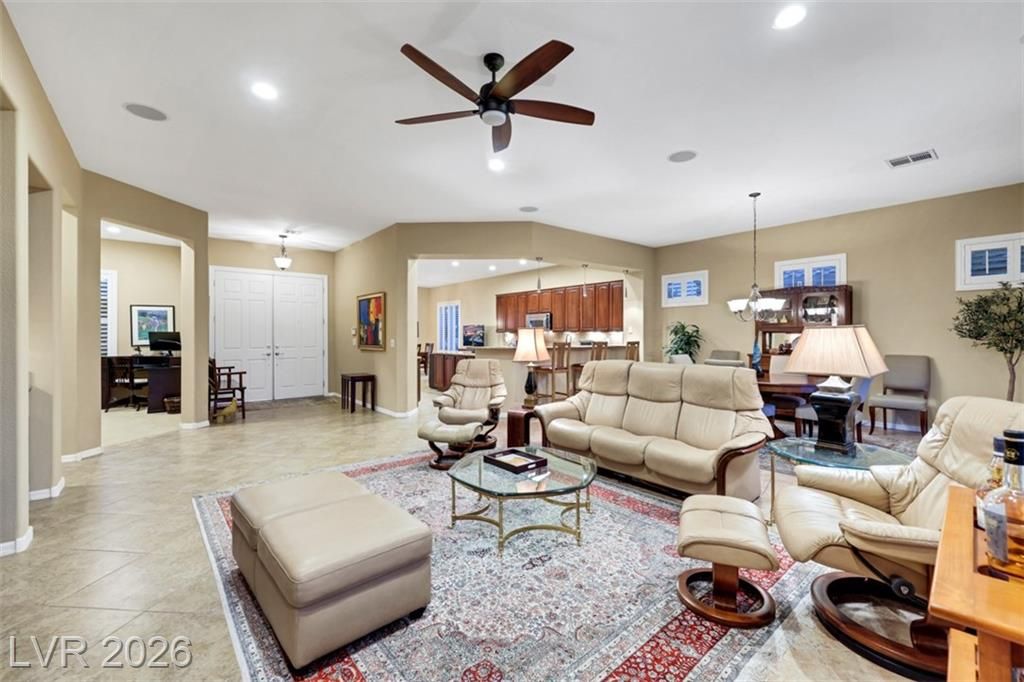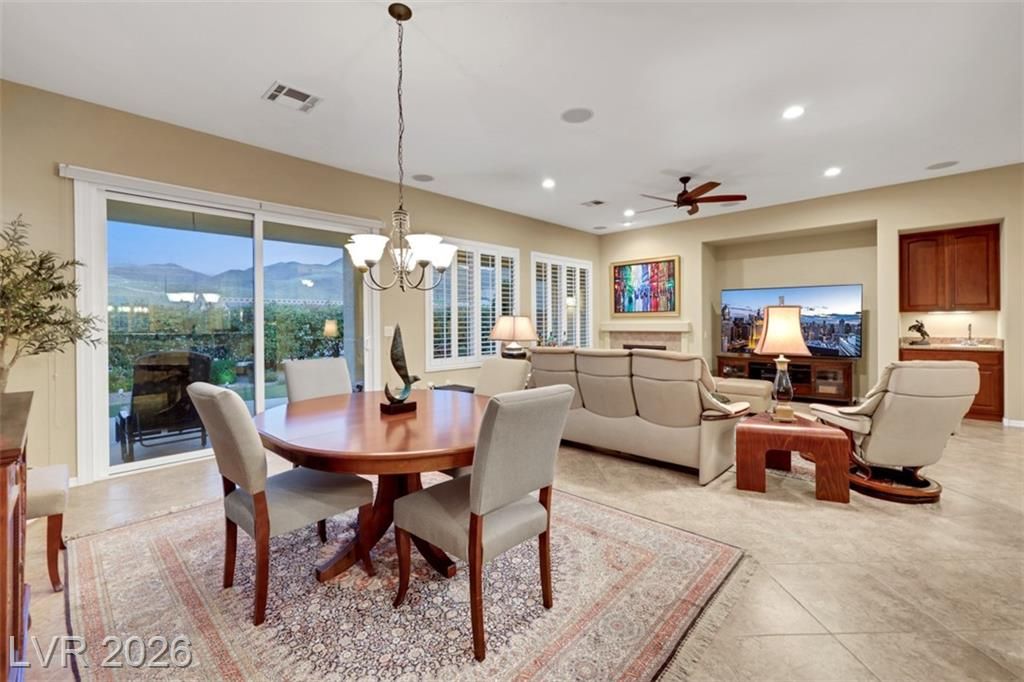 Elevated living meets refined comfort in this desirable Saratoga model in Sun City Anthem, offering partial city and mountain views, 2 bedrooms, 2.5 baths, and a den. Thoughtfully designed with tile flooring, high ceilings, and plantation shutters, the home feels bright, open, and effortlessly inviting. The oversized kitchen is a true focal point featuring granite countertops, a large island, and stainless steel appliances, ideal for both everyday living and entertaining. The spacious primary suite offers plush carpeting and direct access to the backyard, creating a seamless indoor-outdoor connection. The primary bath showcases a large soaking tub, perfect for unwinding, along with a well-designed, functional layout. Step outside to a covered patio where you can relax or entertain while enjoying the peaceful elevated setting with views. Located near Sun City Anthem’s premier amenities, this home offers the perfect blend of lifestyle, comfort, and convenience.
