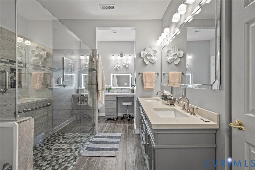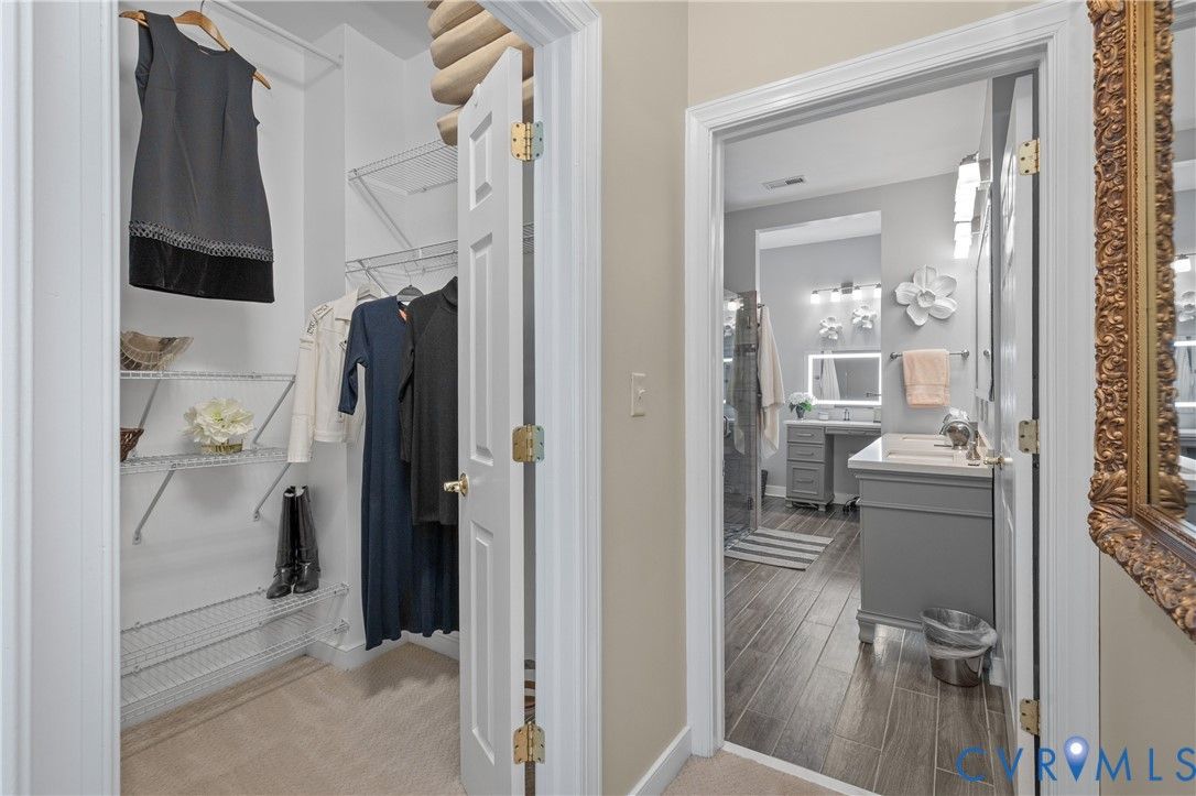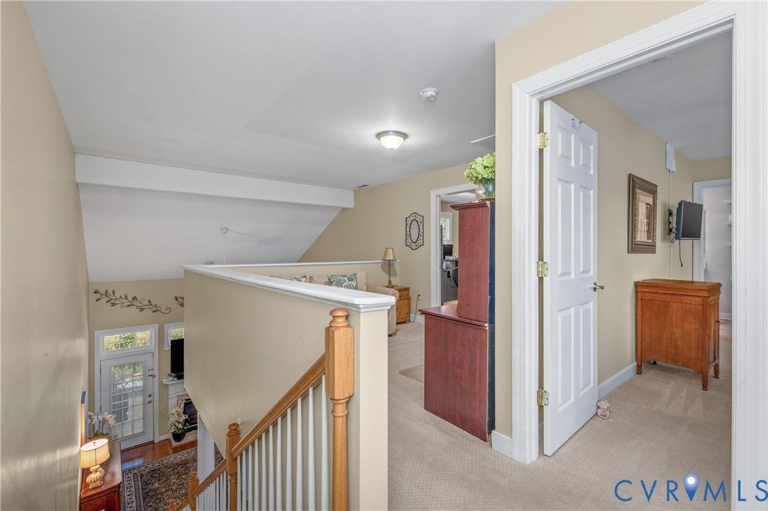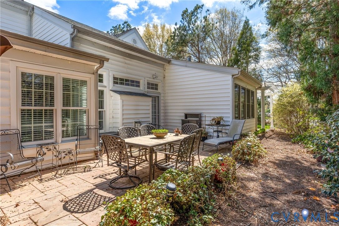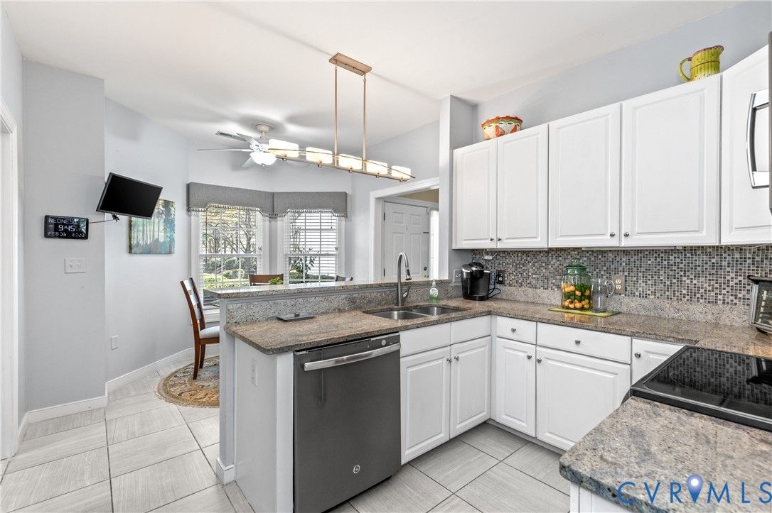 Welcome to easy, low-maintenance living in The Pointe at Bellgrade, a desirable 55+ community in the heart of Midlothian. Ideally located just off Huguenot Road, this beautifully maintained two-story condominium offers 3 bedrooms, 2.5 baths, and nearly 2,000 square feet of thoughtfully designed space within walking distance to shopping, dining, and everyday conveniences. A covered front porch welcomes you into a bright, open foyer with soaring ceilings and a seamless flow into the main living areas. The eat-in kitchen features granite countertops, stainless and black appliances, tile backsplash, breakfast bar, and ample cabinetry with under-cabinet lighting. Just off the kitchen, the spacious laundry room includes built-in cabinets, folding space, and direct access to the attached one-car garage. The great room is the centerpiece of the home, showcasing cathedral ceilings, hardwood floors, a gas fireplace with marble surround, and abundant natural light from transom windows and rear access to the private paver patio. The open dining area connects effortlessly, creating an ideal space for entertaining. The first-floor primary suite offers comfort and convenience with a large walk-in closet and a luxurious en-suite bath featuring a double vanity, makeup station, smart mirrors, and a beautifully tiled walk-in shower. Upstairs, a loft overlooks the foyer and provides flexible space for an office or sitting area. Two additional bedrooms share a well-appointed Jack-and-Jill bath with double vanity and tiled walk-in shower. Enjoy maintenance-free living with community amenities including exterior maintenance, landscaping, snow and trash removal, plus access to walking paths and scenic common areas—all just minutes from everything Midlothian has to offer.